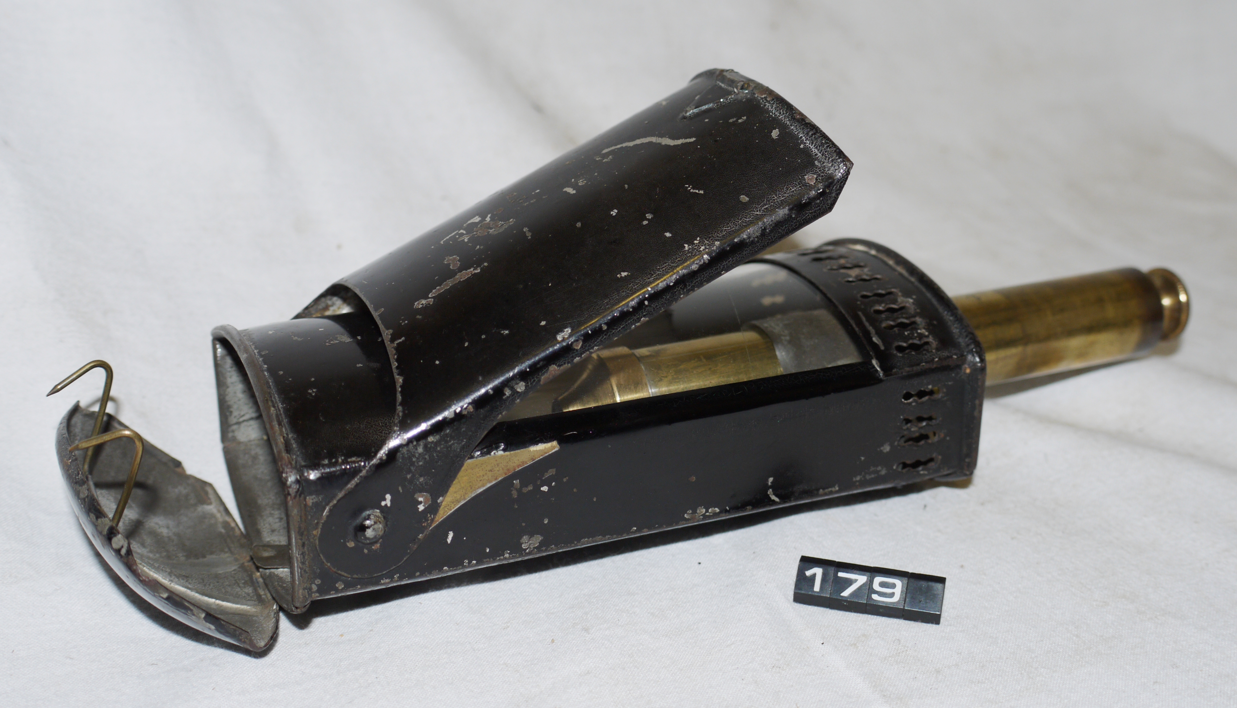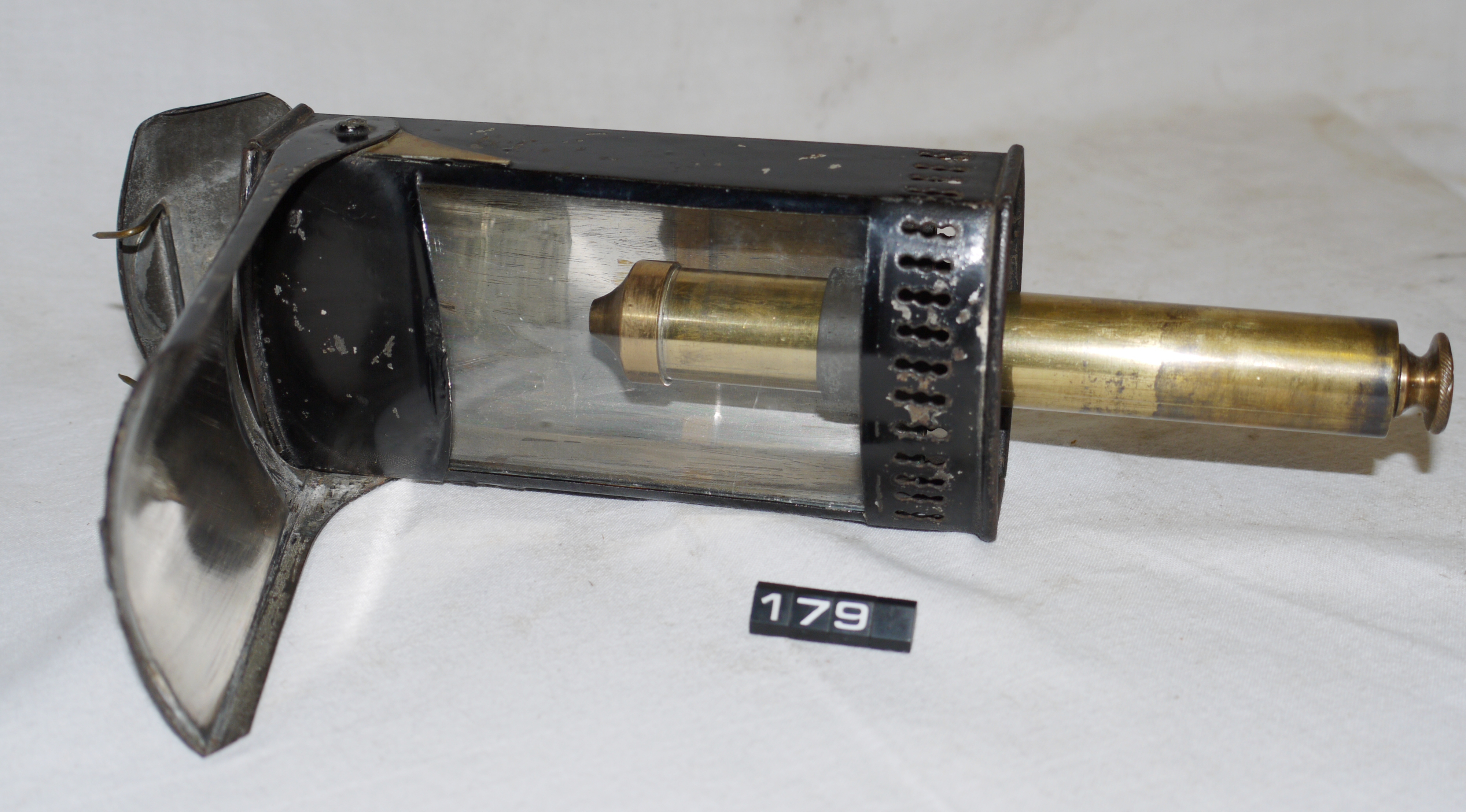 - DescriptionPortable candle lamp for reading in a railway carriage; retractable spring-loaded candle holder in a japanned steel housing with a clear glass window; hinged reflector; top of housing opens to allow two hooks to be used to hang the lamp from a railway carriage seat; match (vesta) holder & striker panel in the base; Norris collection.