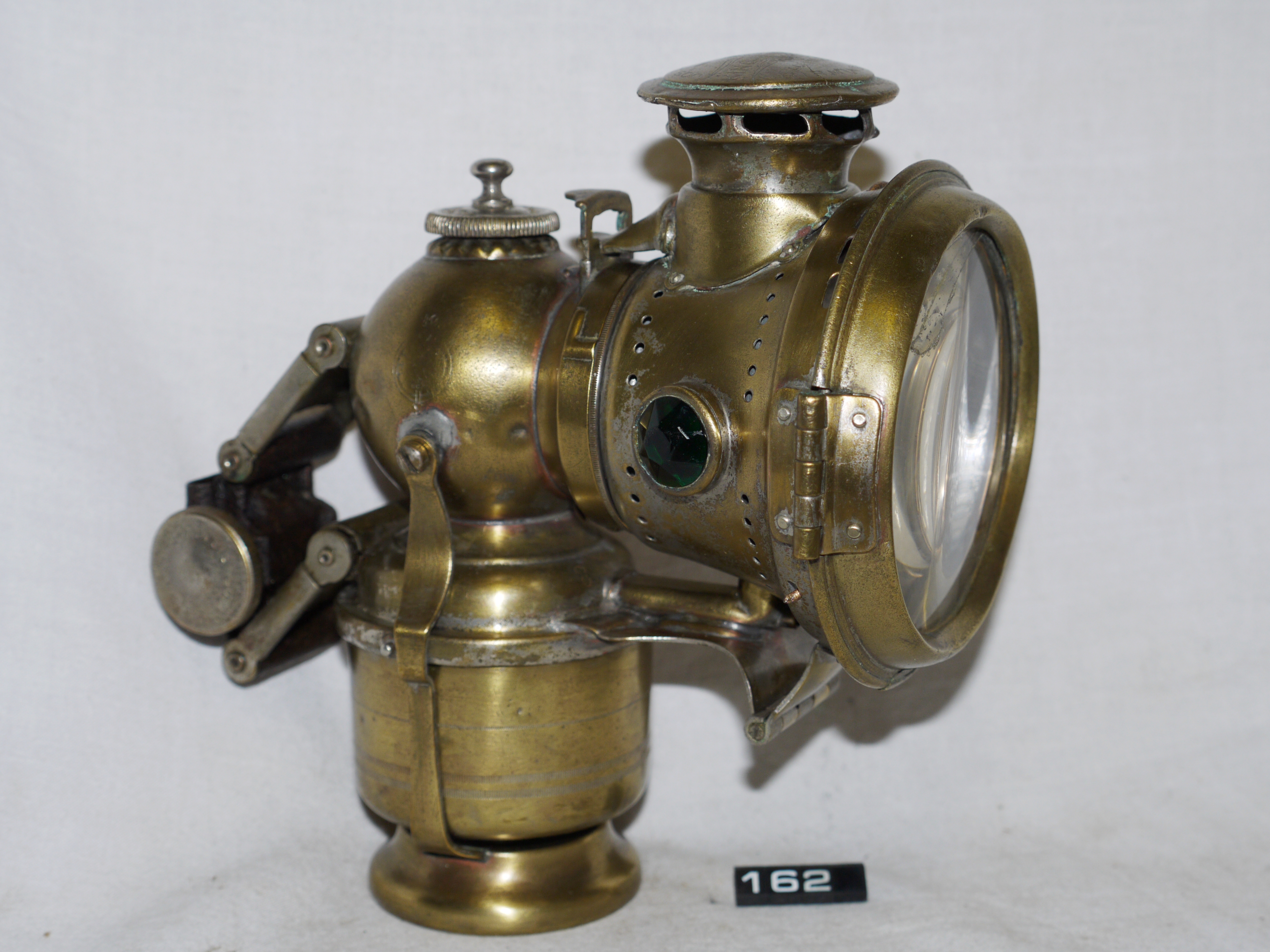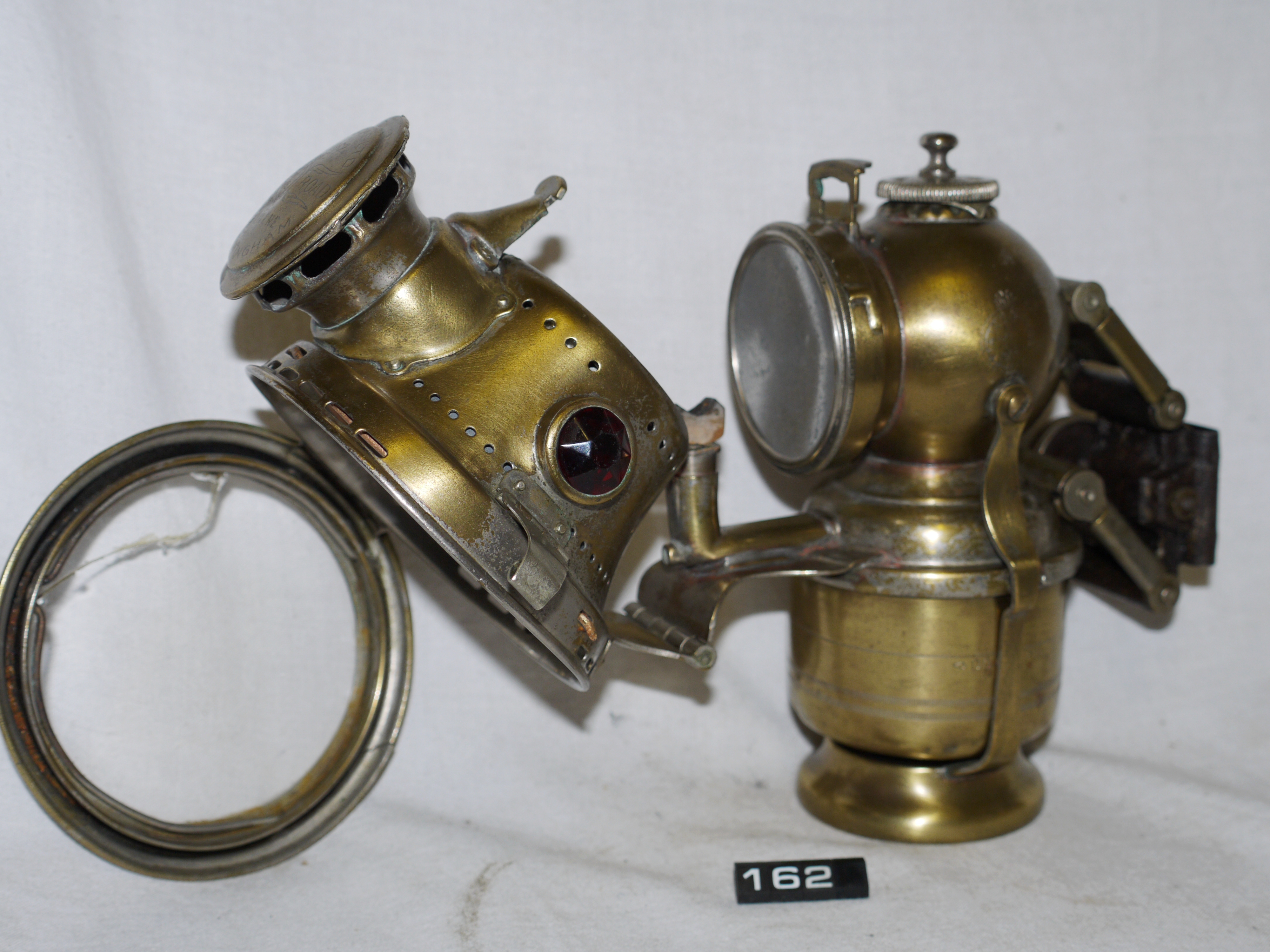 Gas lamp for a bicycle; Lucas No.262 'King of the Road' acetylene front cycle lamp; hinged burner housing with hinged clear glass lens; faceted green glass lens on right side of body, red on the left; polished aluminium reflector; much of the nickel plating has worn away, the lens has cracked & the lens carrier split; minor denting on water reservoir & chimney; Norris collection.