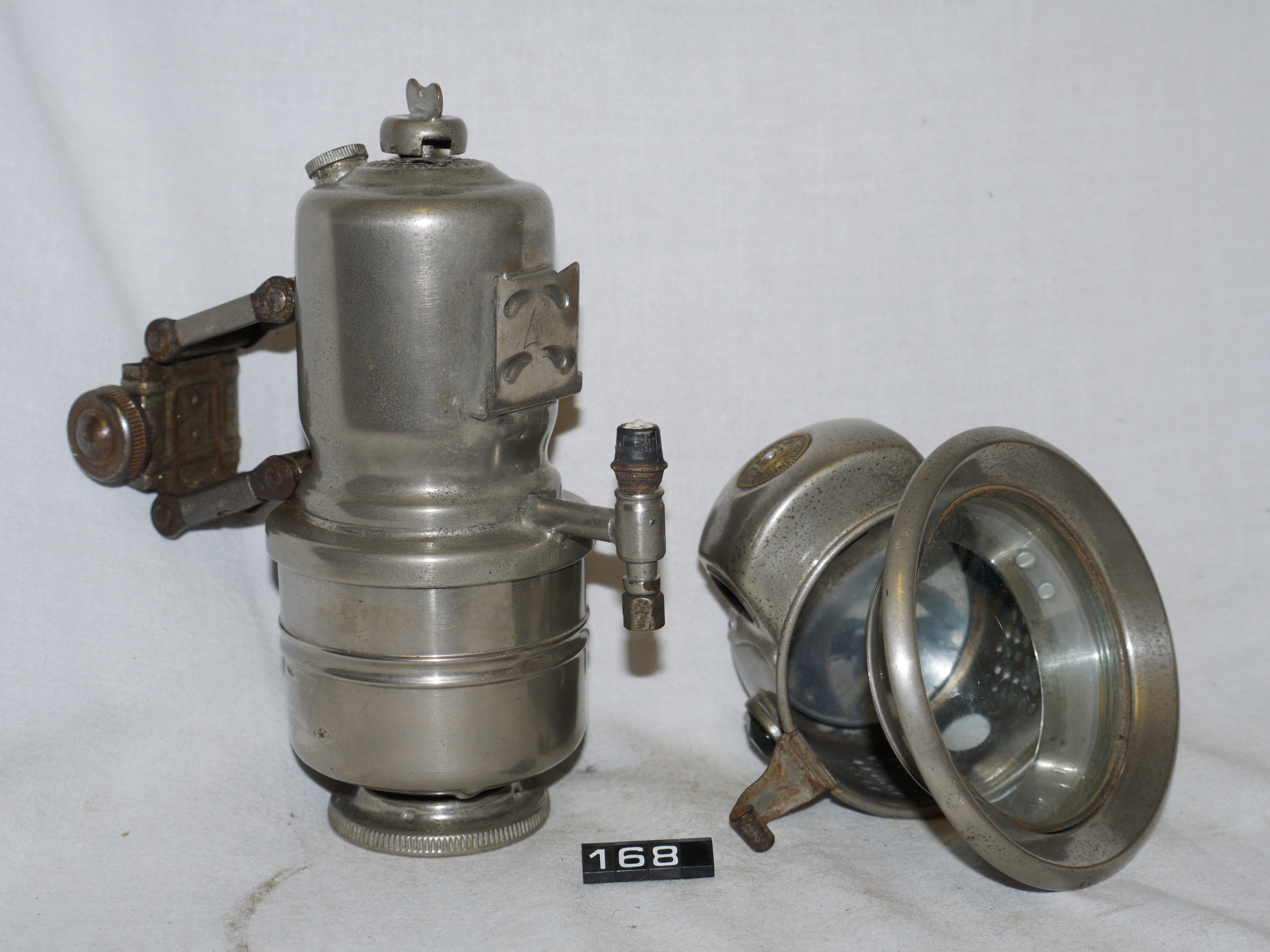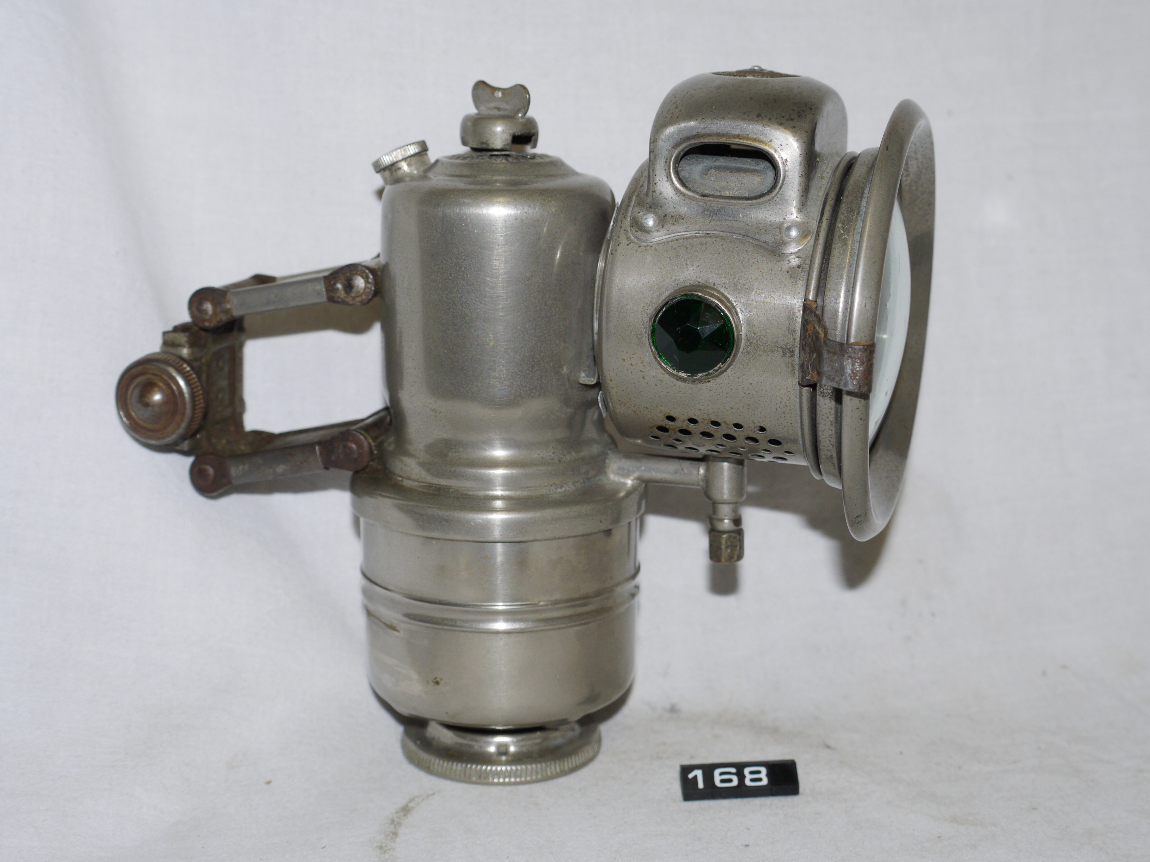 - DescriptionGas lamp for a bicycle; Powell & Hamner 'THE REVENGE' front cycle lamp; nickel-plated brass body with 'slide on' burner housing; clear glass hinged front lens; faceted red & green glass lens on the sides, aluminium reflector; acetylene burner; Norris collection.