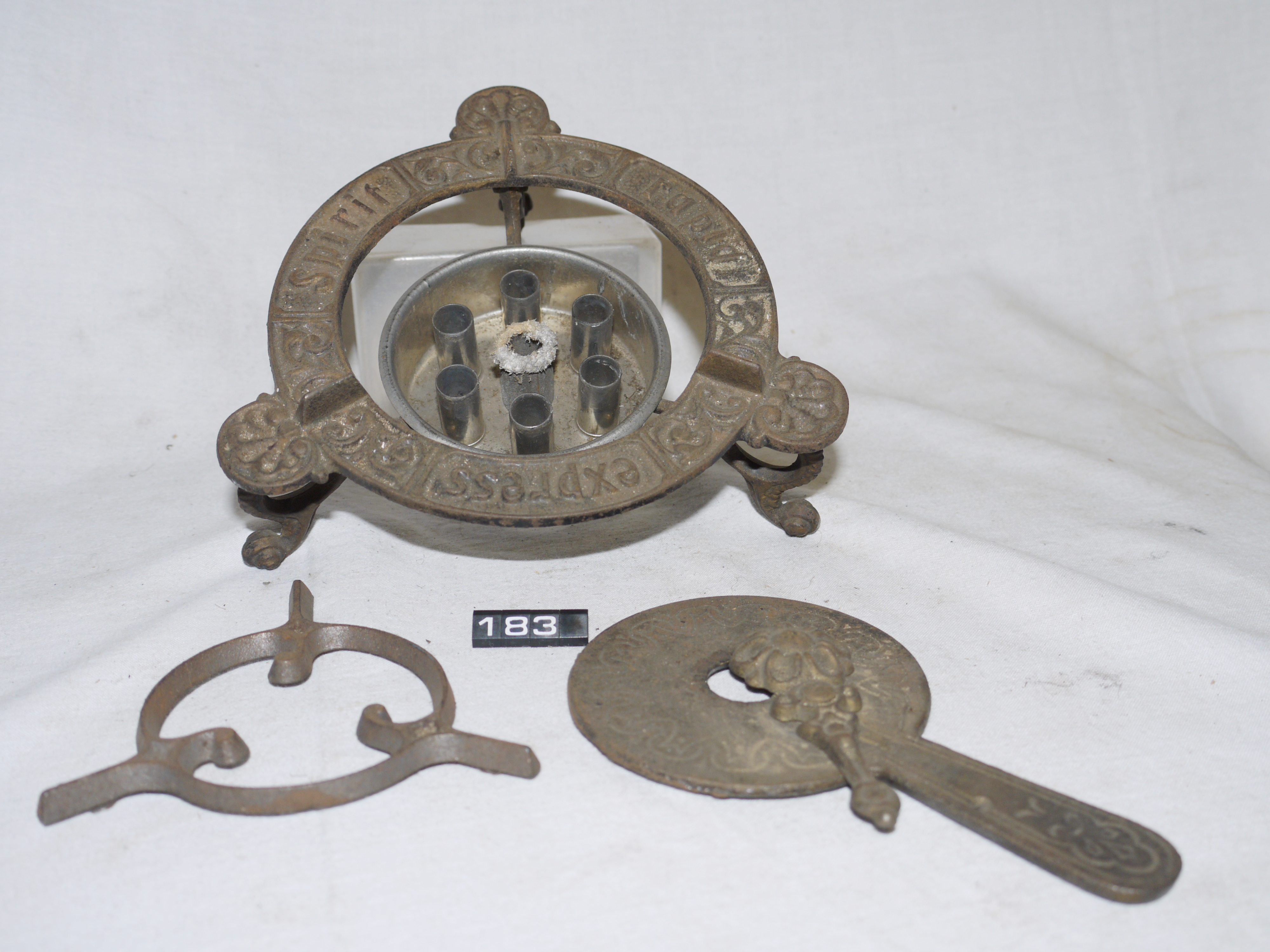 - DescriptionTabletop spirit stove; 'RAPID EXPRESS'; cast iron stand, burner cover & pan support; tinplate burner; may be of American manufacture; Norris collection.