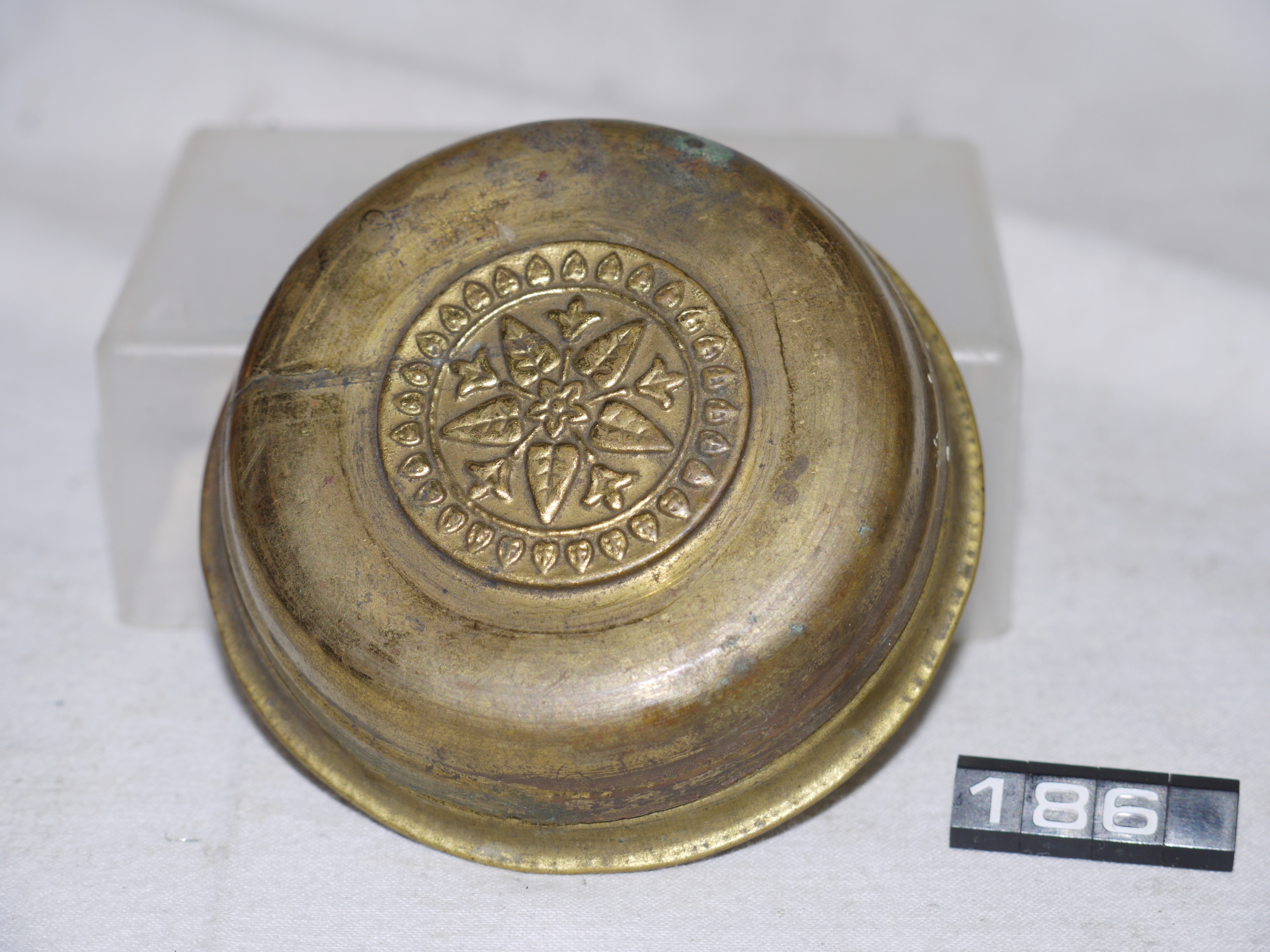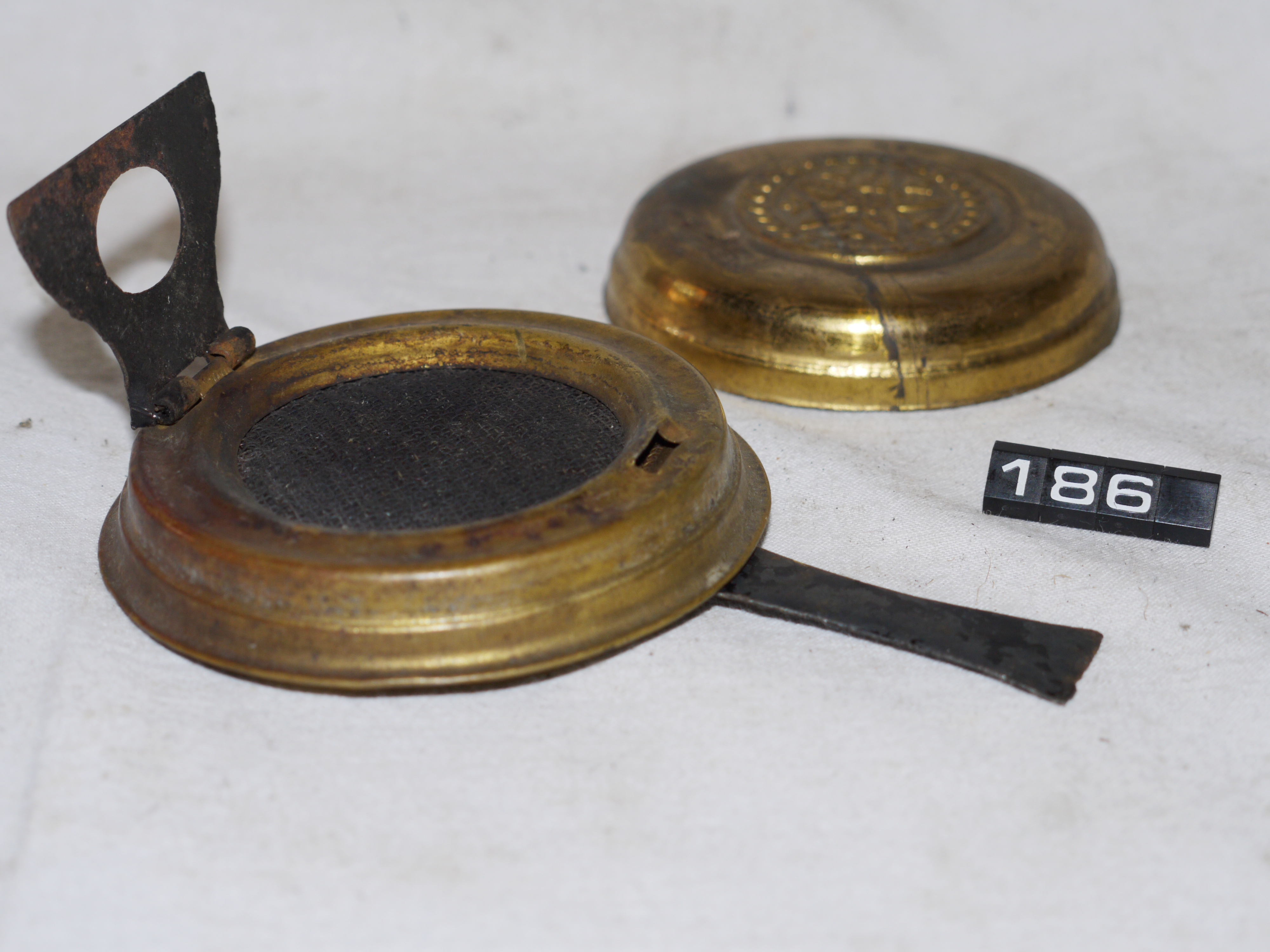 Tabletop spirit stove; pressed brass cover; tinplate handle & pan supports (one missing); Norris collection.