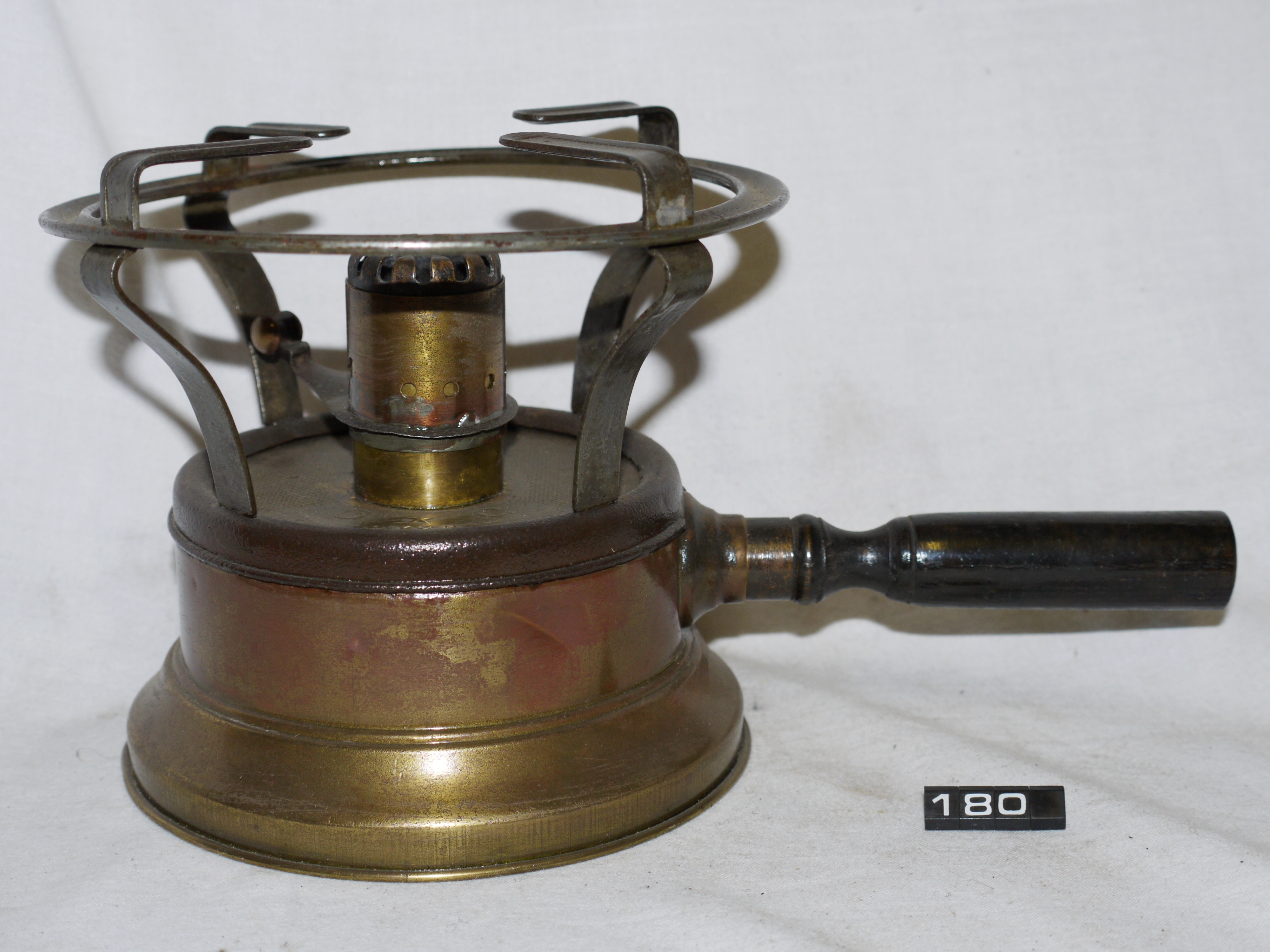 - DescriptionTabletop spirit stove (or 'dumb waiter'); brass reservoir/fount, steel burner & pan supports; threaded filler cap to fount; turned wooden handle; Norris collection.
