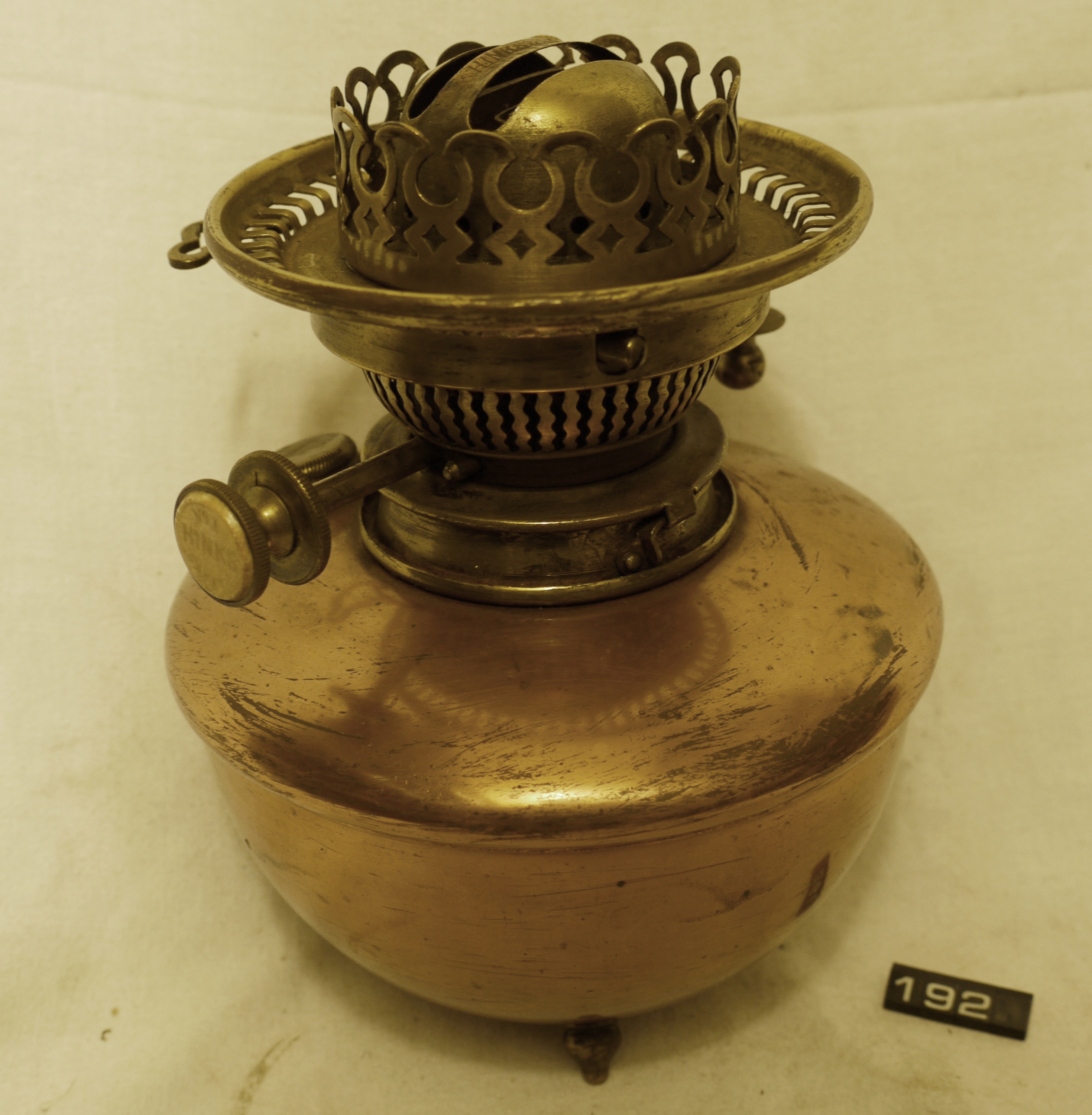 - DescriptionOil lamp burner; Hinks patent No.1 duplex burner, brass; copper fount, with brass collar, filler cap & three feet; brass duplex burner with lever lift & lever-operated snuffers; 4½” gallery; Norris collection.
