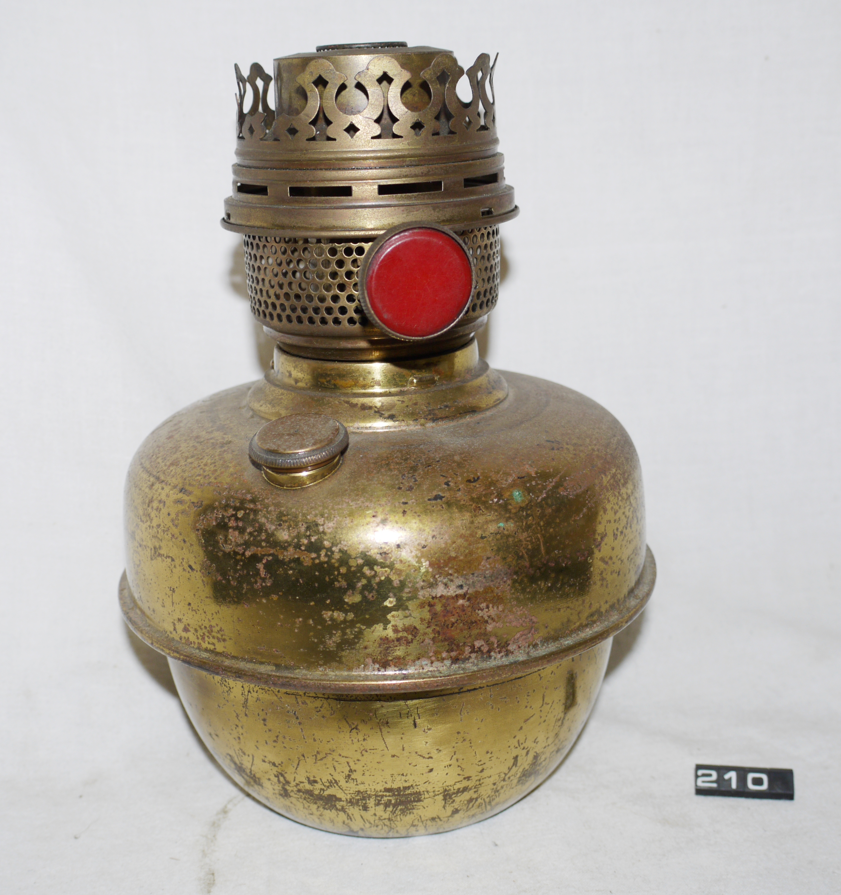 - DescriptionOil lamp burner; 'FAMOS' 120cp centre draught lamp burner with 2.6" sconce (some damage); plated brass font, threaded filler cap; wick raiser knob has a red (plastic?) insert; no wick fitted; Norris collection.