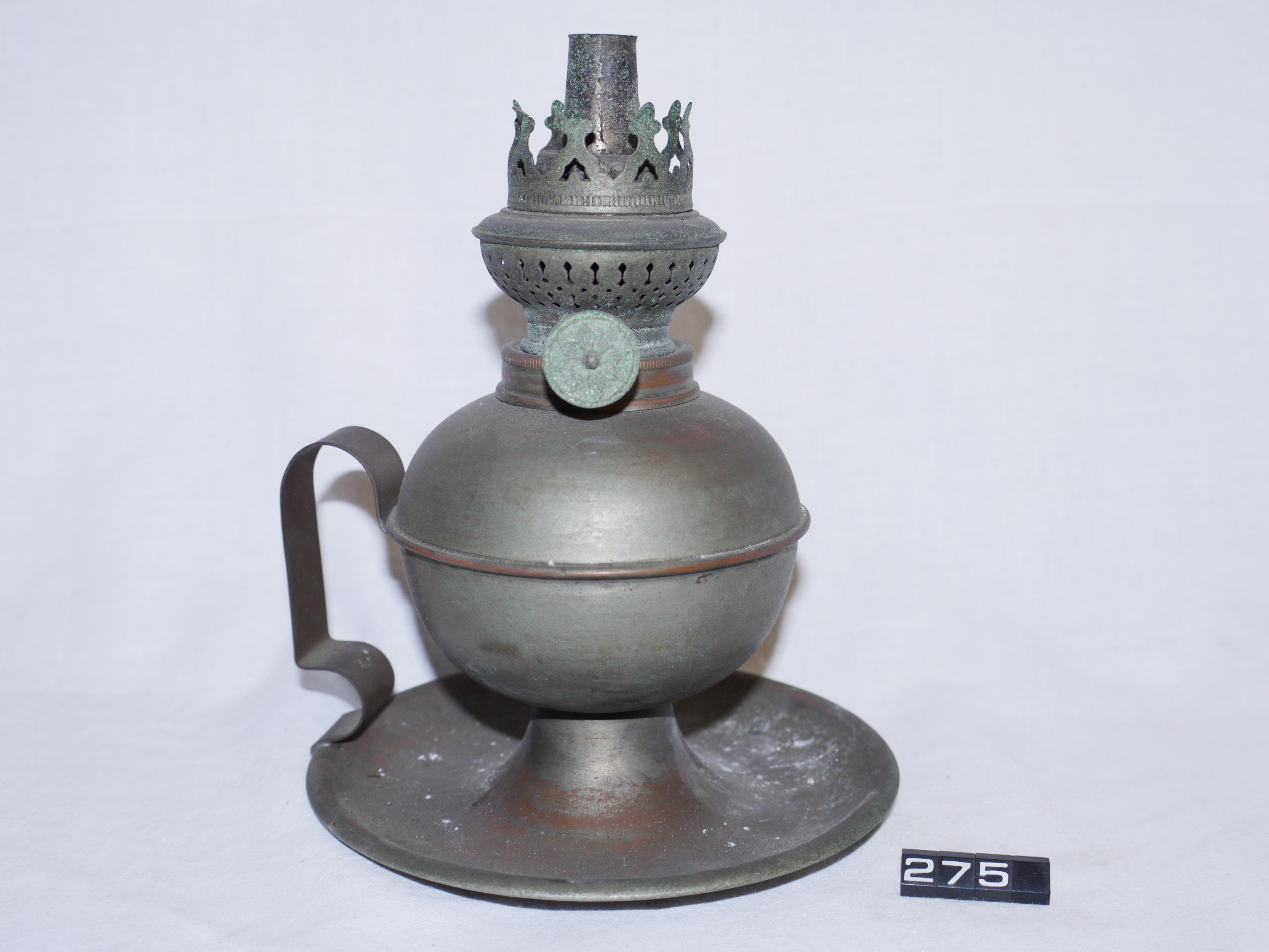- DescriptionOil lamp; plated tinplate hand lamp; bulbous reservoir set on a flattened circular base; tinplate centre draught burner; Norris collection.