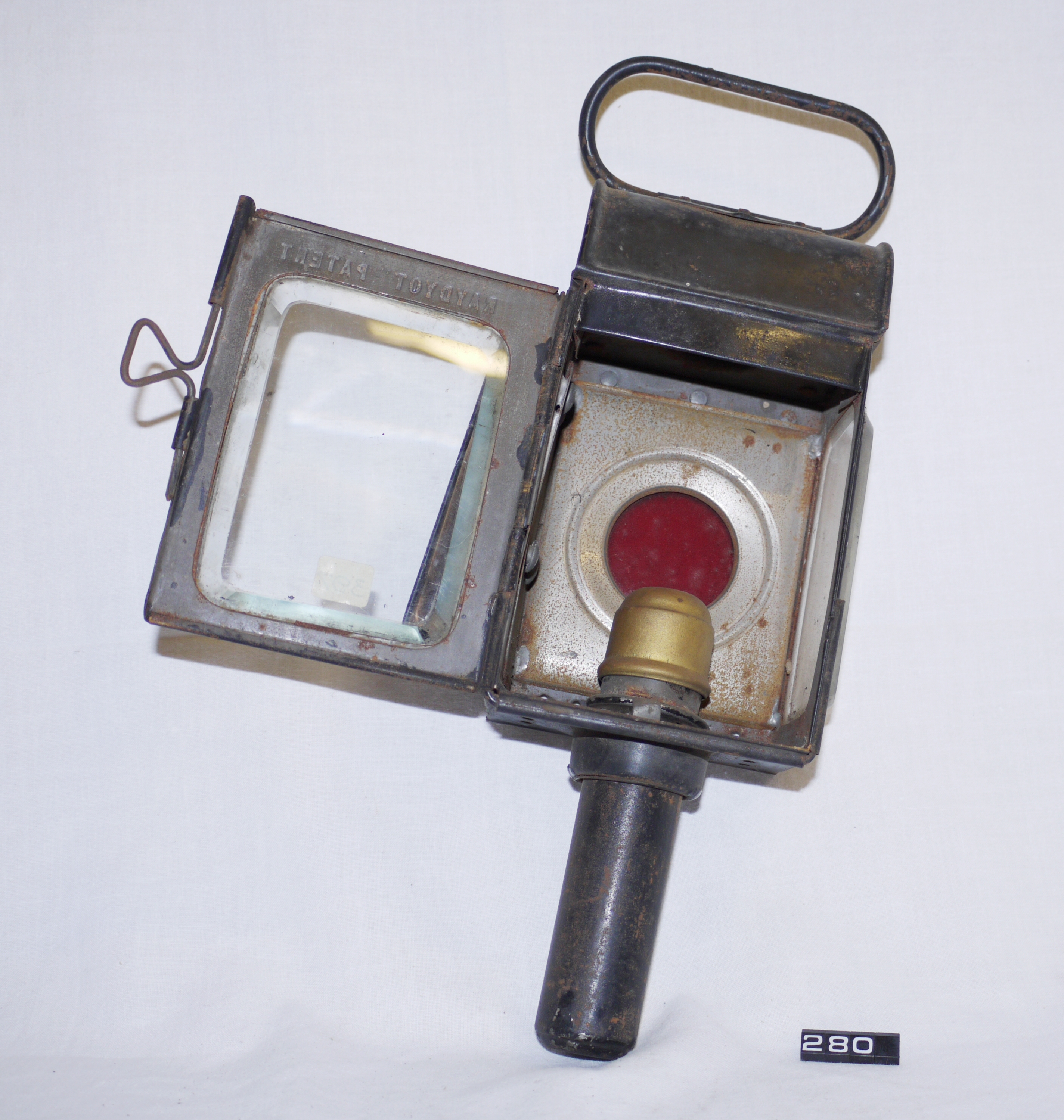 - DescriptionCarriage lamp; candle lamp for a carriage, cart of horse-drawn van; japanned tinplate body, hinged door at the front; colourless glass lens at front & left-hand side, rounded ruby glass to the rear; mounting clip on right-hand side; carrying handle on the top; spring-loaded candle holder inserted up through the base into the lamp body; Norris collection.