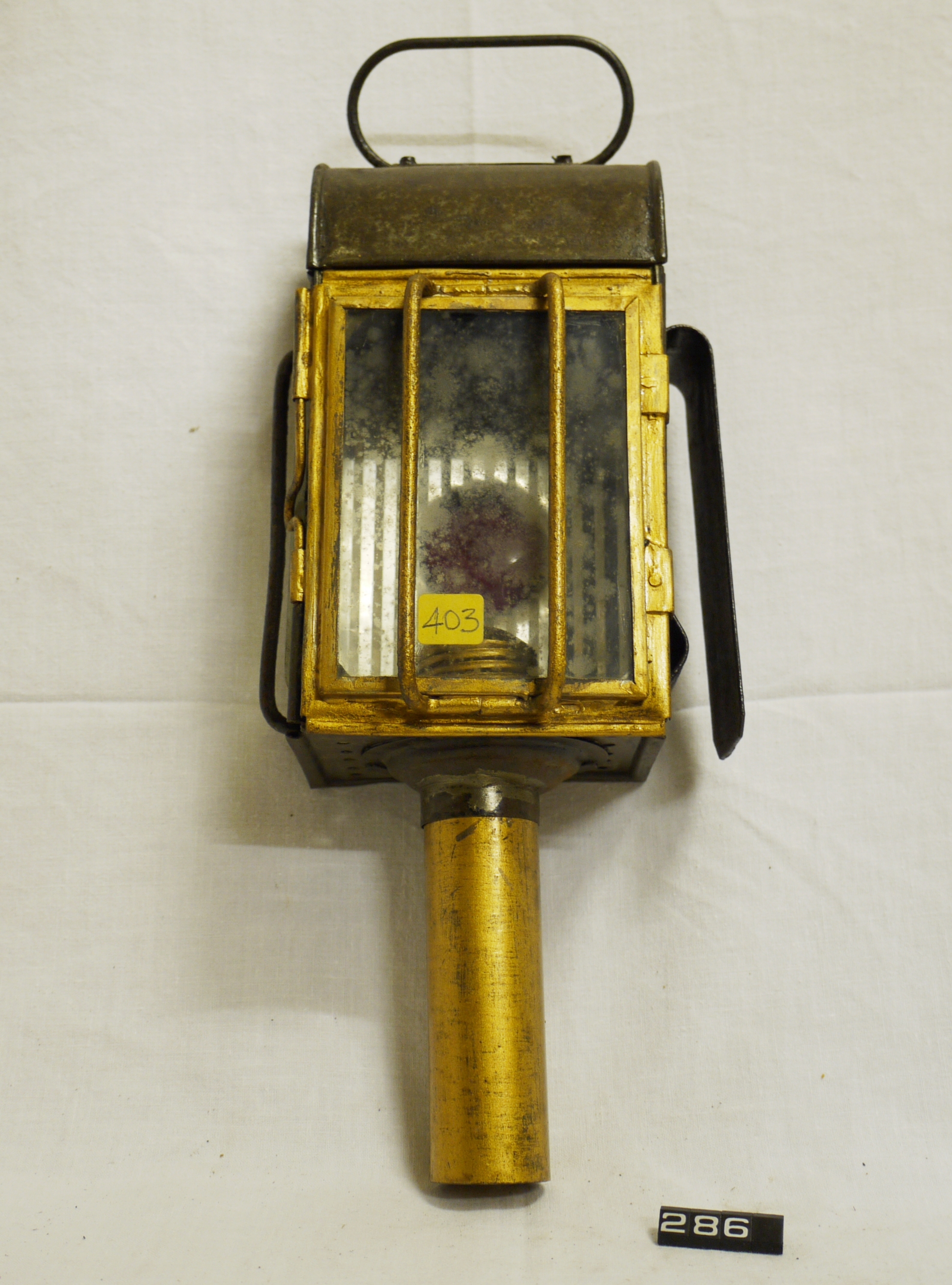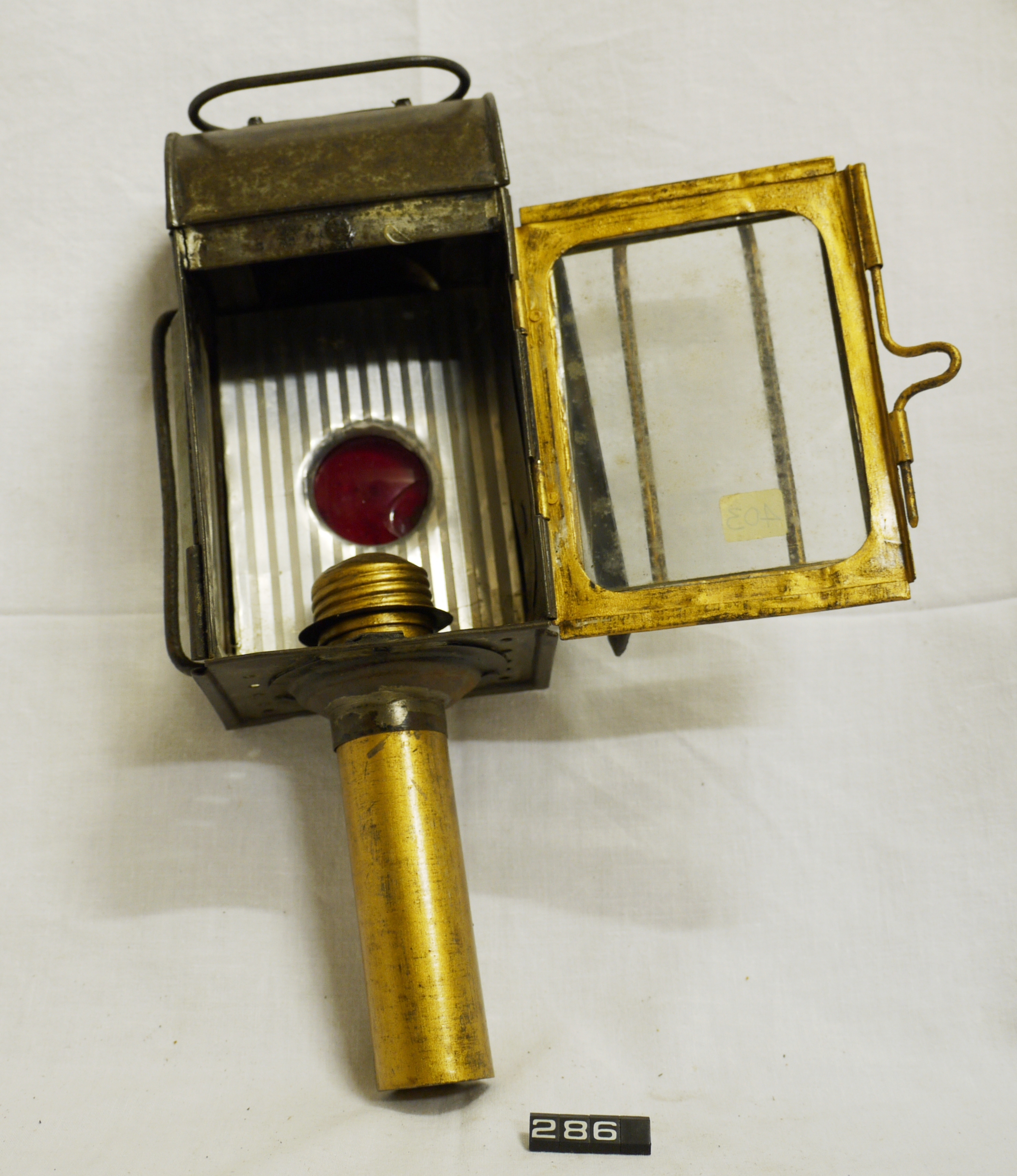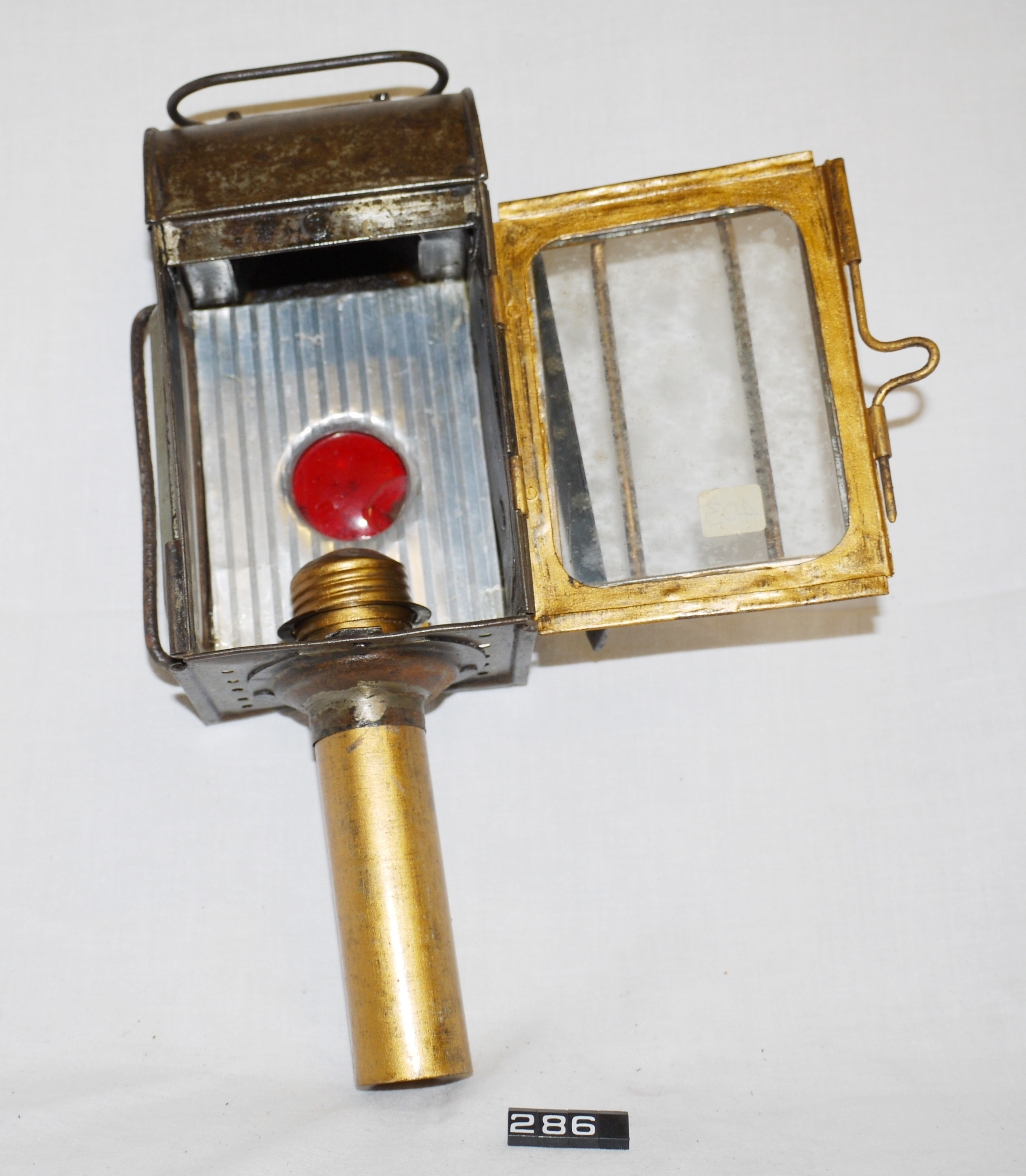 Carriage lamp; candle lamp for a carriage, cart or horse-drawn van; tinplate body, hinged door at the front with thin protecting bars; rectangular colourless glass lens to the front & right, circular red lens to the rear; mounting clip on left-hand side; carrying handle on top; spring-loaded candle holder inserted up through the base into the lamp body; broken parts inside the lamp, some restoration work has been done; Norris collection.