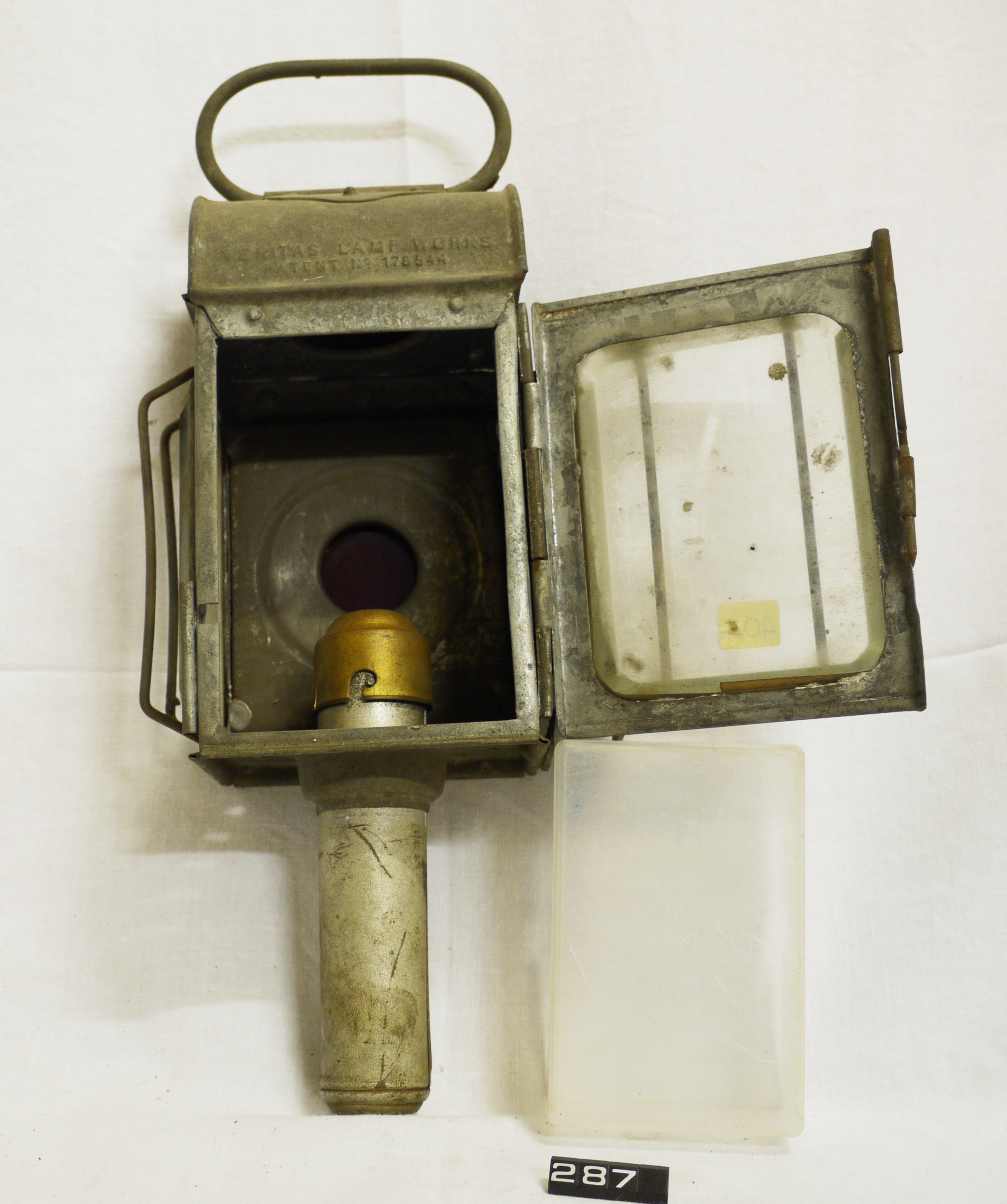 Carriage lamp; candle lamp for a carriage, cart or horse-drawn van; tinplate body, galvanised; hinged door at the front with thin protecting bars; rectangular colourless glass lens to the front & right, circular red lens to the rear; mounting clip on left-hand side; carrying handle on top; spring-loaded candle holder inserted up through the base into the lamp body; Norris collection.