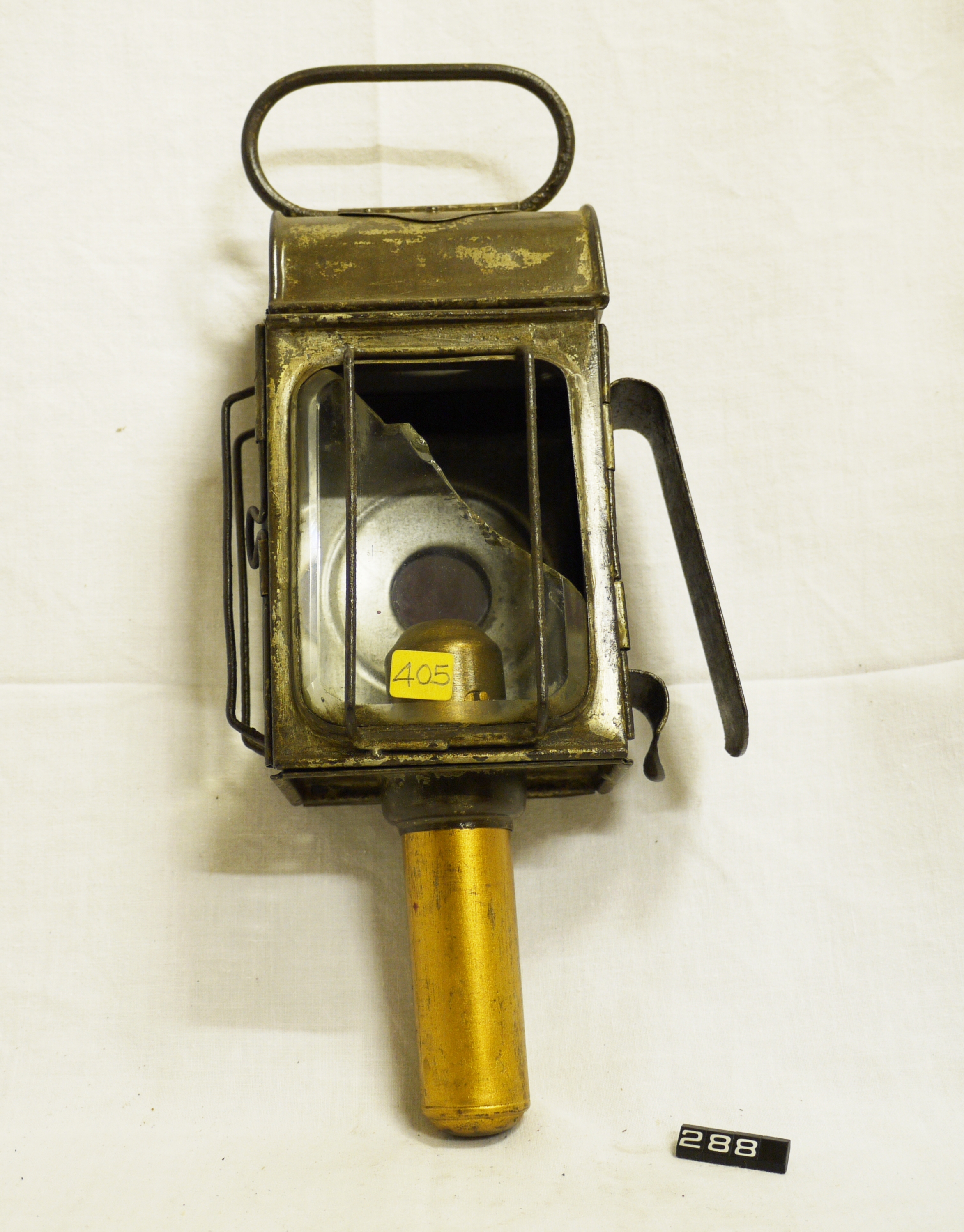 Carriage lamp; candle lamp for a carriage, cart or horse-drawn van; tinplate body, galvanised; hinged door at the front with thin protecting bars; rectangular colourless glass lens to the front (broken) & right, circular red lens to the rear; mounting clip on left-hand side; carrying handle on top; spring-loaded candle holder inserted up through the base into the lamp body; Norris collection.