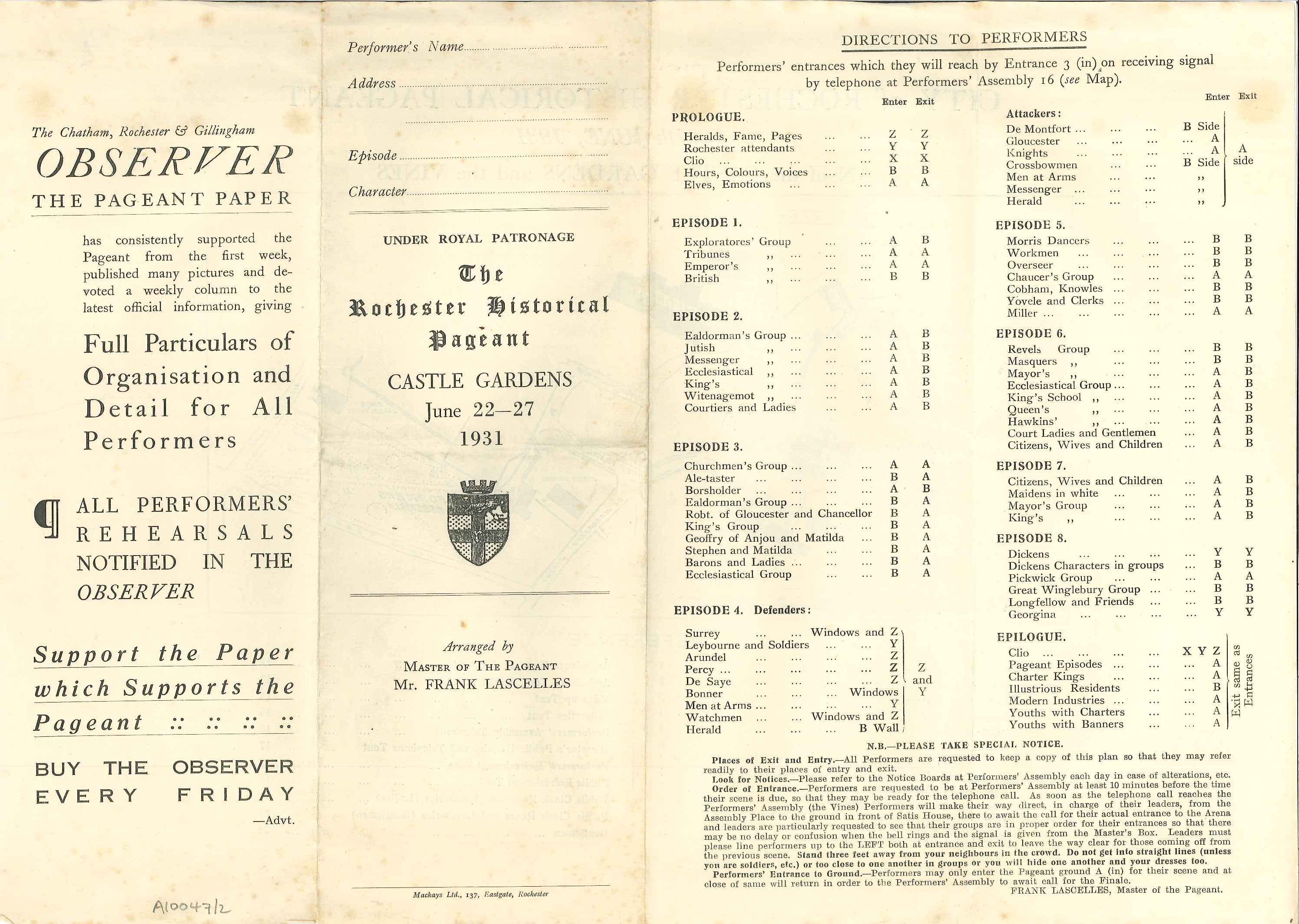 - DescriptionLeaflet with details for performers in the Rochester Pageant of 1931; has a plan of the route for performers to take from The Vines to the castle with performers directions. Formerly owned by Amy Butler.