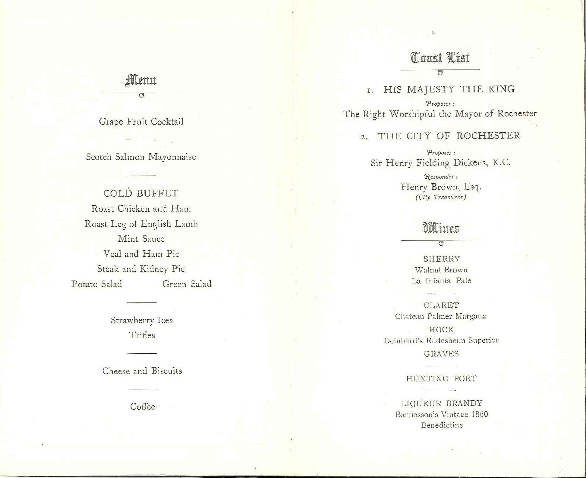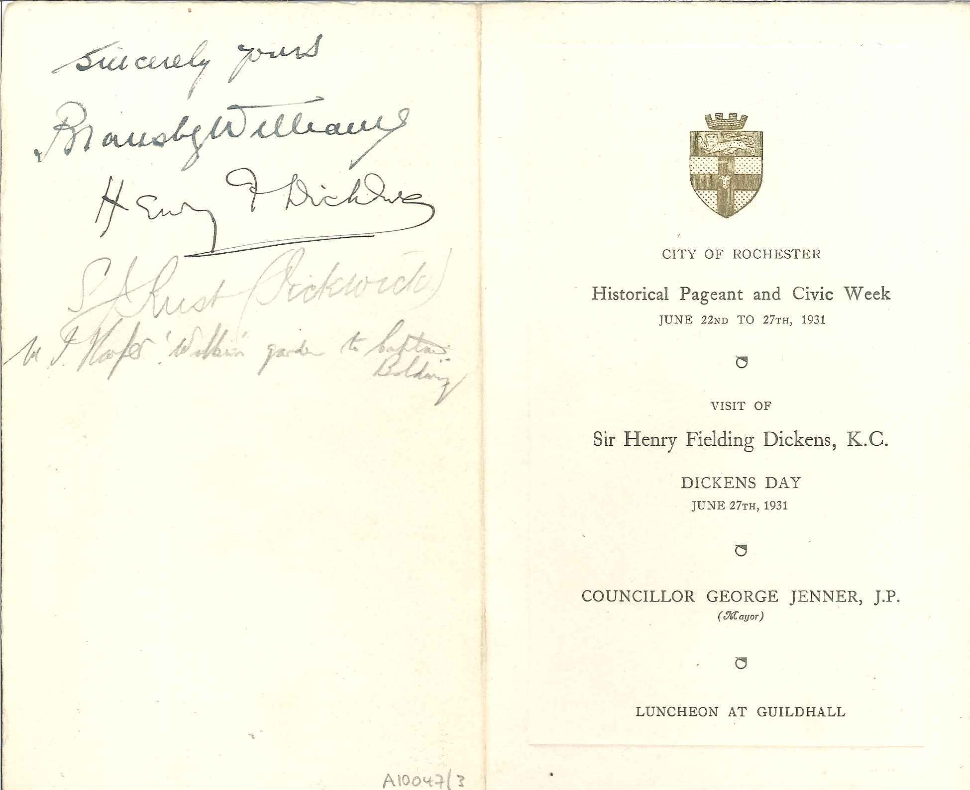 - DescriptionLuncheon menu for 27th June at the Guildhall during the Rochester Pageant of 1931; autographs on the back including Henry Fielding Dickens who was guest of honour that day. Formerly owned by Amy Butler.