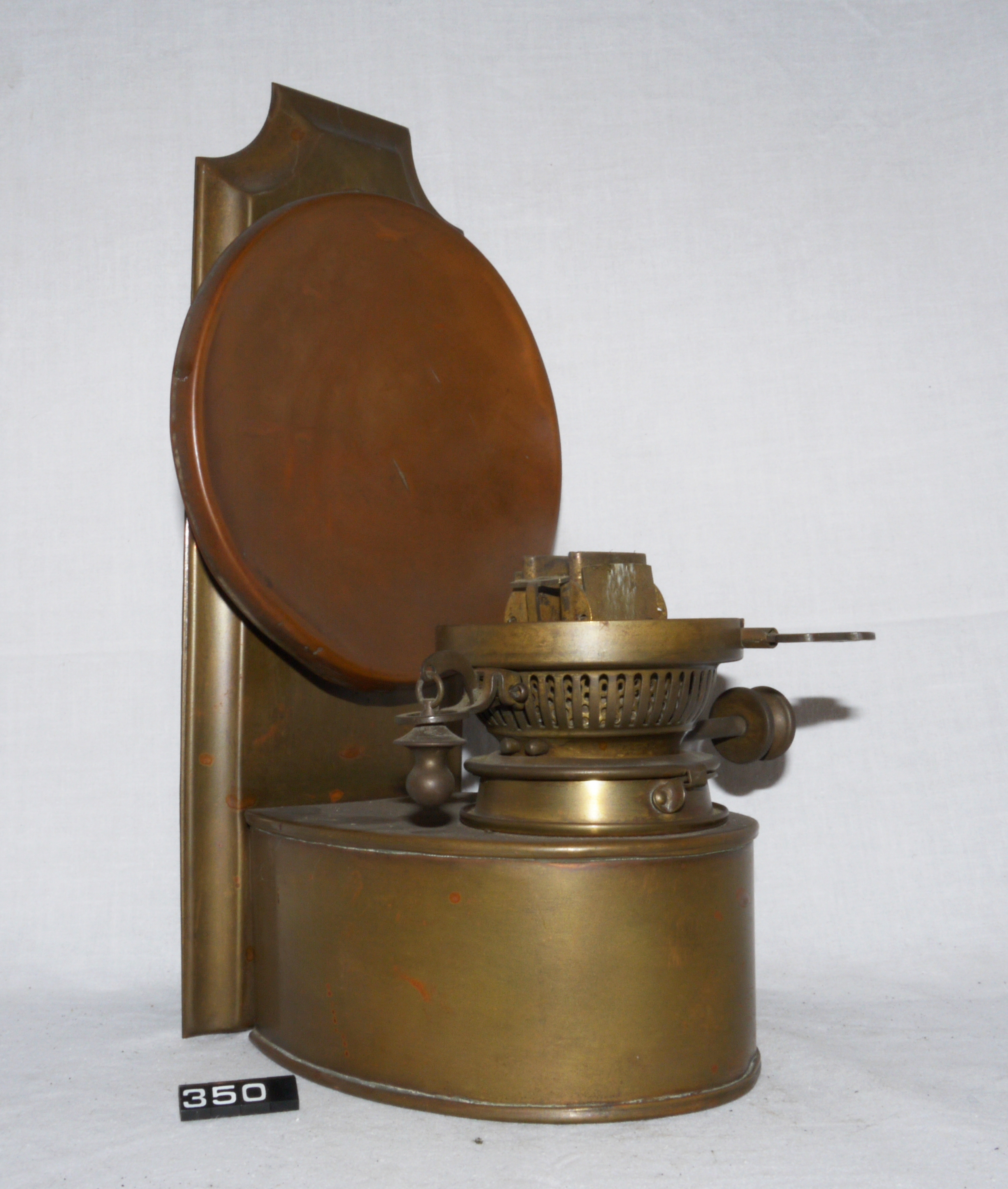 - DescriptionOil lamp; wall back lamp; designed to be either wall-mounted or freestanding; made from heavy guage brass plate & fitted with a circular copper reflector (originally silvered); Hinks No.2 burner with snuffers & raising mechanism; no wicks fitted & top cover of the burner is missing; Norris collection.