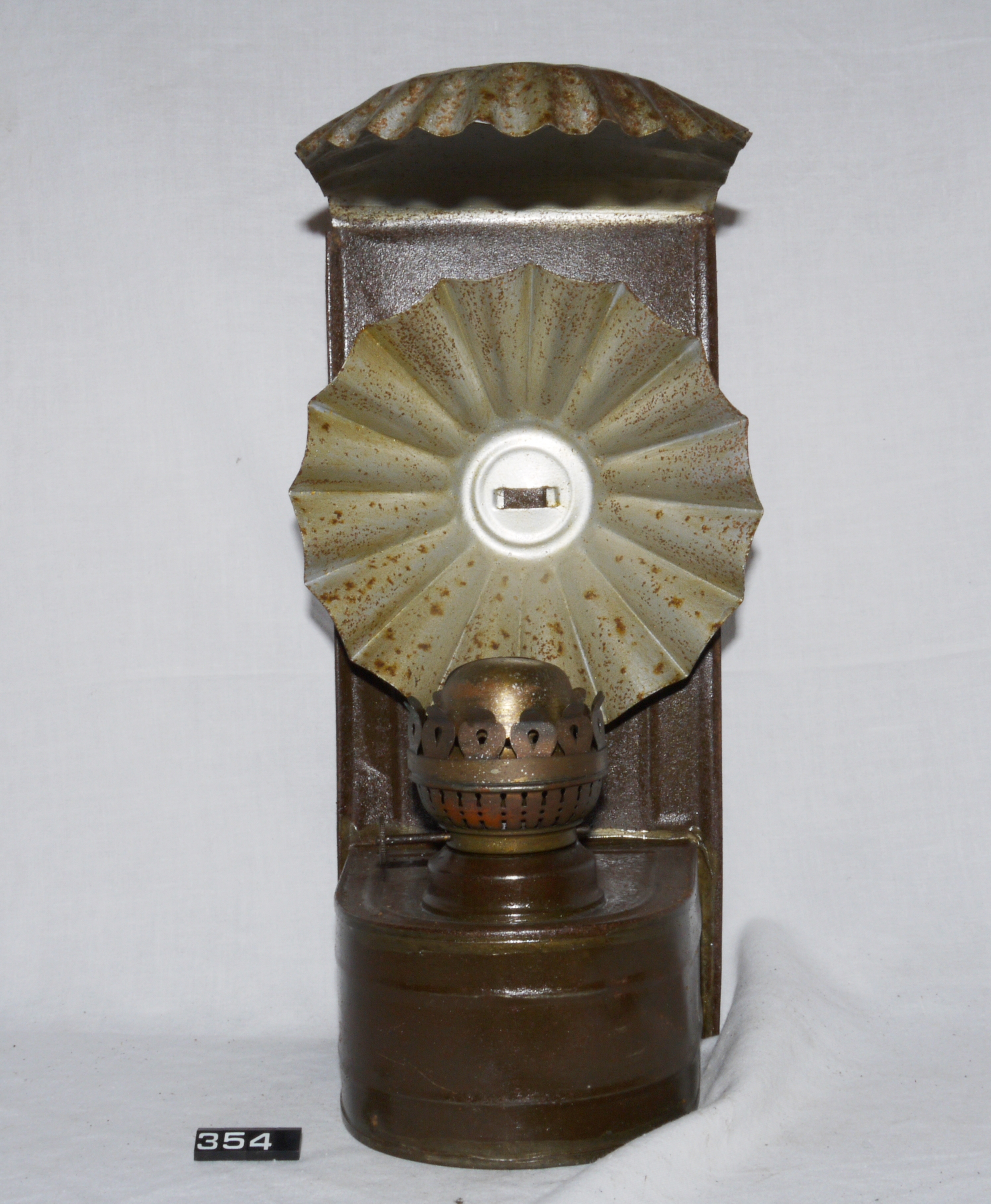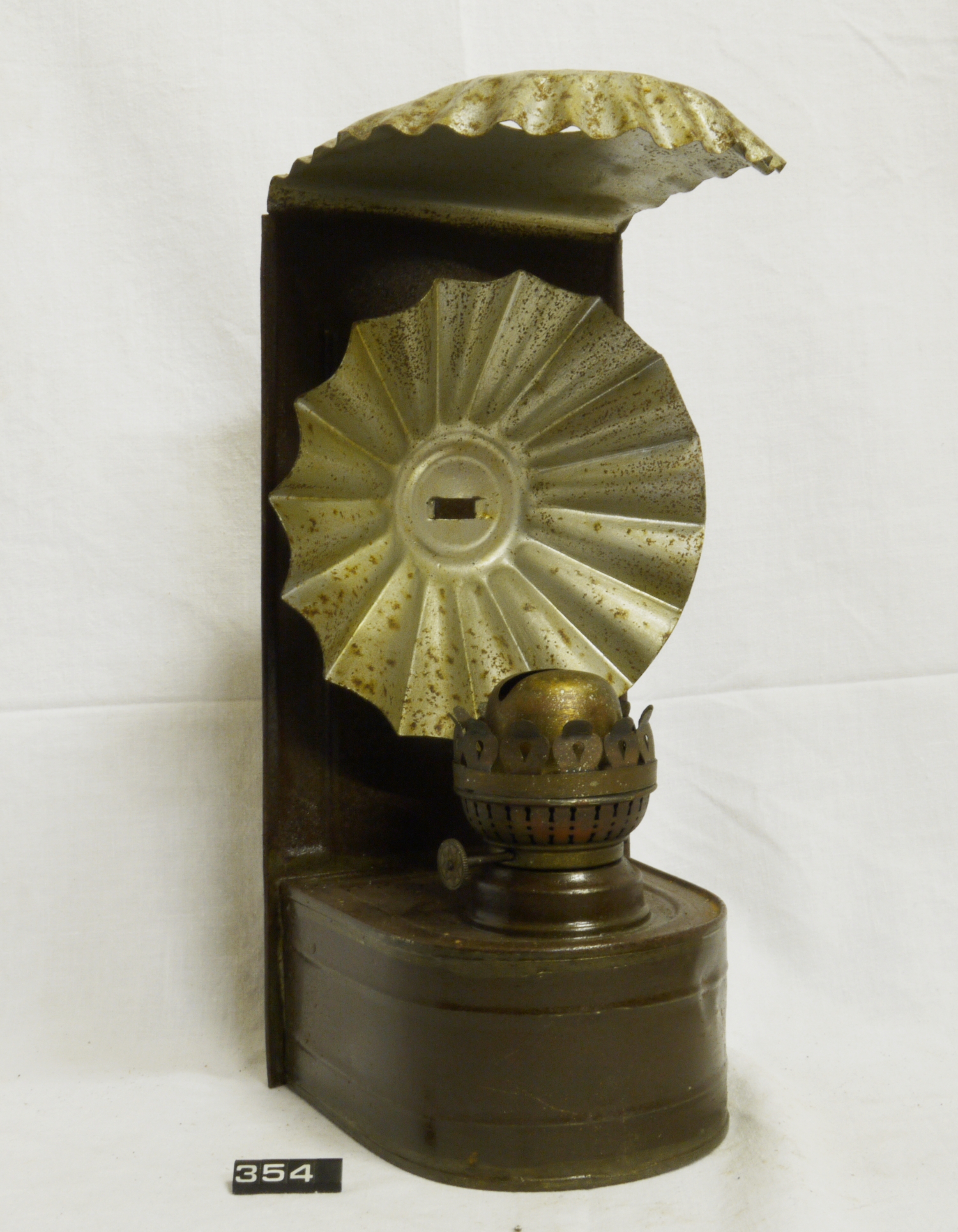 - DescriptionOil lamp; wall back lamp; designed to be either wall-mounted or freestanding; made from tinplate & fitted with two fluted reflectors (one behind & one above the burner); fitted with a brass 1" slip burner; no wick fitted; 8-pointed star design on wick raiser knob; Norris collection.