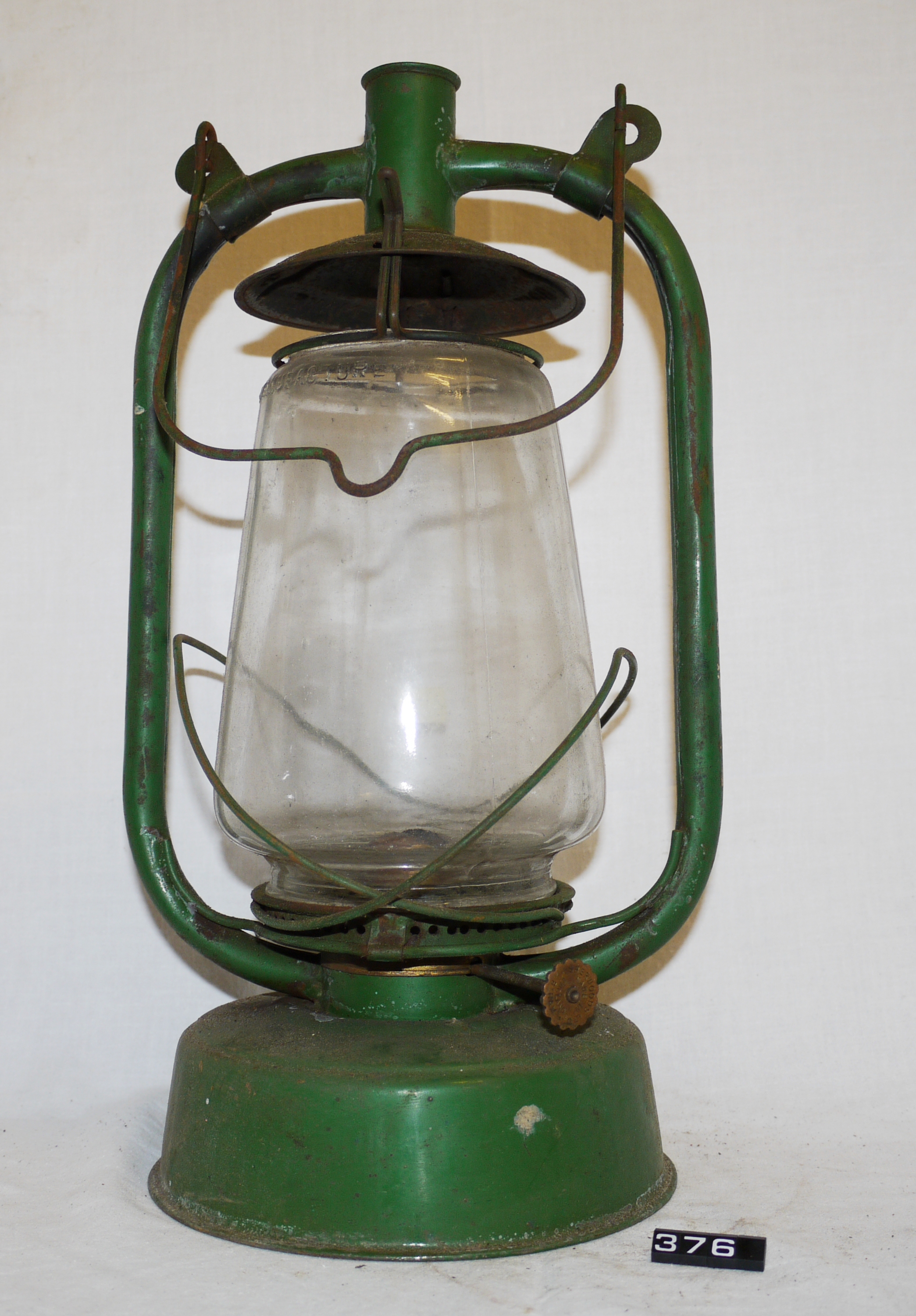 - DescriptionOil lamp; storm/hurricane lantern; green-painted tinplate lantern; handle for carrying/suspension; colourless glass chimney encloses a brass ⅝" flat wick burner, no wick fitted; screw-in filler cap on reservoir; Norris collection.