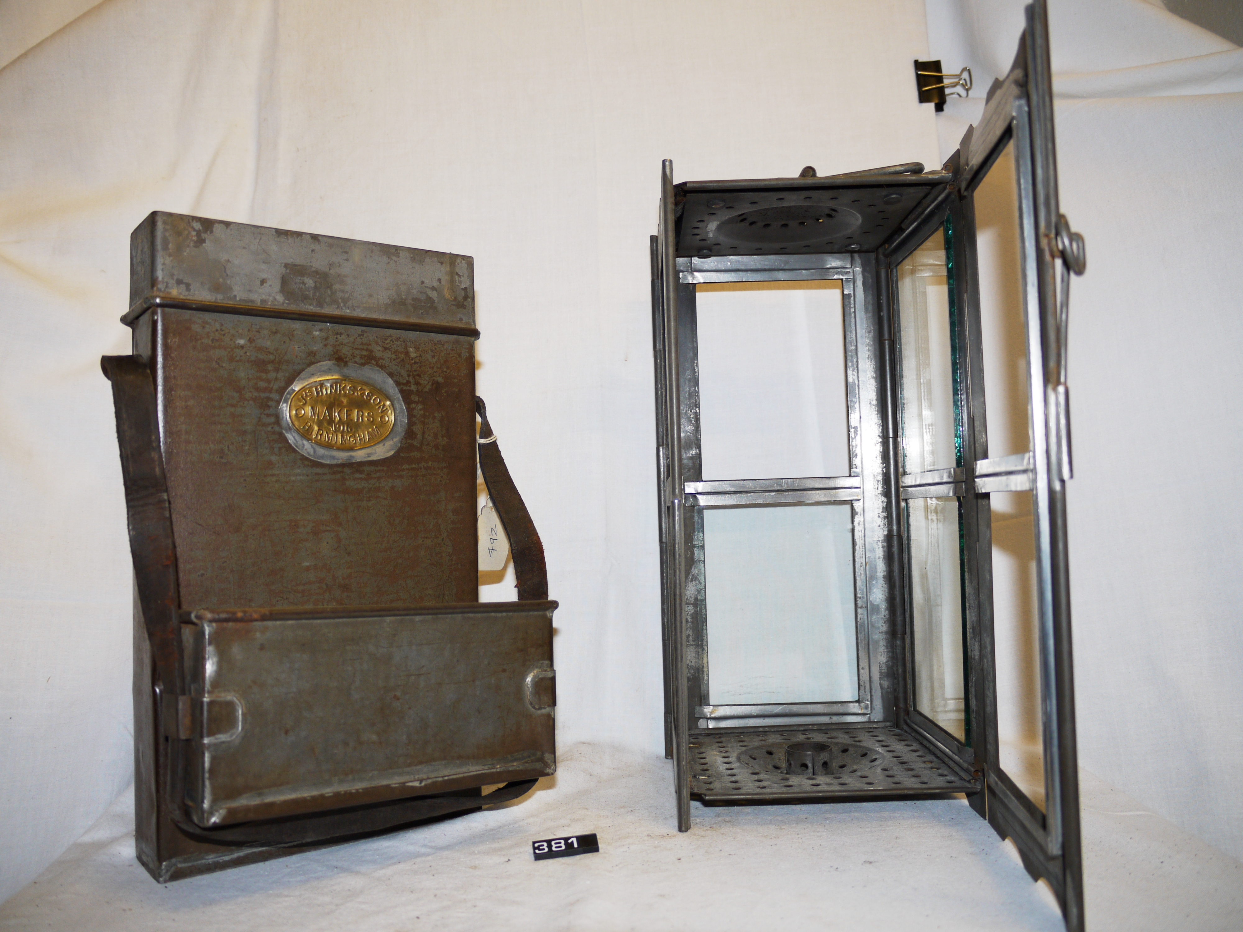 - DescriptionTrench candle lantern; folding lantern in two-part tinplate case (bottom missing) with leather carrying strap; hinged door to the front; hinged carrying/handling handle at the top; colourless glass panes (four are missing); burns candles; made by Hinks & Son of Birmingham in 1916; Norris collection.