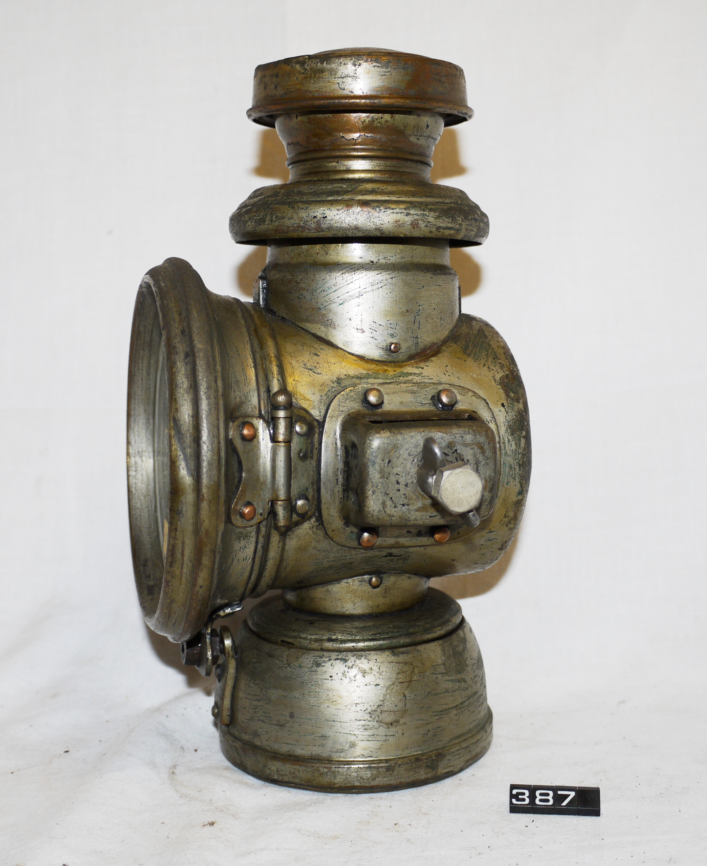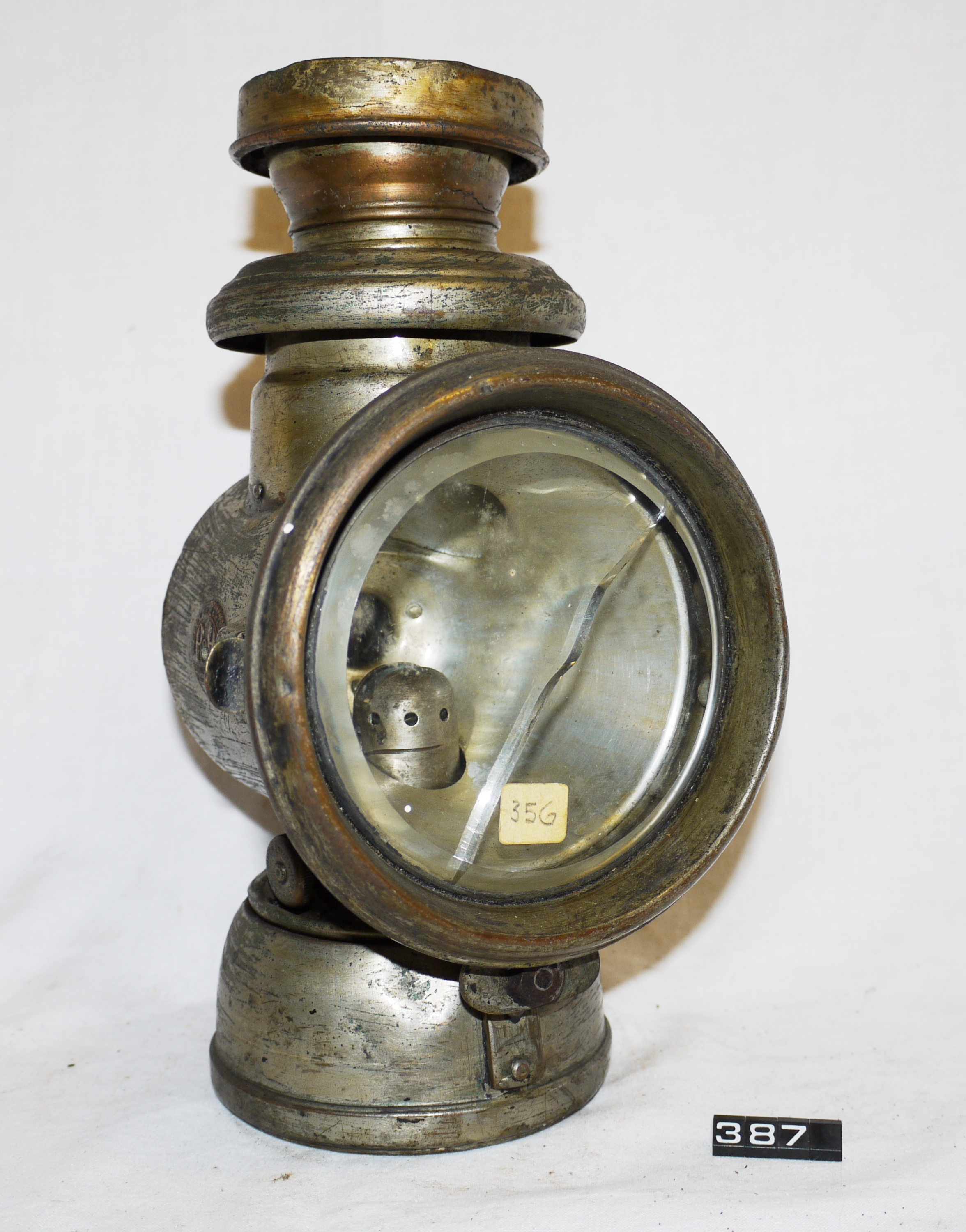 Oil lamp; veteran car lamp; Powell & Hamner car side lamp; casing & reservoir made from brass & tinplate, reflector from polished aluminium; bevelled circular clear glass front lens (cracked), in hinged copper bezel; small circular ruby lens to the rear; bracket on side of body; tinplate ⅜" flat wick burner (no wick fitted); petrol burner; internal rust on chimney top; carrying handle is missing; Norris collection.