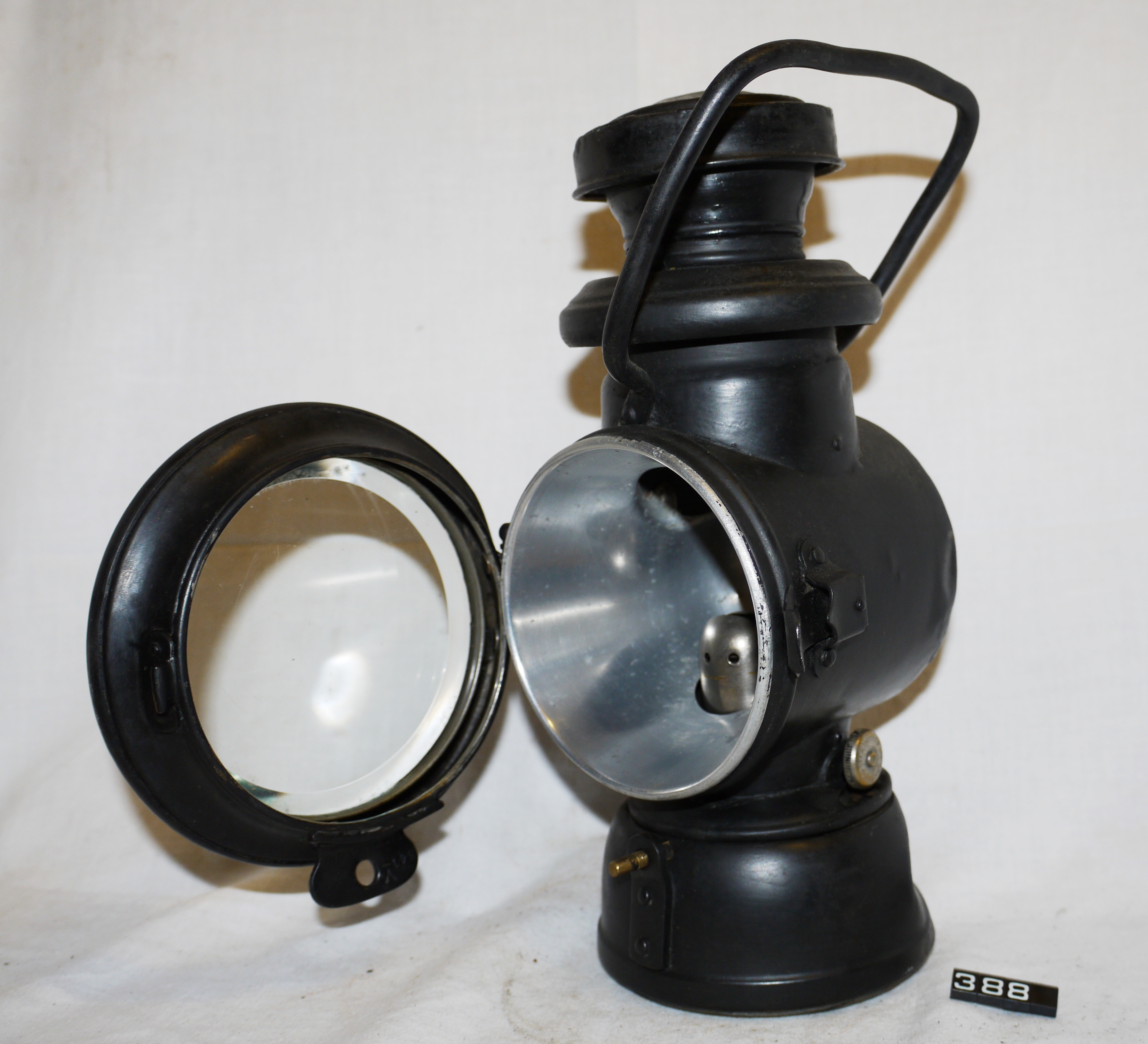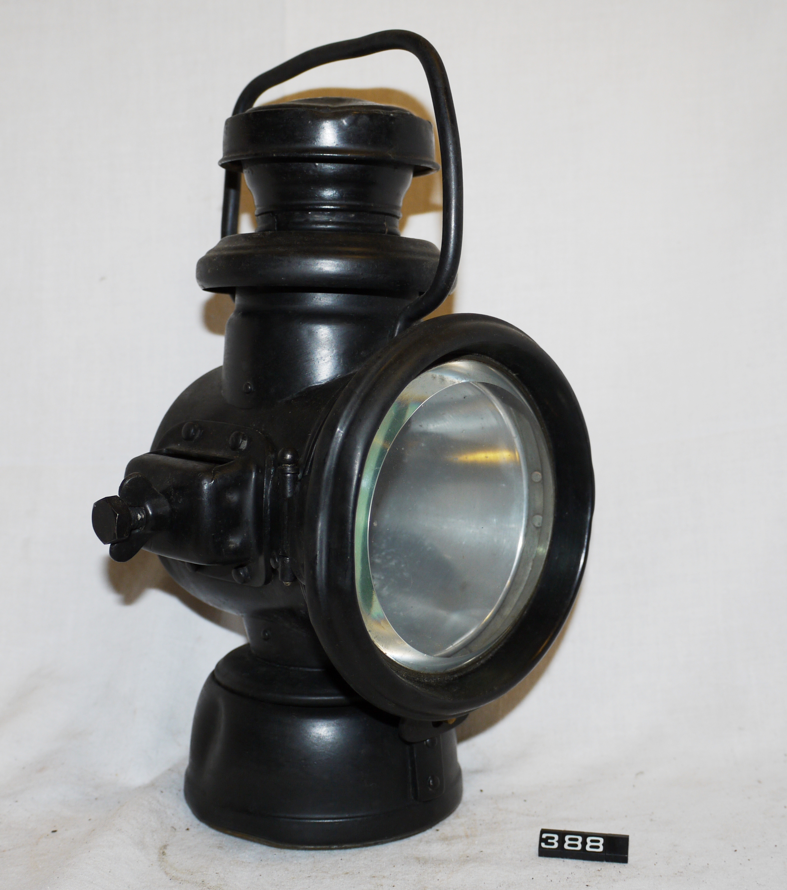 Oil lamp; veteran car lamp; Powell & Hamner car side lamp; casing & reservoir made from brass & tinplate, reflector from polished aluminium; bevelled circular clear glass front lens, hinged bezel; small circular ruby lens to the rear; bracket on side of body; nickel-plated ⅜" flat wick burner (no wick fitted); petrol burner; internal rust on chimney top; carrying handle; the whole lamp has been repainted black; Norris collection.
