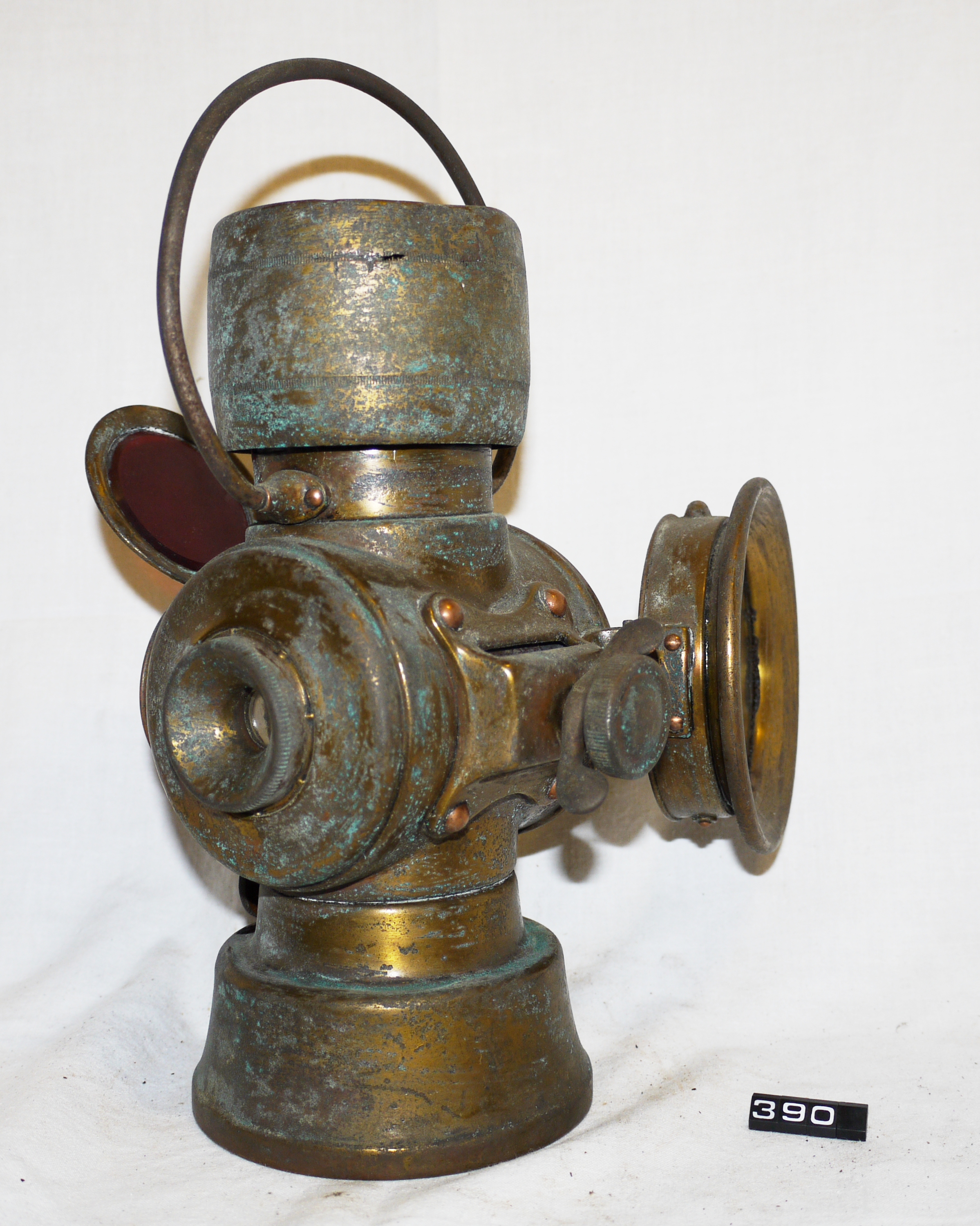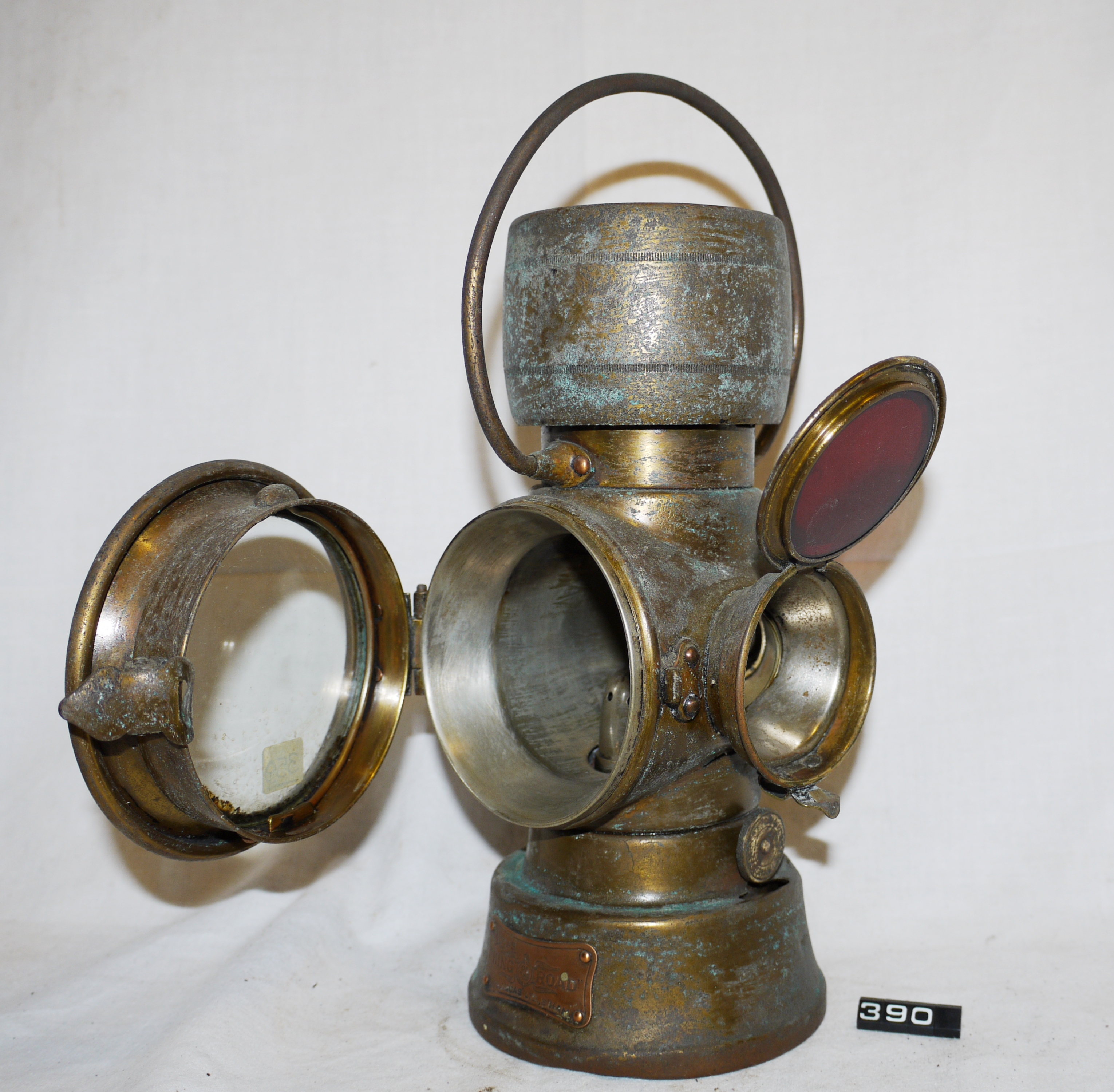 Oil lamp; veteran car lamp; car side lamp; Lucas 'King of the Road No.634'; casing & reservoir made from brass, reflector from polished aluminium; bevelled circular clear glass front lens, hinged bezel; small circular ruby lens to the rear & flat ruby lens on the side; ⅜" flat wick burner (no wick fitted); petrol burner; internal rust on chimney top; carrying handle; the whole lamp shows corrosion; Norris collection.