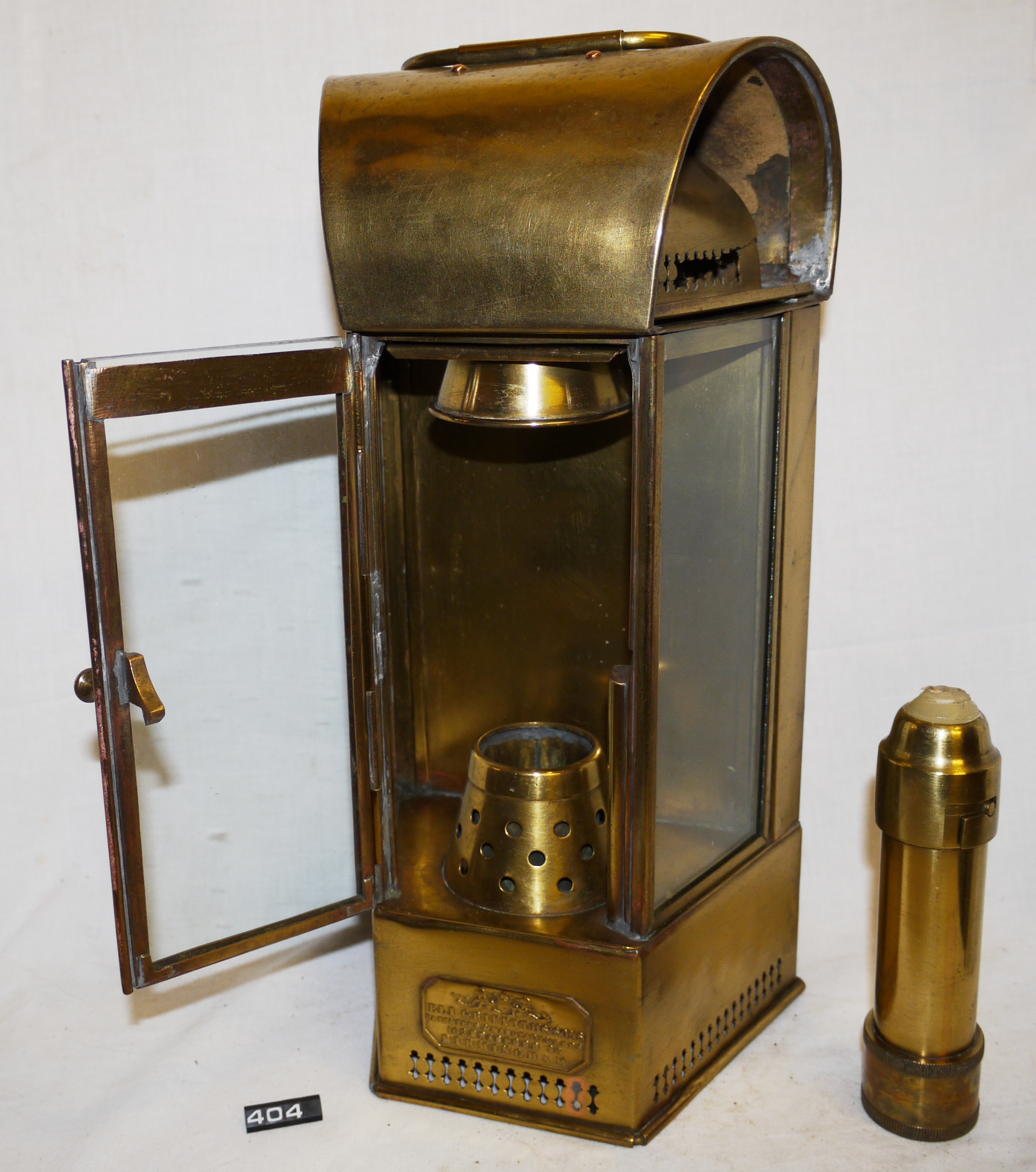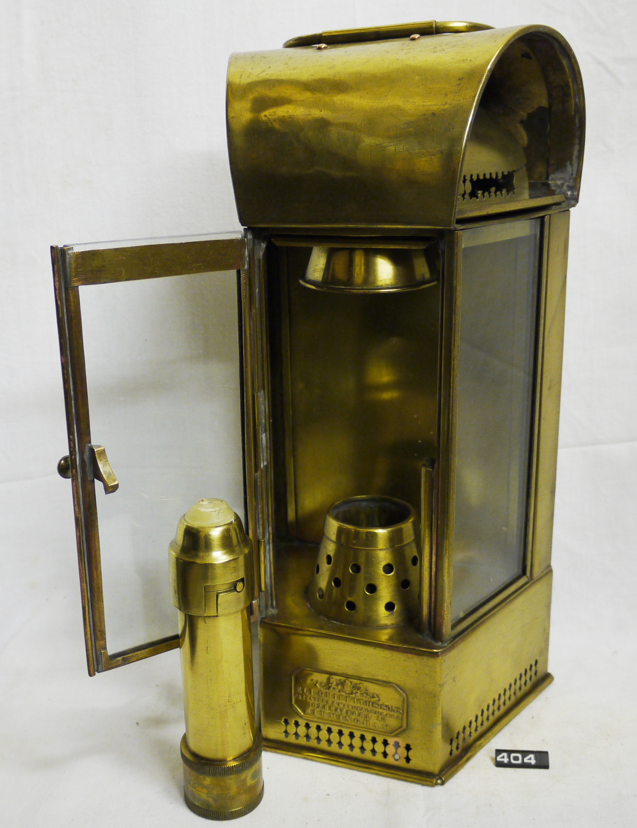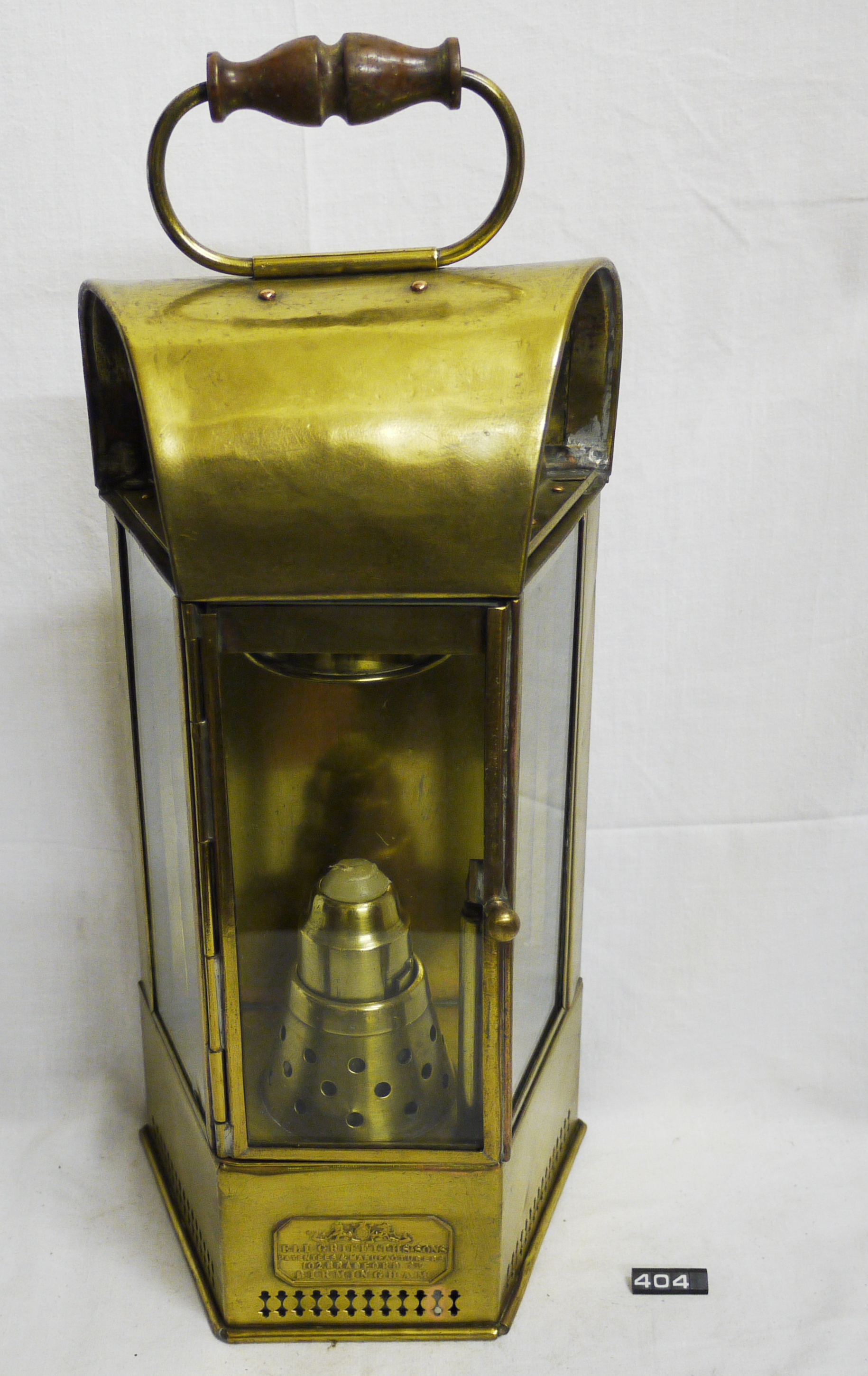 Marine candle lamp; heavy guage brass bulkhead lamp by Eli Griffiths of Birmingham; three colourless glass windows, middle one is hinged for access to the spring-loaded candle holder; hinged chimney (some damage) which can be dismantled for cleaning; substantial mounting bracket on the rear; safety locking device to front door (incomplete); carrying handle with wooden grip on the top; Norris collection.