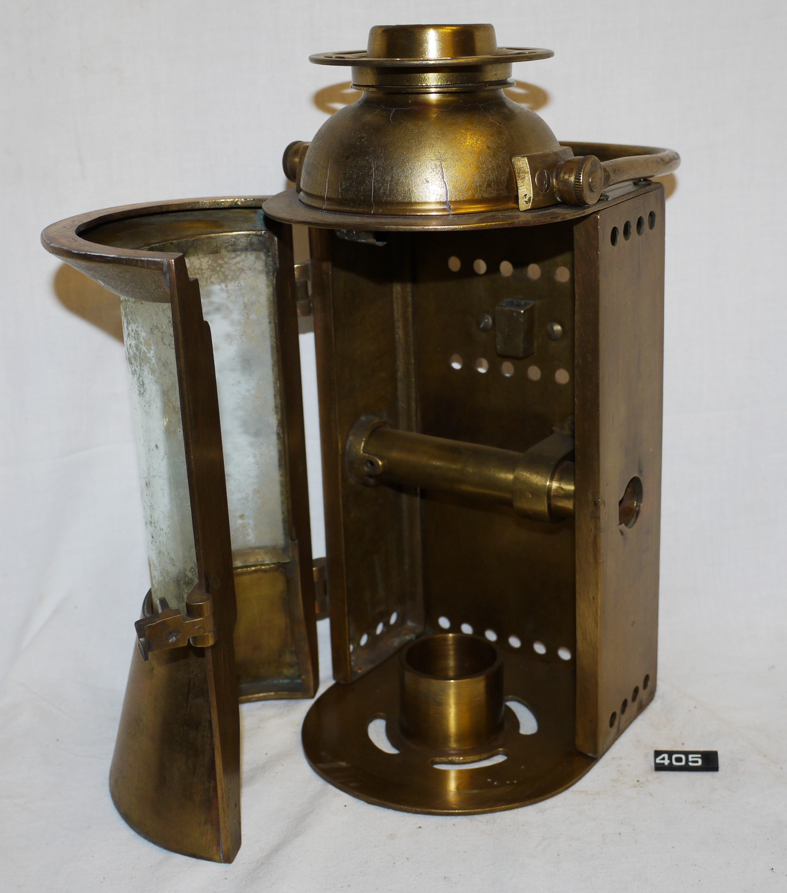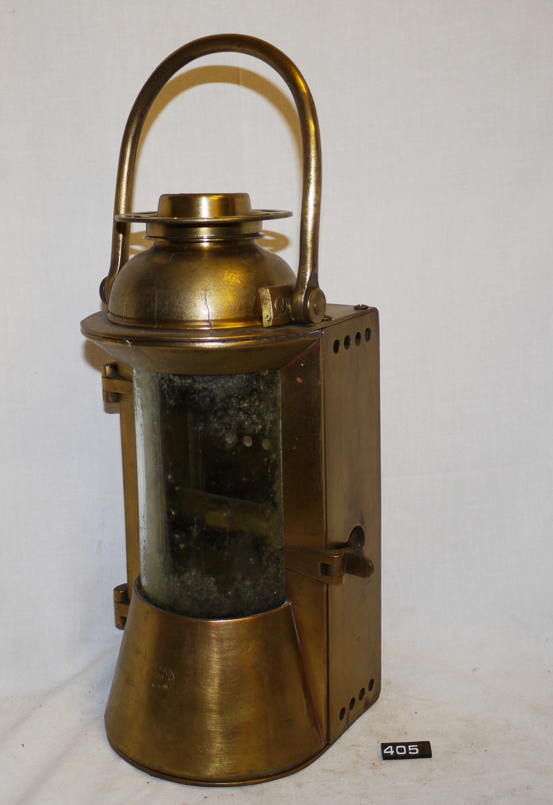 - DescriptionMarine candle lamp; heavy cast brass lamp by Bulpitt & Sons of Birmingham; curved colourless glass window set in hinged door; cracked chimney/top; mounting trunnion passes through the body of the lamp; fitting for candle holder in the base; carrying handle on the top; Norris collection.