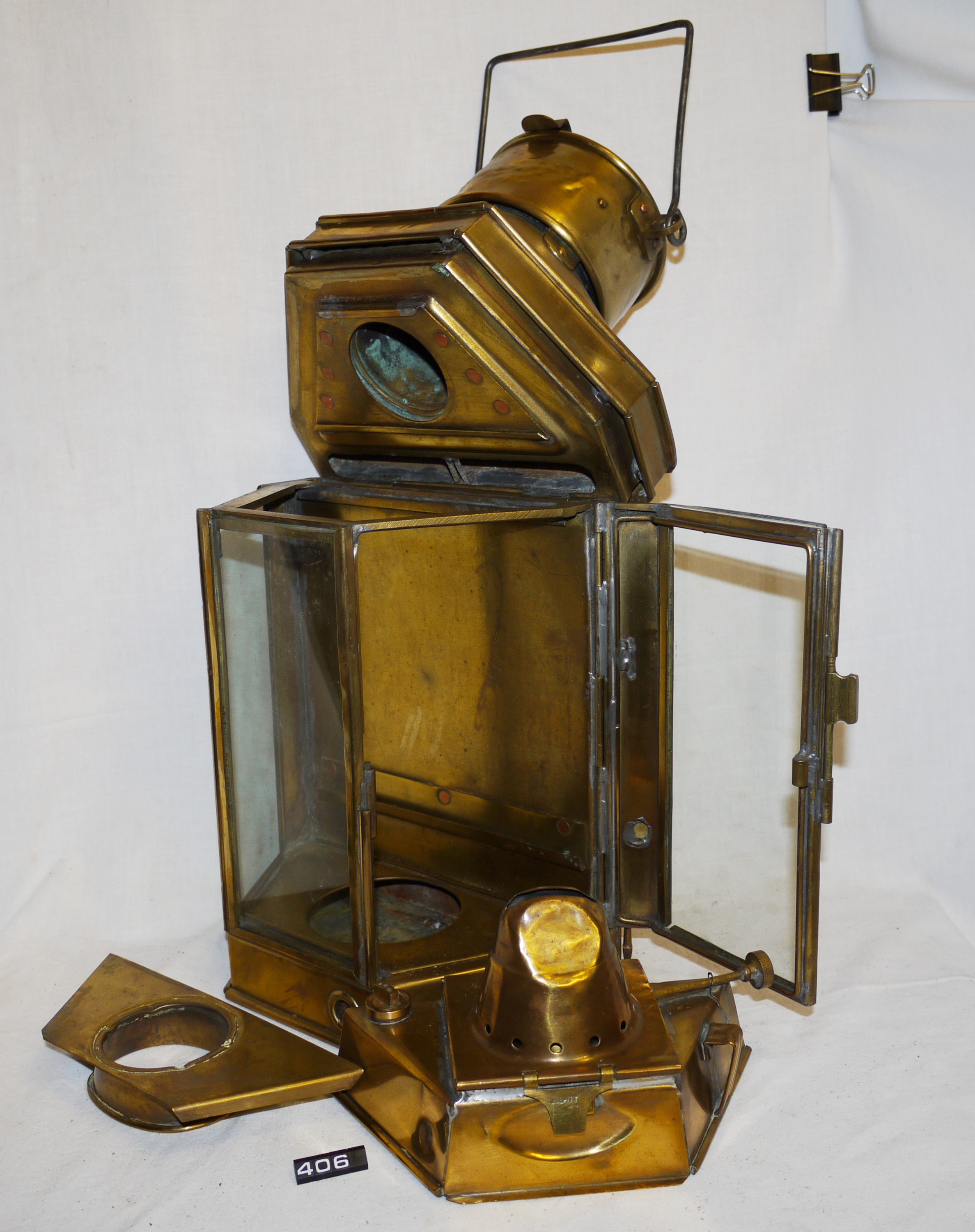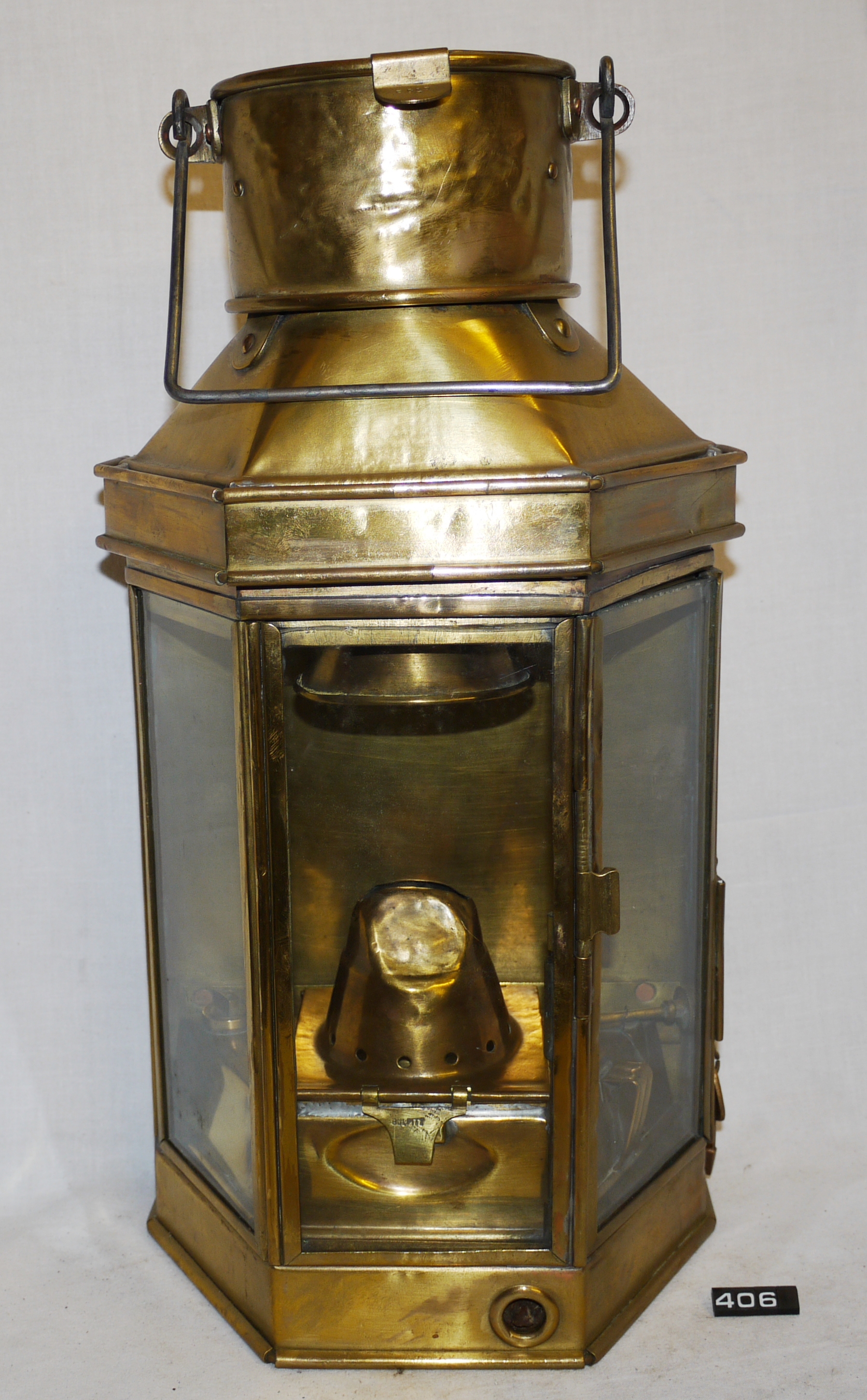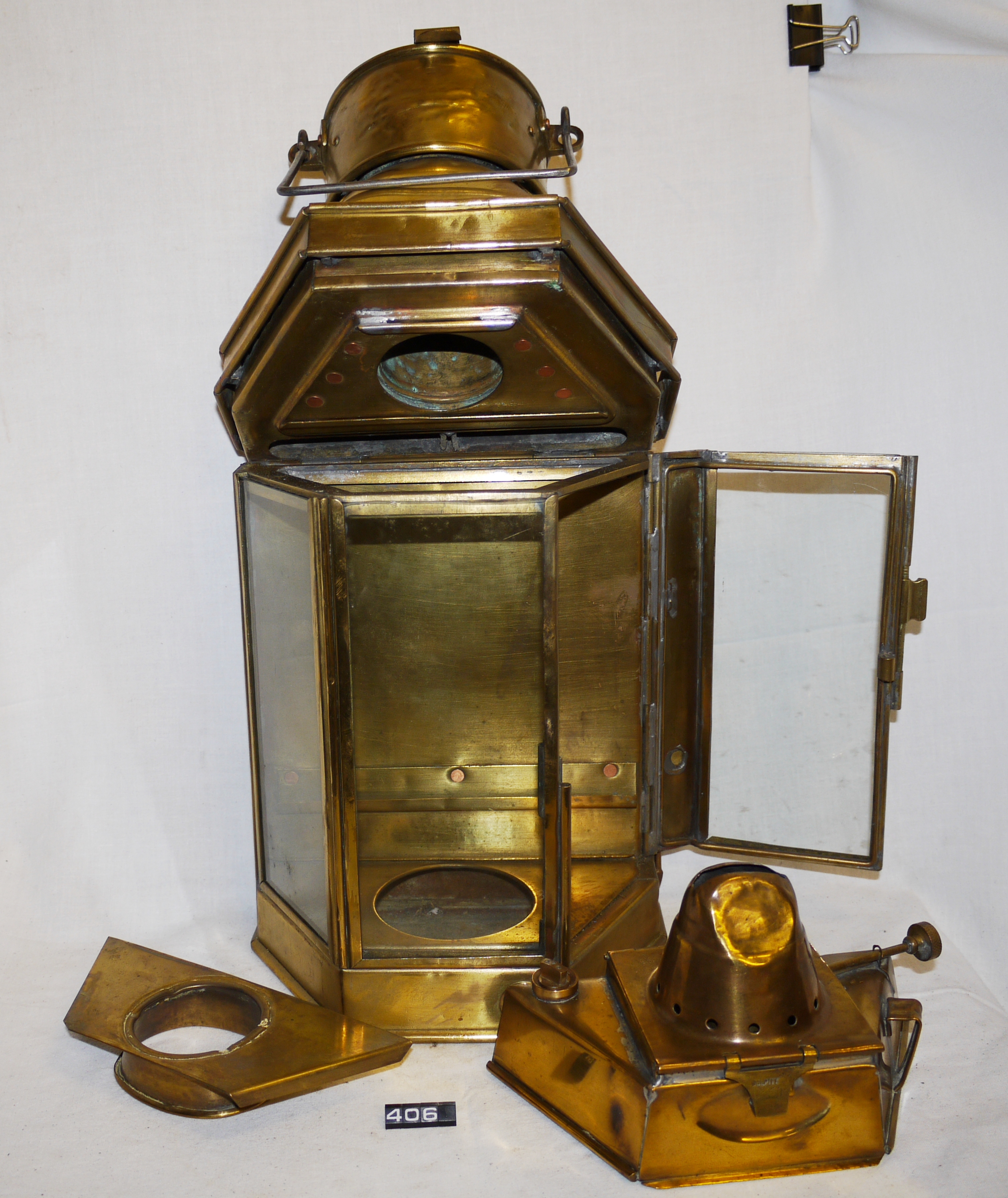 Marine oil lamp; heavy gauge brass lamp by Bulpitt & Sons and Eli Griffiths & Sons of Birmingham; emergency bulkhead lamp; three colourless glass windows, left-hand one is set in a hinged door with a key operated locking mechanism; hinged chimney/top; mounting bracket at the rear; brass reservoir with hinged shroud over the wick; 1" flat wick burner; chimney is dented & the reflector is missing; carrying handle on the top; Norris collection.