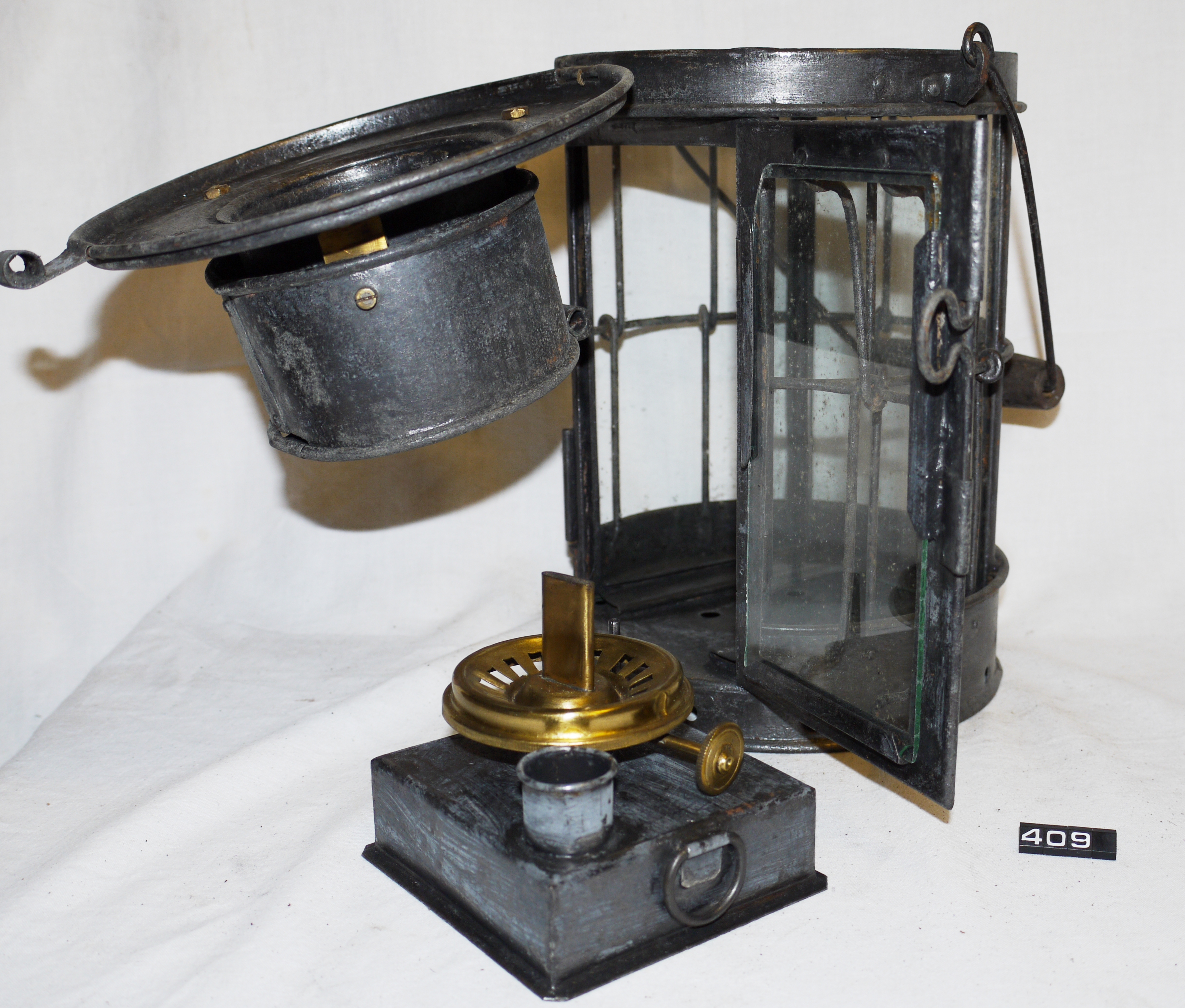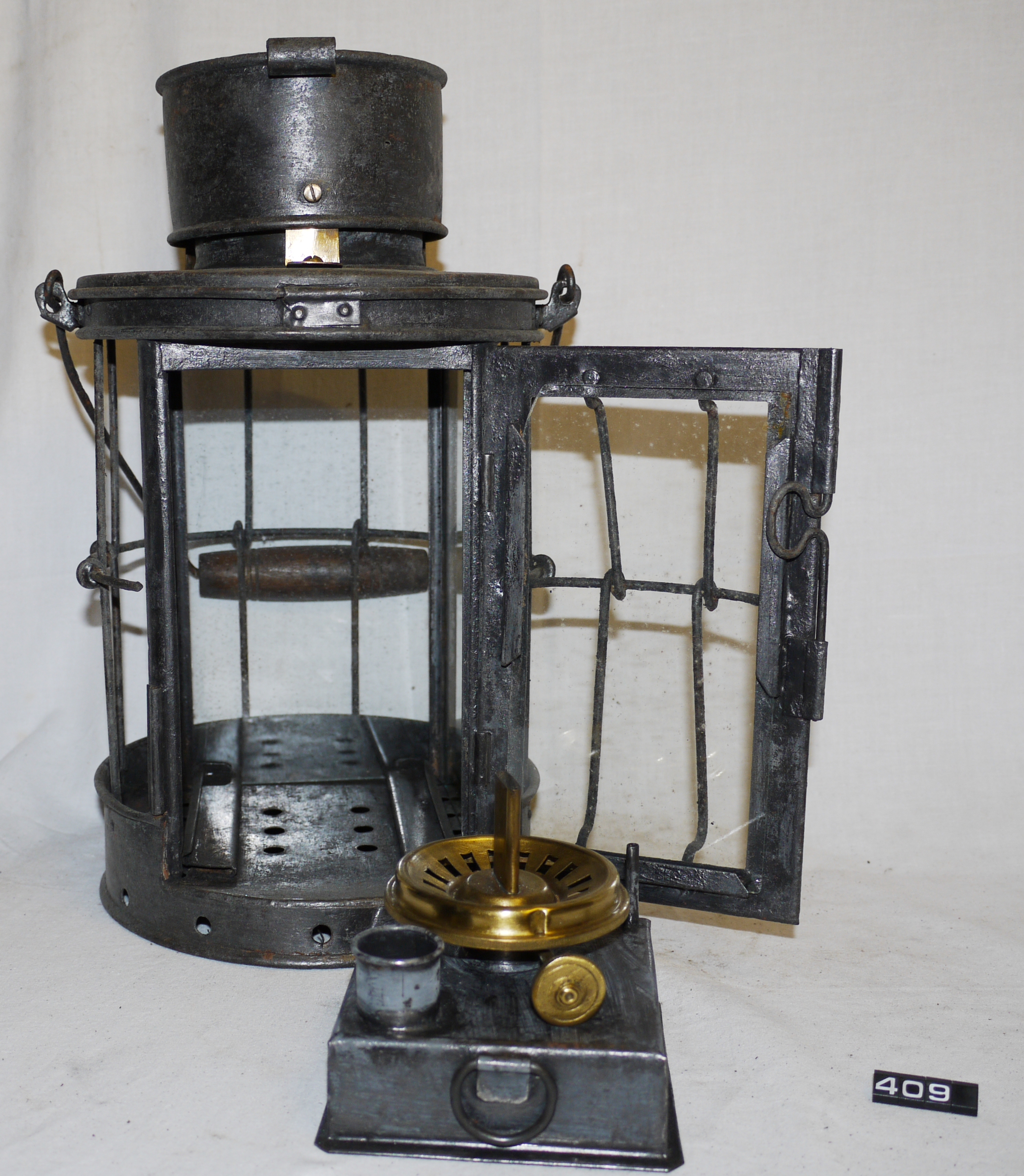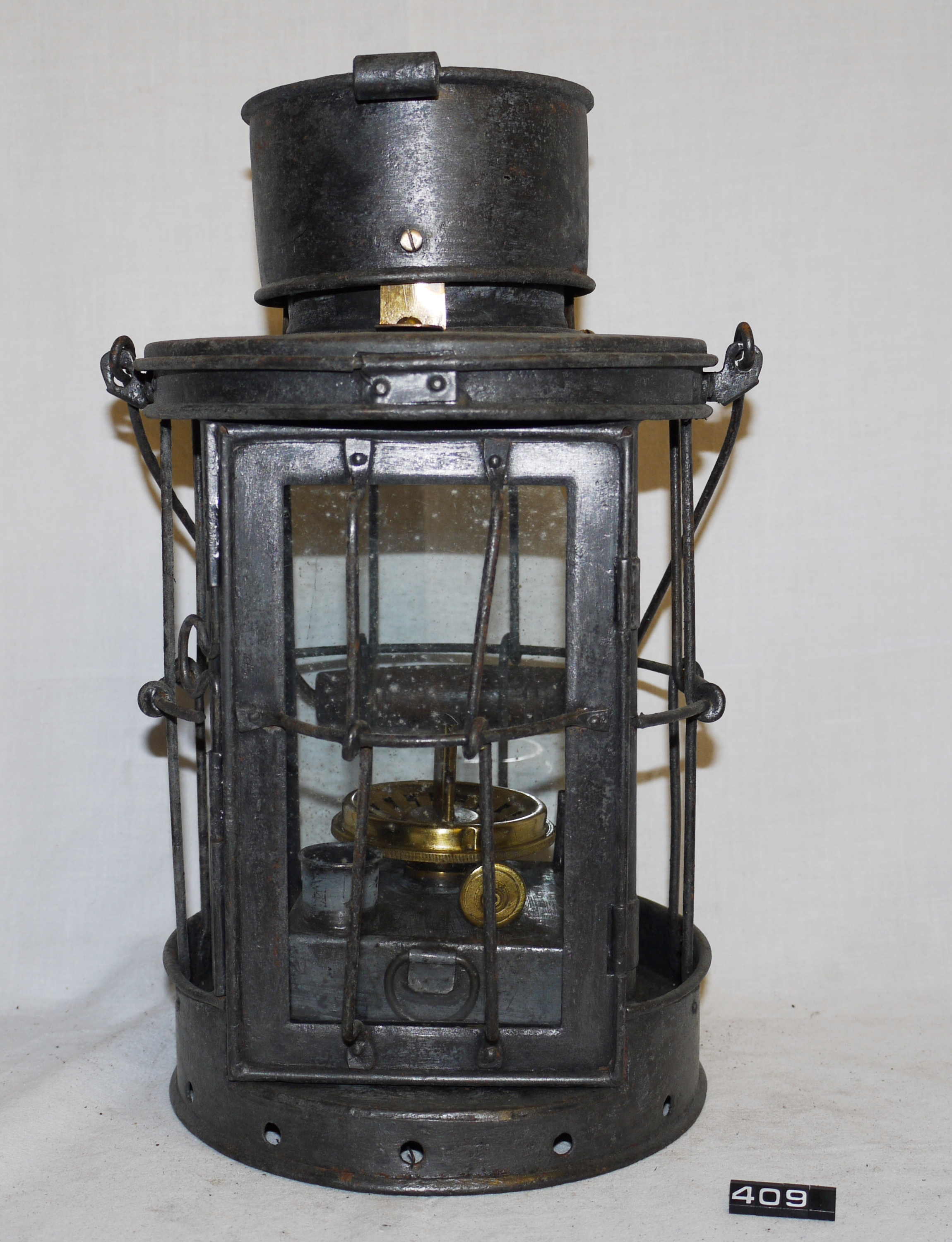 Marine oil lamp; tinned steel lamp (Admiralty bosun's lamp?); four colourless glass windows forming a square within the tinned steel circular section casing; one is set in a hinged door giving access to the burner; hinged cover on the chimney; tinplate reservoir with thumb ring & candle holder; ⅝" flat wick burner; carrying handle with wooden grip on the top; various repairs are apparent; Norris collection.