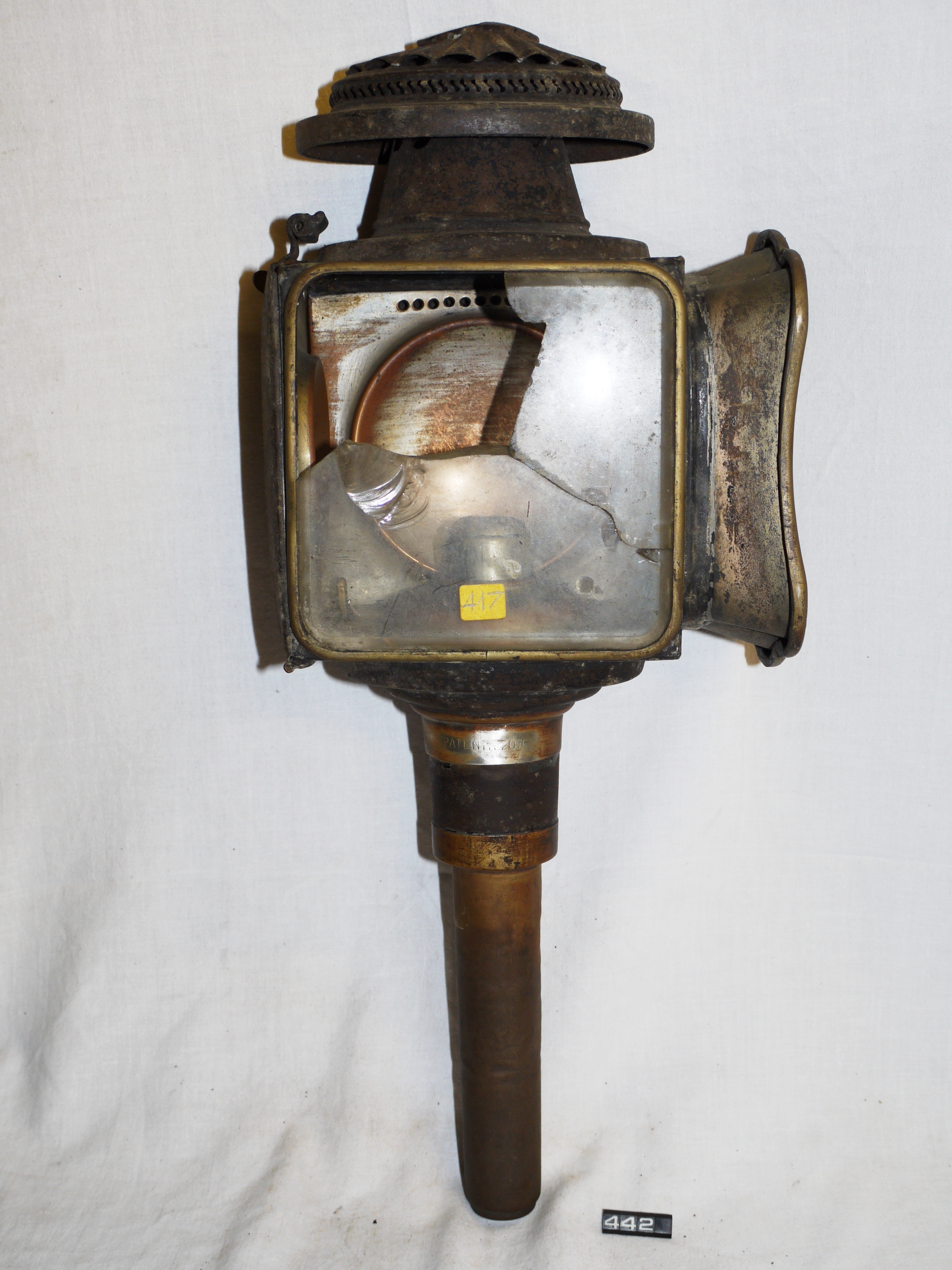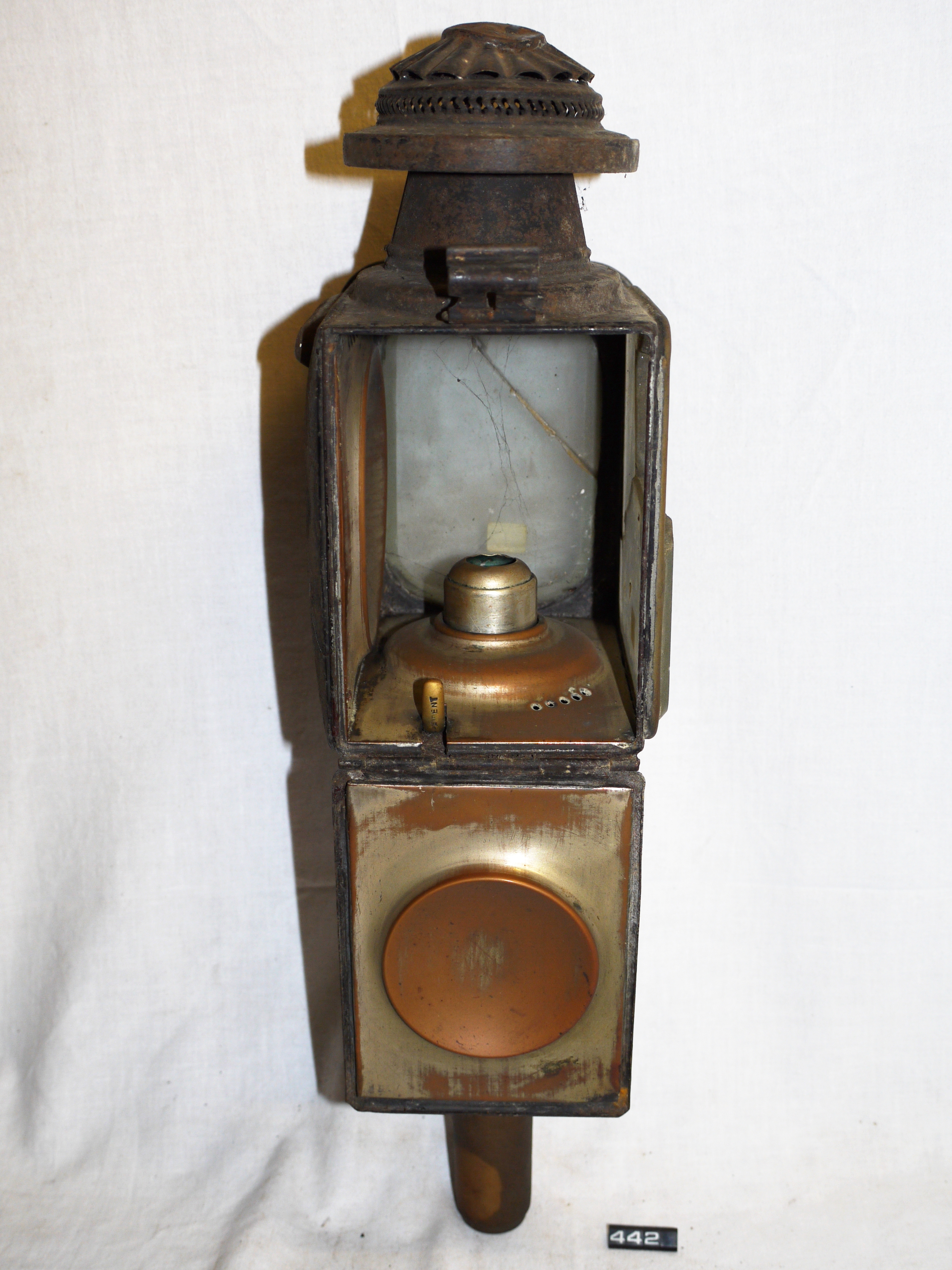 Carriage lamp; candle lamp for a carriage, cart or horse-drawn van; rectangular tinplate body, oval chimney & hinged drop-down door to the rear; japanned black (mostly rusted away); rounded rectangular glass front lens (cracked) with bevelled edges, set in an ornate plated bezel/shroud; rectangular right-hand side lens (cracked and a piece missing) set in a plated bezel; ruby lens in rear door; brass spring-loaded candle holder with patented locking device; the spring has remains of cloth covering; plated copper reflectors, very worn; Norris collection.