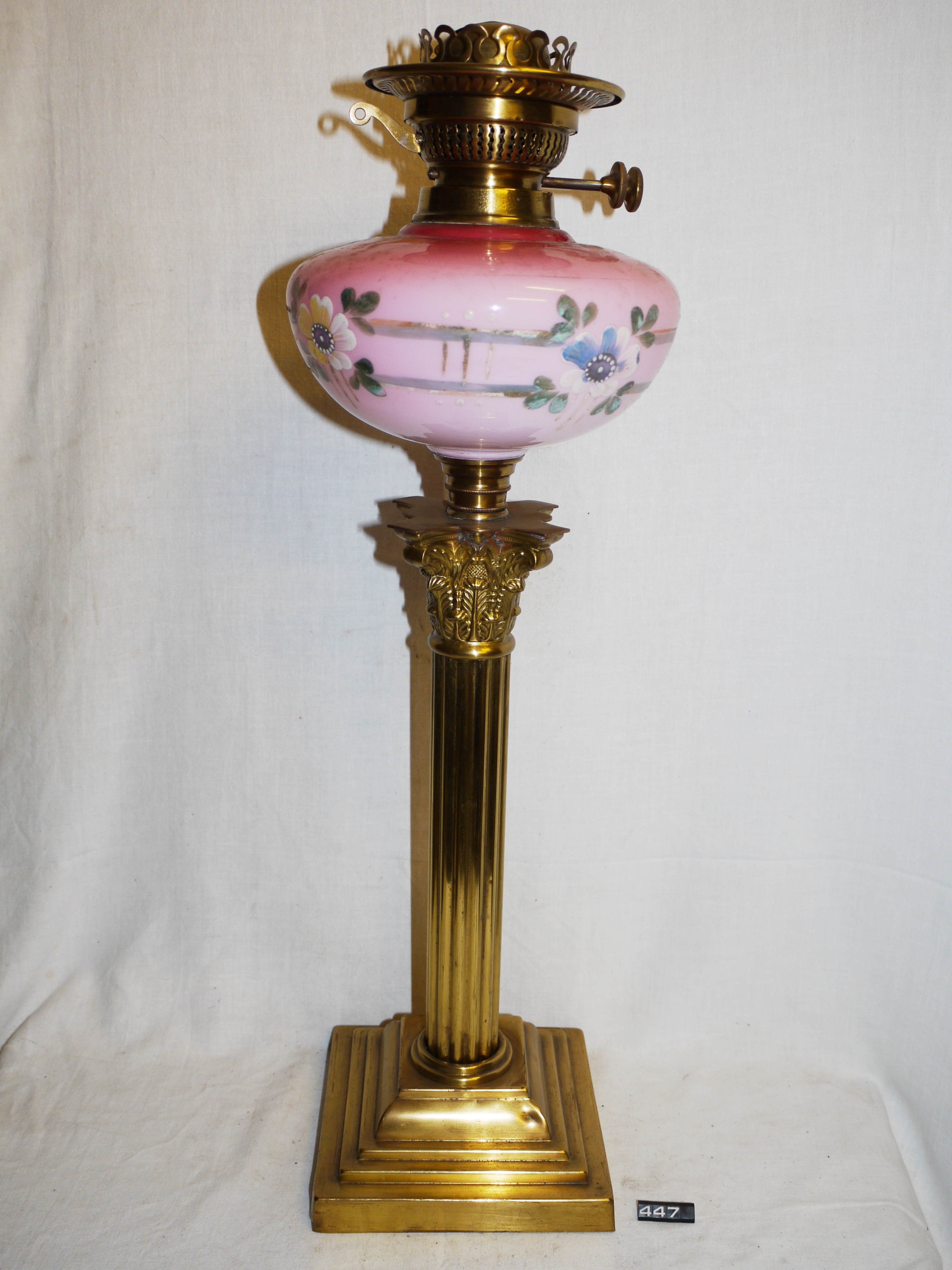 Oil lamp, freestanding domestic table lamp (probably made by Hinks & Sons); square stepped base brass base weighted with an iron insert; the stem is a fluted Corinthian column with an elaborate capital; hand-painted pink glass fount with brass connector & collar' fitted with a brass duplex burner, with snuffing mechanism; 4" gallery, with wicks fitted; this lamp has been converted to electricity (hence the holes for wires), but has now been restored; Norris collection.
