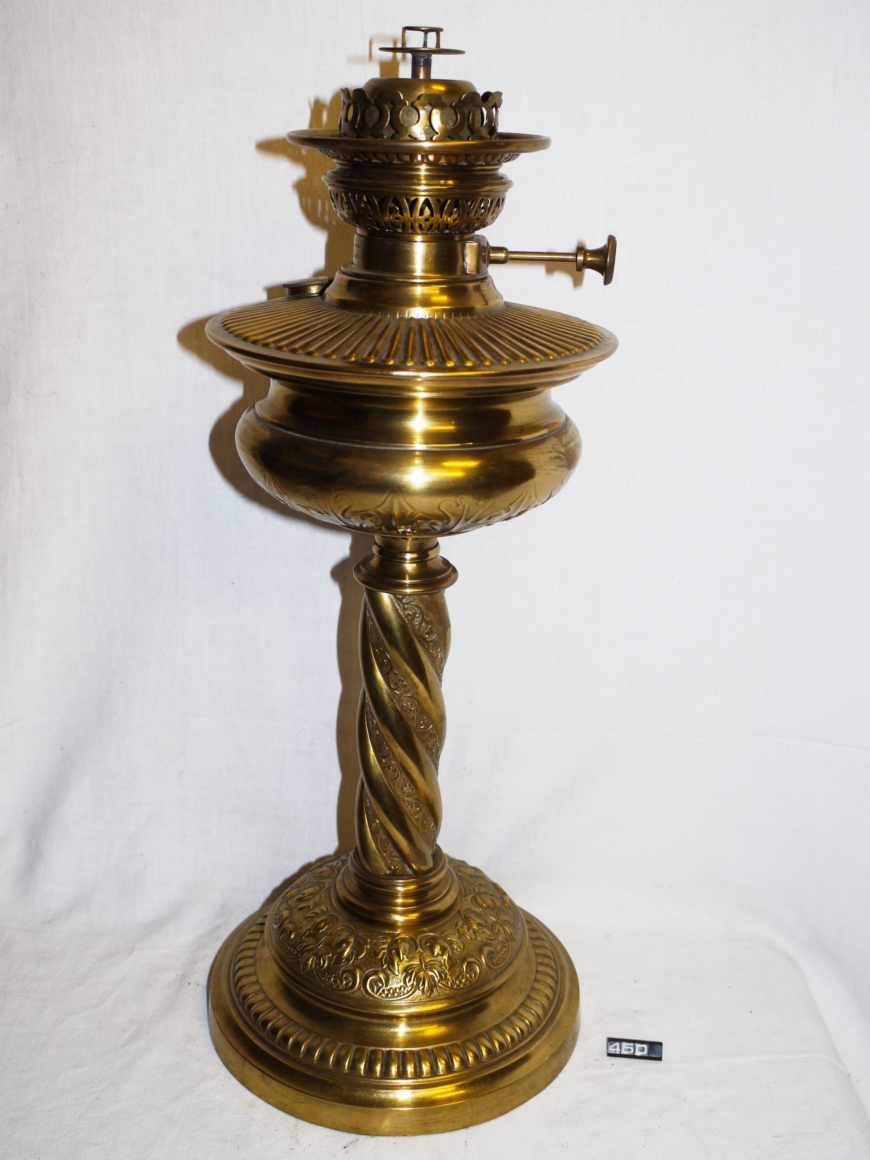 - DescriptionOil lamp; table lamp; pressed embossed brass pedestal & fluted brass column with engraving; brass fount with acanthus leaves on the base & a radiant pressed design on the upper surface; screw cap filler; Veritas centre draught burner, with a 4" gallery, a wick is fitted; the base has cast iron weight insert; Norris collection.
