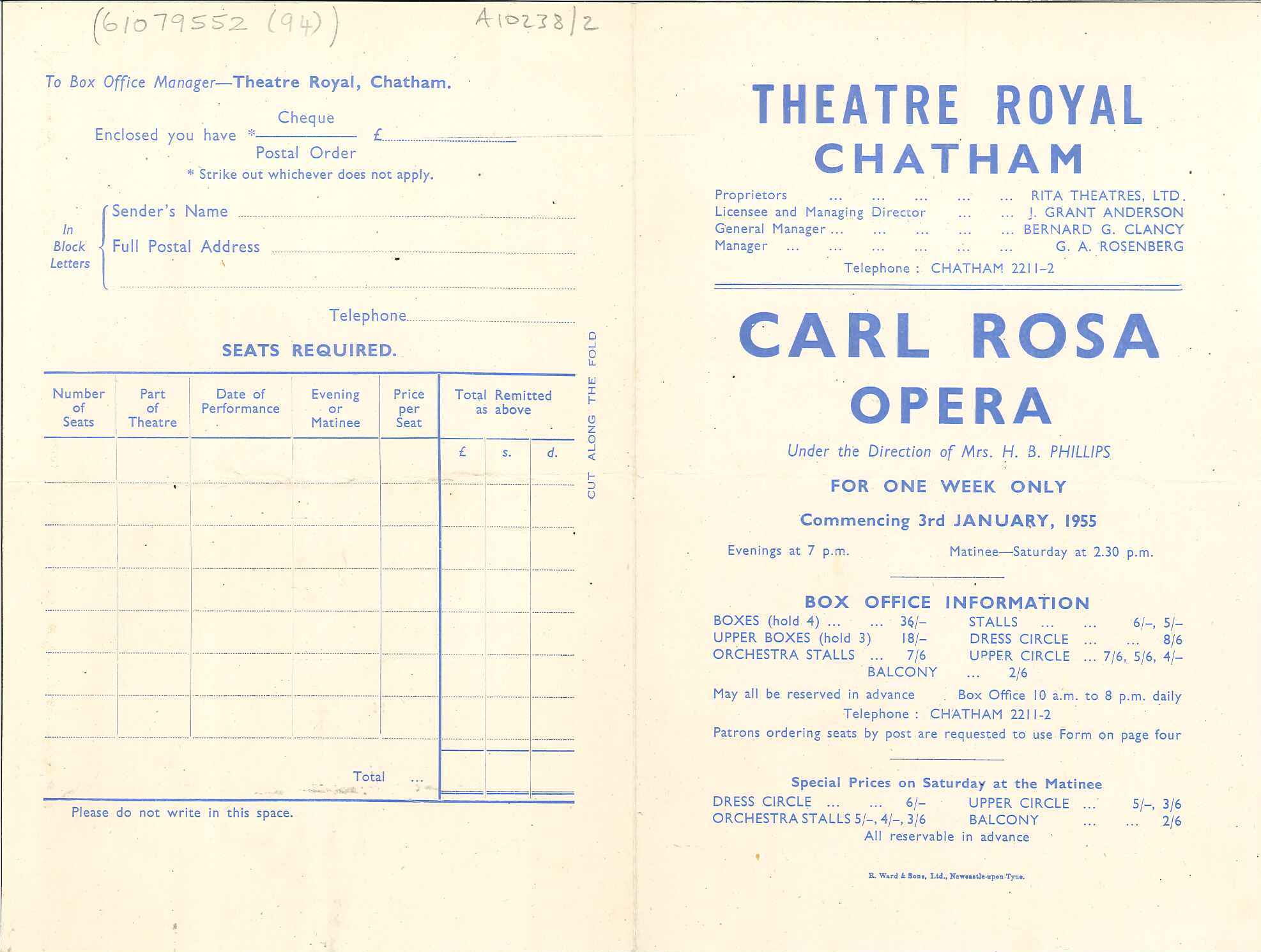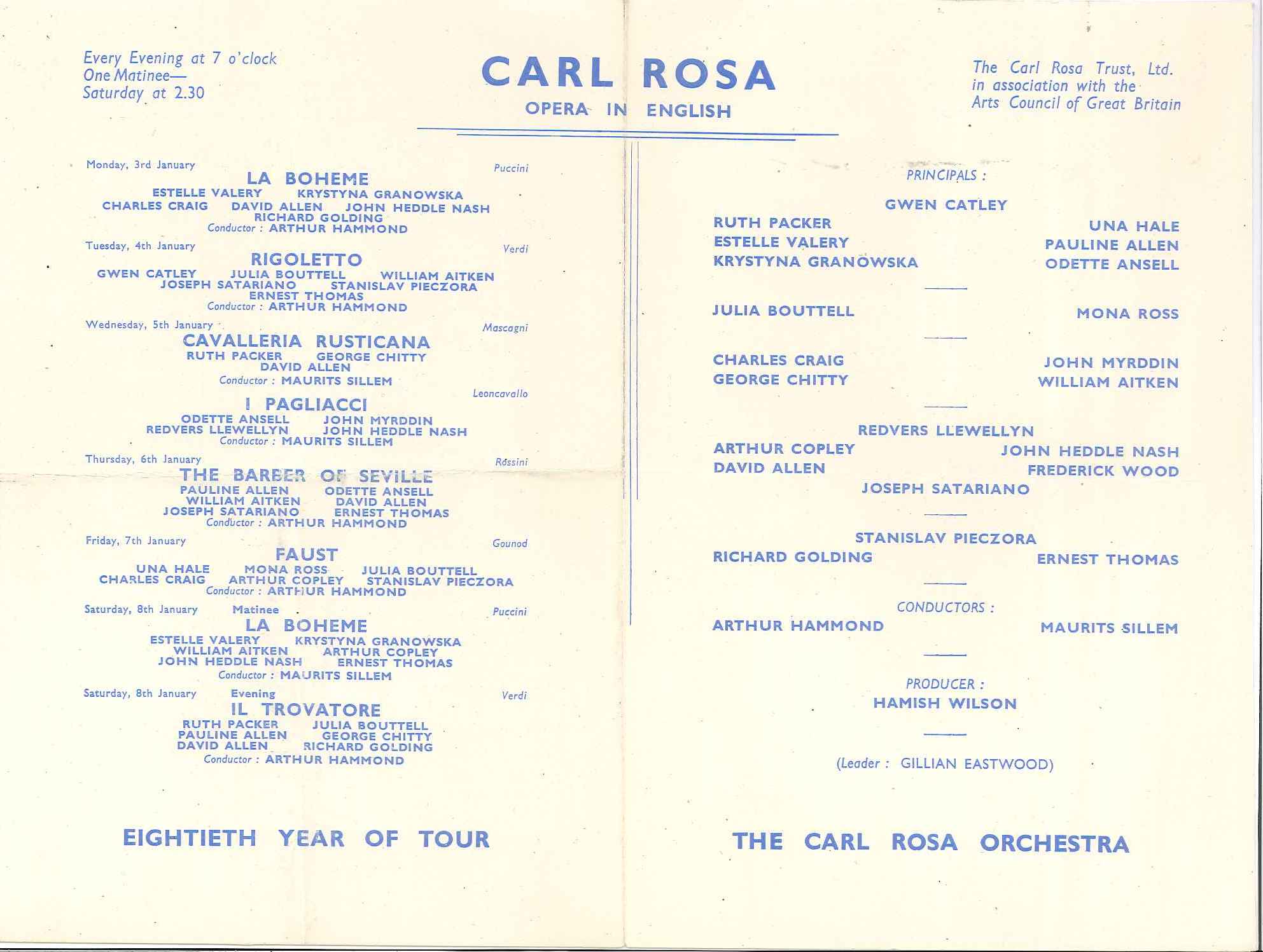 - DescriptionTheatre Programme for the Theatre Royal Chatham, for the week commencing Monday 3rd January 1955; lists various operas to be performed by The Carla Rosa Opera Company over the week.