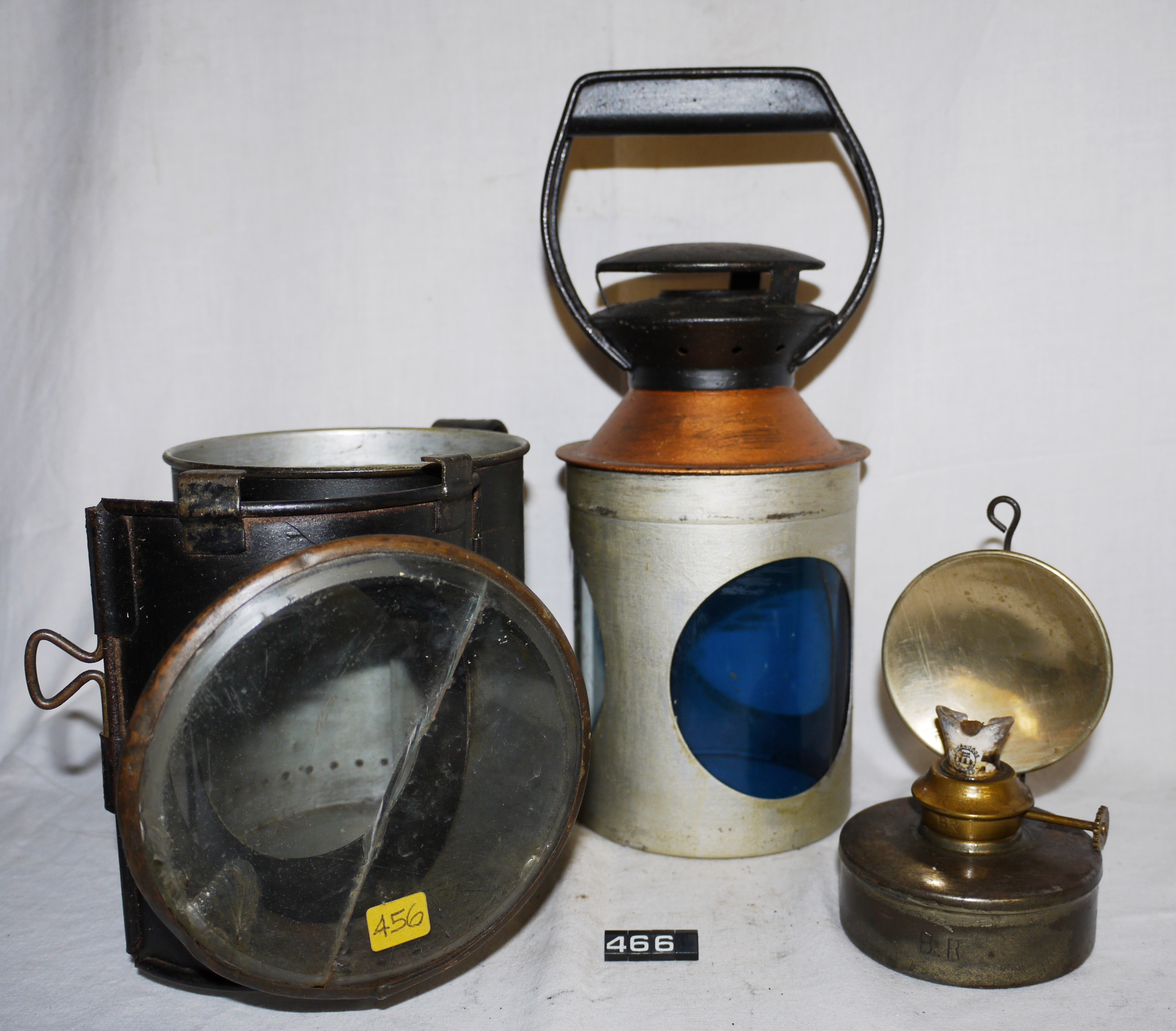 Oil lamp for railway signalling; tinplate body, chimney, filter holder & fount; polished tinplate or steel(?) reflector; ¼" flat wick ceramic & brass plug fitting burner; thick glass lens (cracked), with a blue filter and provision for two others; (the blue filter was used because the yellow light of the oil lamp would show through the blue filter, resulting in a green light being shown); rigid carrying handle fitted to chimney and mounting hook/bracket at the rear of the body; markings show the lamp was used by Southern Railways; lamp has been repainted; Norris collection.