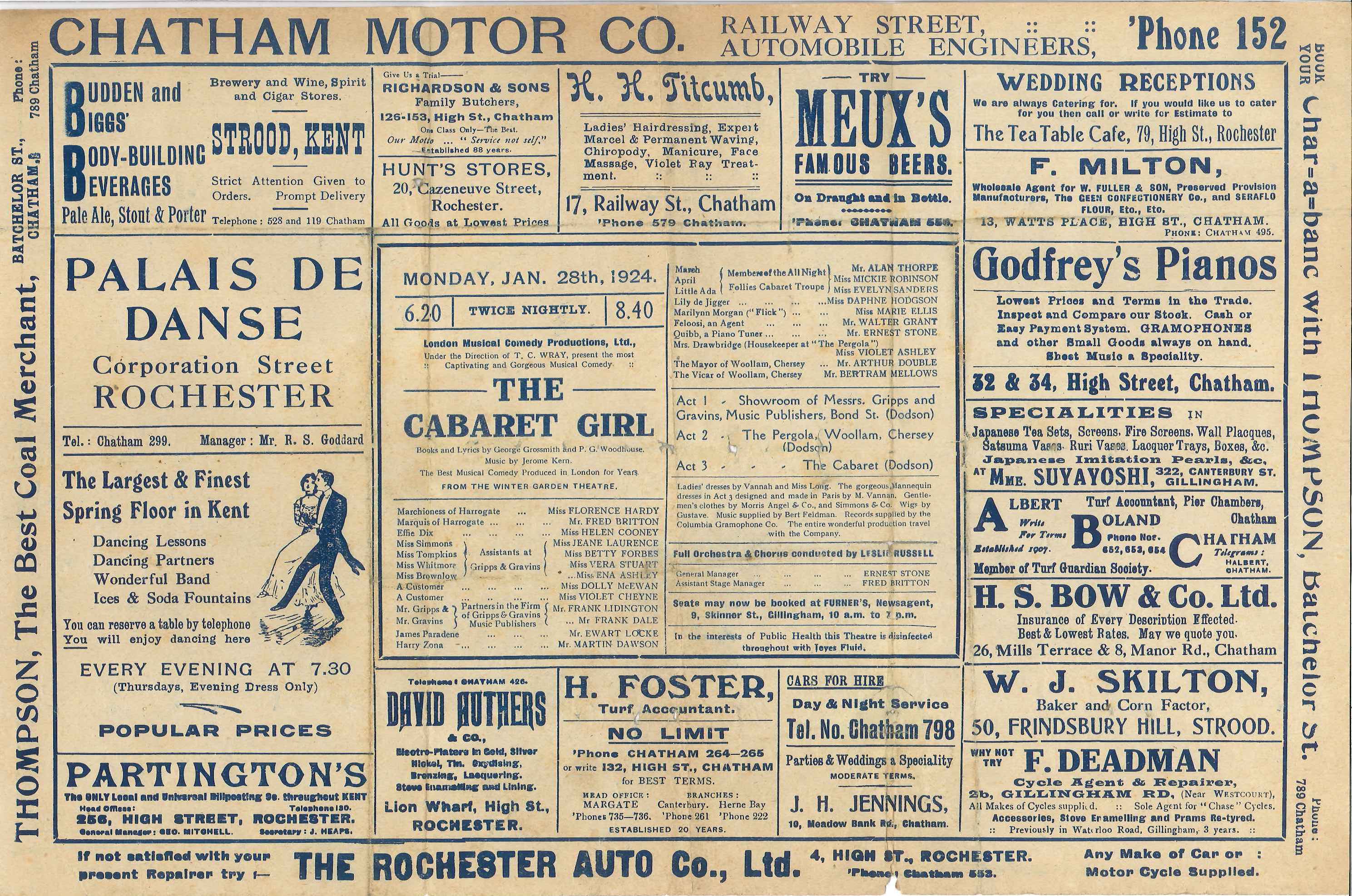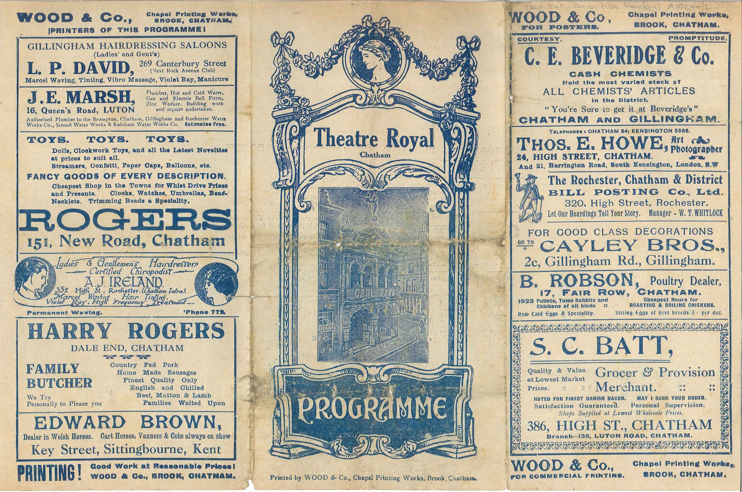 - DescriptionTheatre Programme for the Chatham Theatre Royal, week commencing Monday January 28th 1924; various acts listed interspersed with local advertisements.