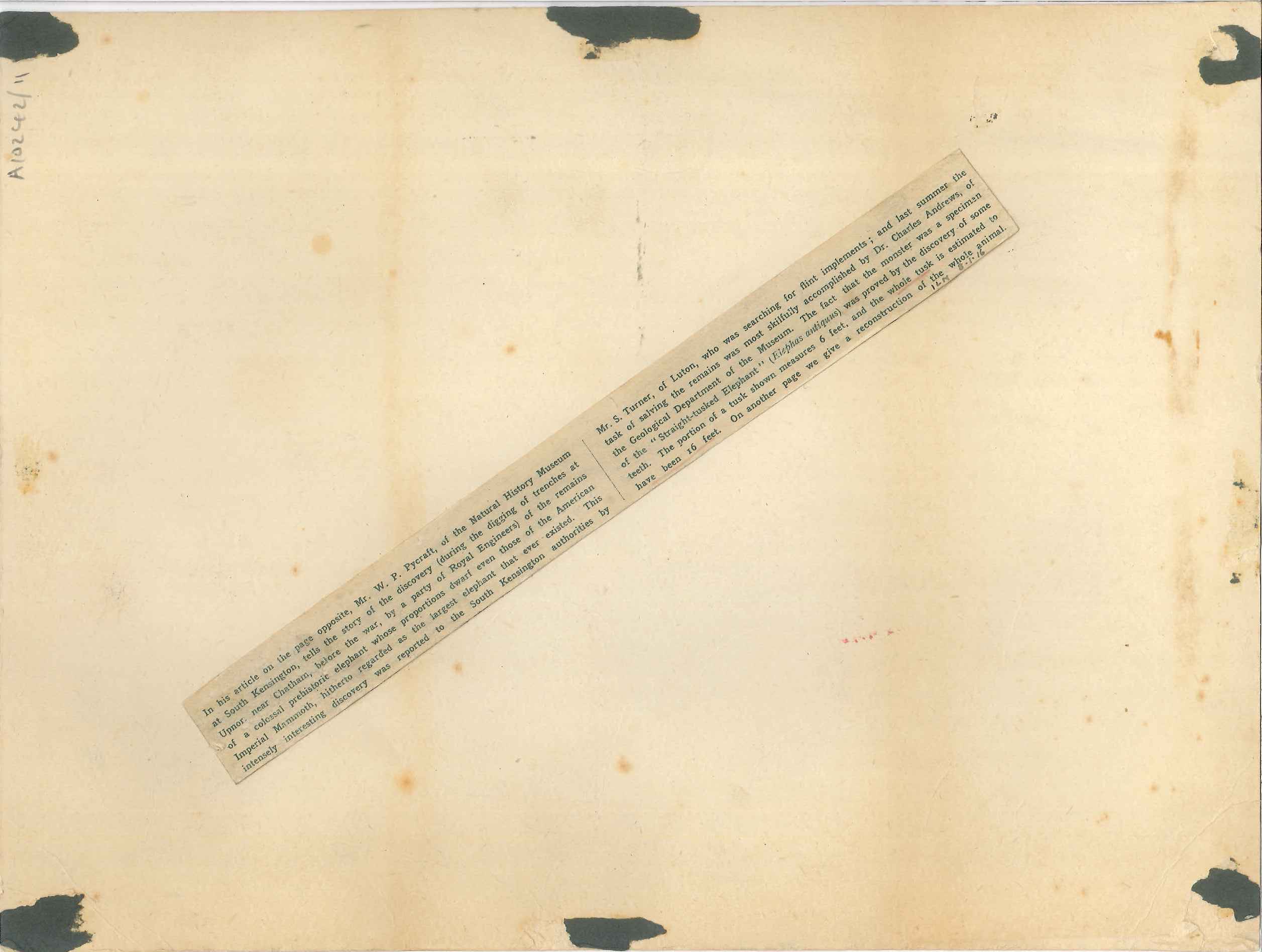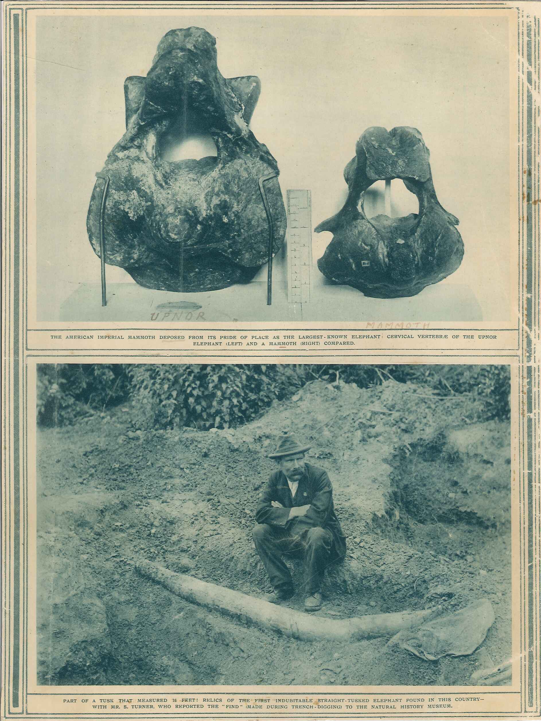- DescriptionImage of bones from the Upnor elephant (Elephas Antiquus) discovered in 1913; shows also Mr S K Turner, the discoverer of the fossil; taken from the Illustrated London News for 8th January 1916.