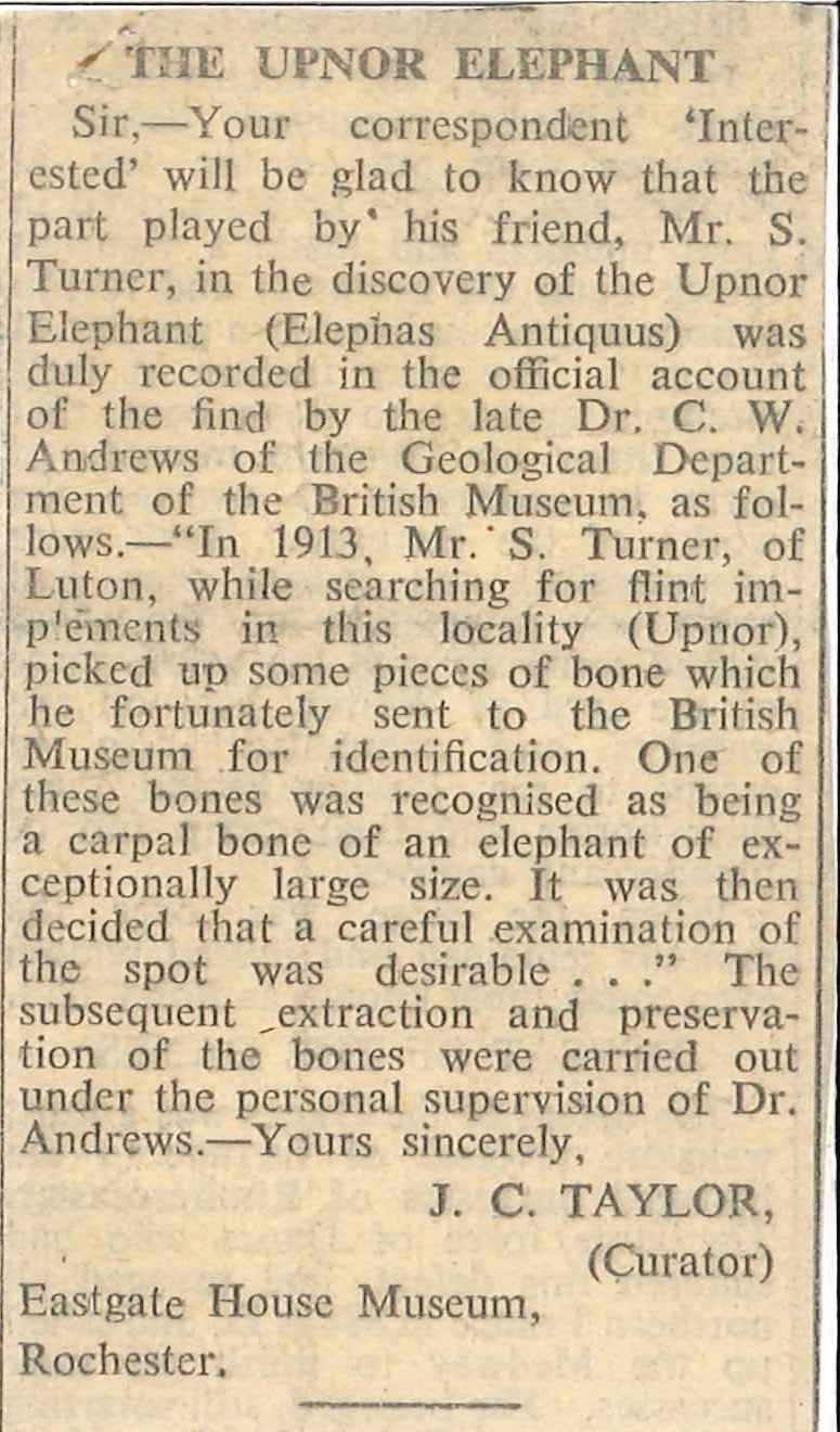 - DescriptionNewspaper cutting concerning mammoth remains in Eastgate House Museum, the Upnor elephant (Elephas Antiquus), & Mr S K Turner; taken from the Chatham Observer for 14/02/1953.
