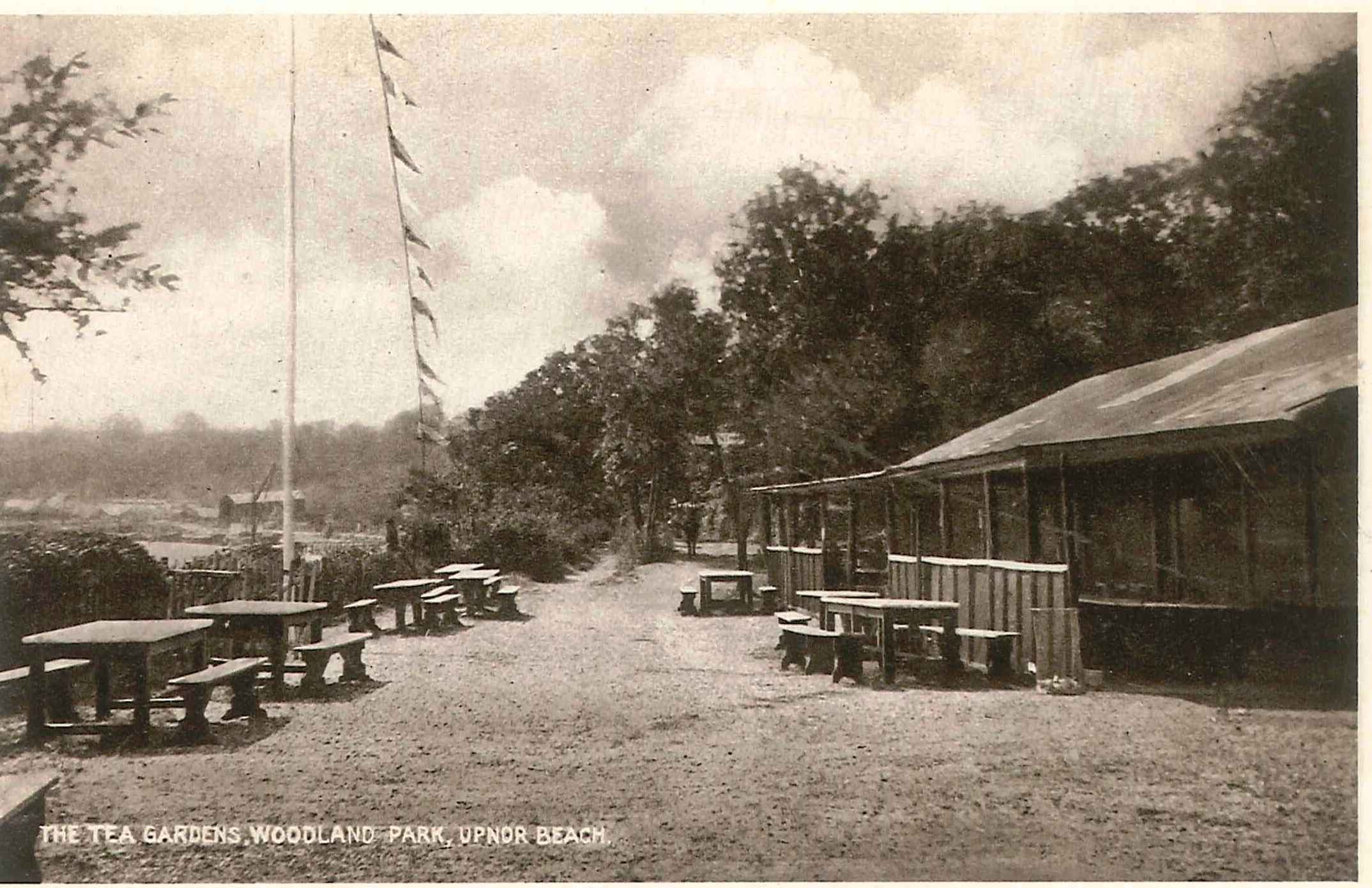 - DescriptionPostcard photograph of The Tea Gardens, Woodland Park, Upnor Beach, showing tables and benches outside of tea house; part of a set of six postcards contained within an envelope declaring 'THIS PACKET contains SIX up to date LOCAL VIEWS. Published by the 'Philco' Publishing Co. London. W.C.1 for J.T.HOSGOOD, Woodland Park Tea Gardens, Upnor, Rochester''