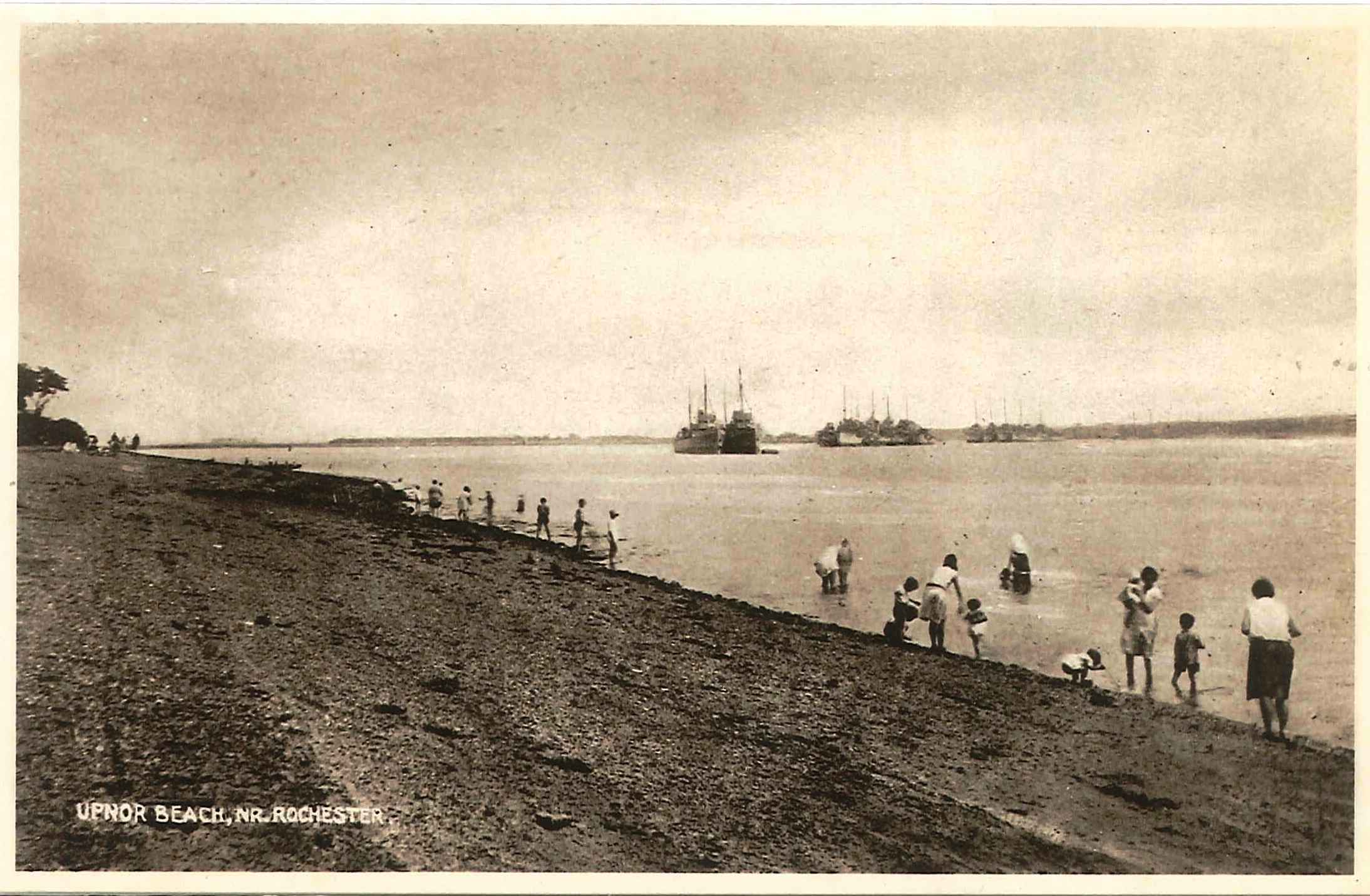 - DescriptionPostcard photograph of Upnor Beach, near Rochester; showing adults and children on the shore and in the water, with ships moored in the river Medway beyond; part of a set of six postcards contained within an envelope declaring 'THIS PACKET contains SIX up to date LOCAL VIEWS. Published by the 'Philco' Publishing Co. London. W.C.1 for J.T.HOSGOOD, Woodland Park Tea Gardens, Upnor, Rochester''