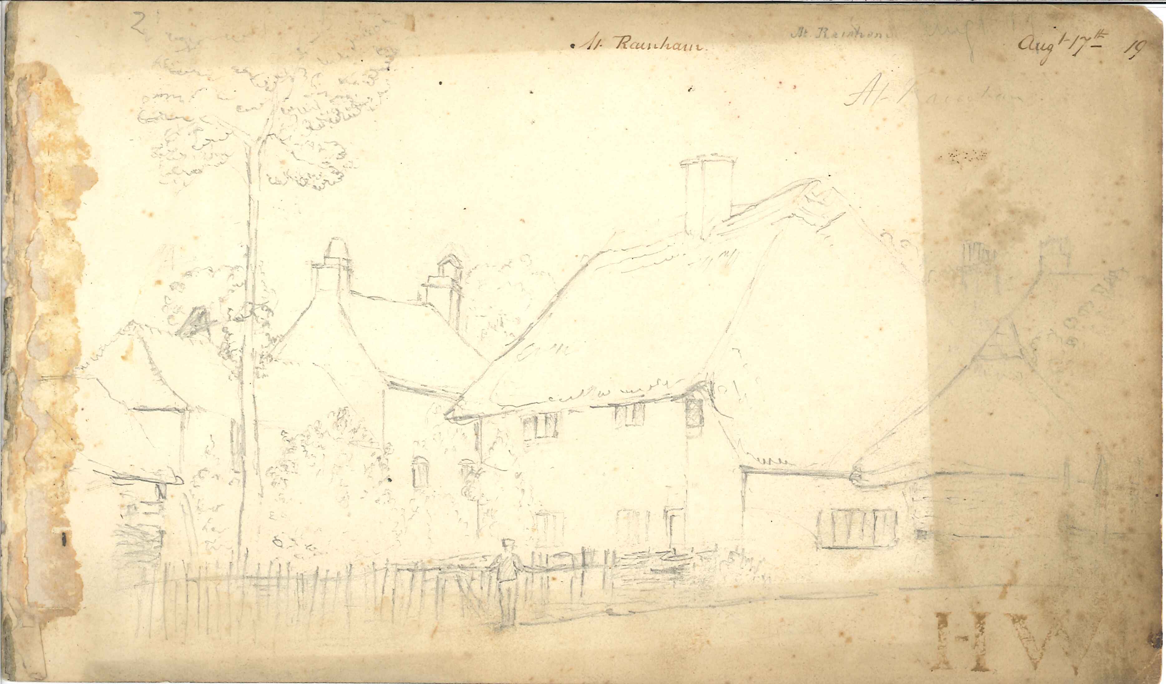 - DescriptionPencil drawing; shows thatched cottages at Rainham in 17/08/1819; drawn by Humphrey Wickham (died 1893), a local antiquarian (see notes field for further biographical details). One of a series of 25 sketches & watercolours in a (now looseleaf) sketchbook.