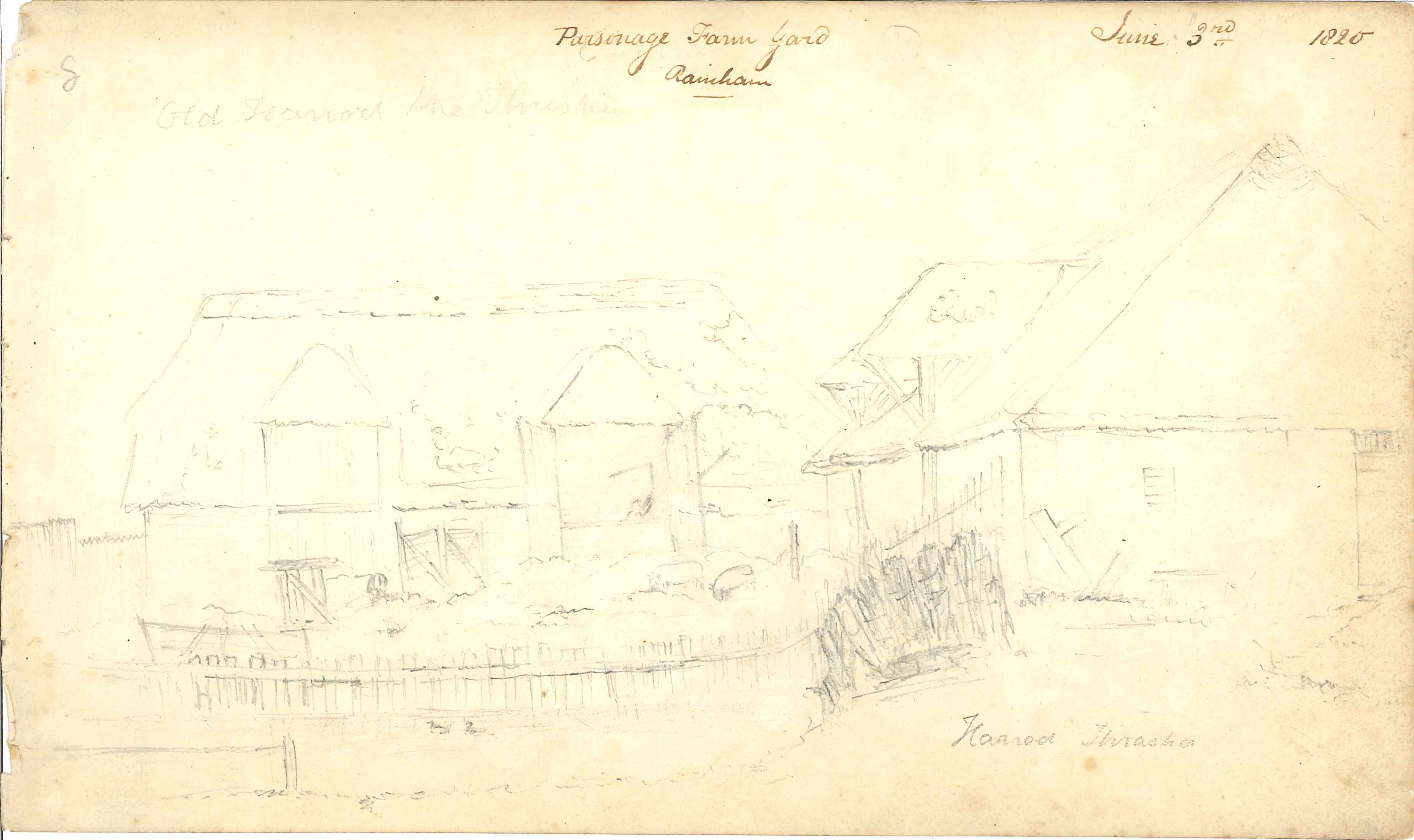 Pencil drawing; shows Parsonage Farm Yard, Rainham in 03/06/1820; in the barn in the background a figure can been seen wielding a threshing flail - he is identified as 'Old Harrod' by the artist; drawn by Humphrey Wickham (died 1893), a local antiquarian (see notes field for further biographical details). One of a series of 25 sketches & watercolours in a (now looseleaf) sketchbook.