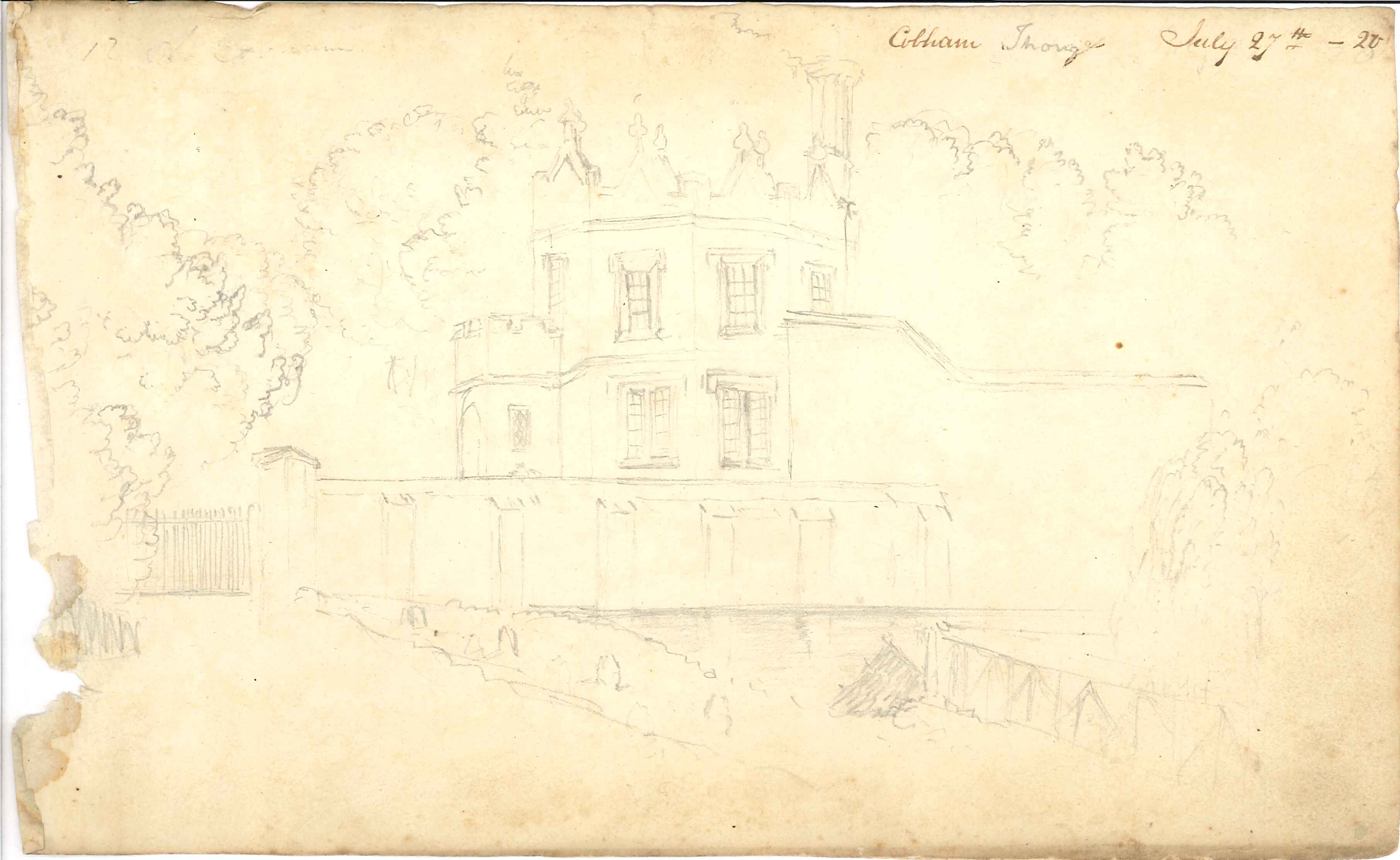- DescriptionPencil drawing of Cobham; shows a view of a building in Cobham, probably in Cobham Park; drawn by Humphrey Wickham (died 1893), a local antiquarian (see notes field for further biographical details). One of a series of 25 sketches & watercolours in a (now looseleaf) sketchbook.