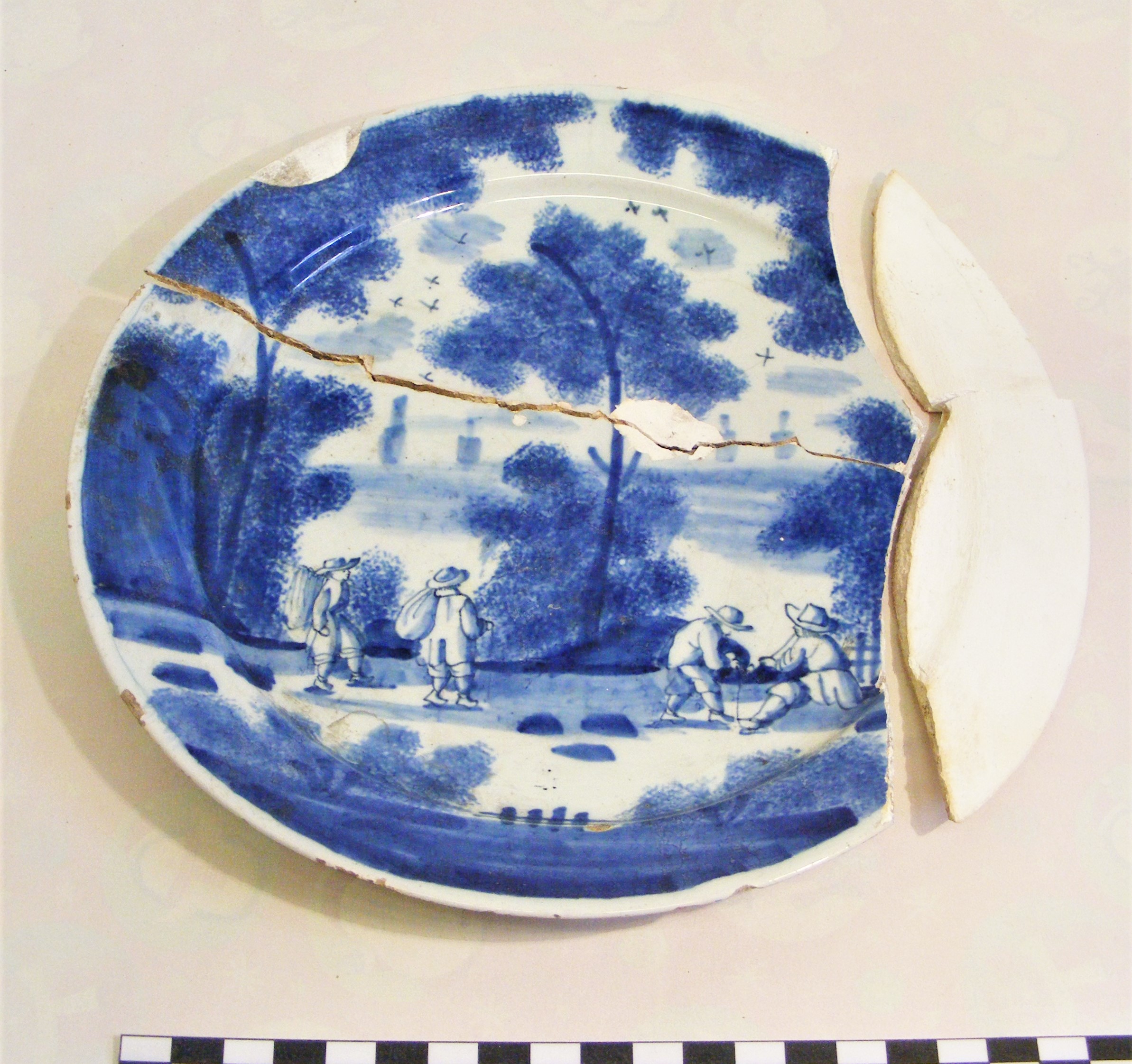 - DescriptionTin glazed earthenware plate, incomplete, sections of plaster fill; (cobalt) blue scene with figures (wearing clogs) and trees; possibly a Chinese item in a Dutch style? for the European market; Chinese; from the garden of the Bishop's Palace, Rochester, Kent.