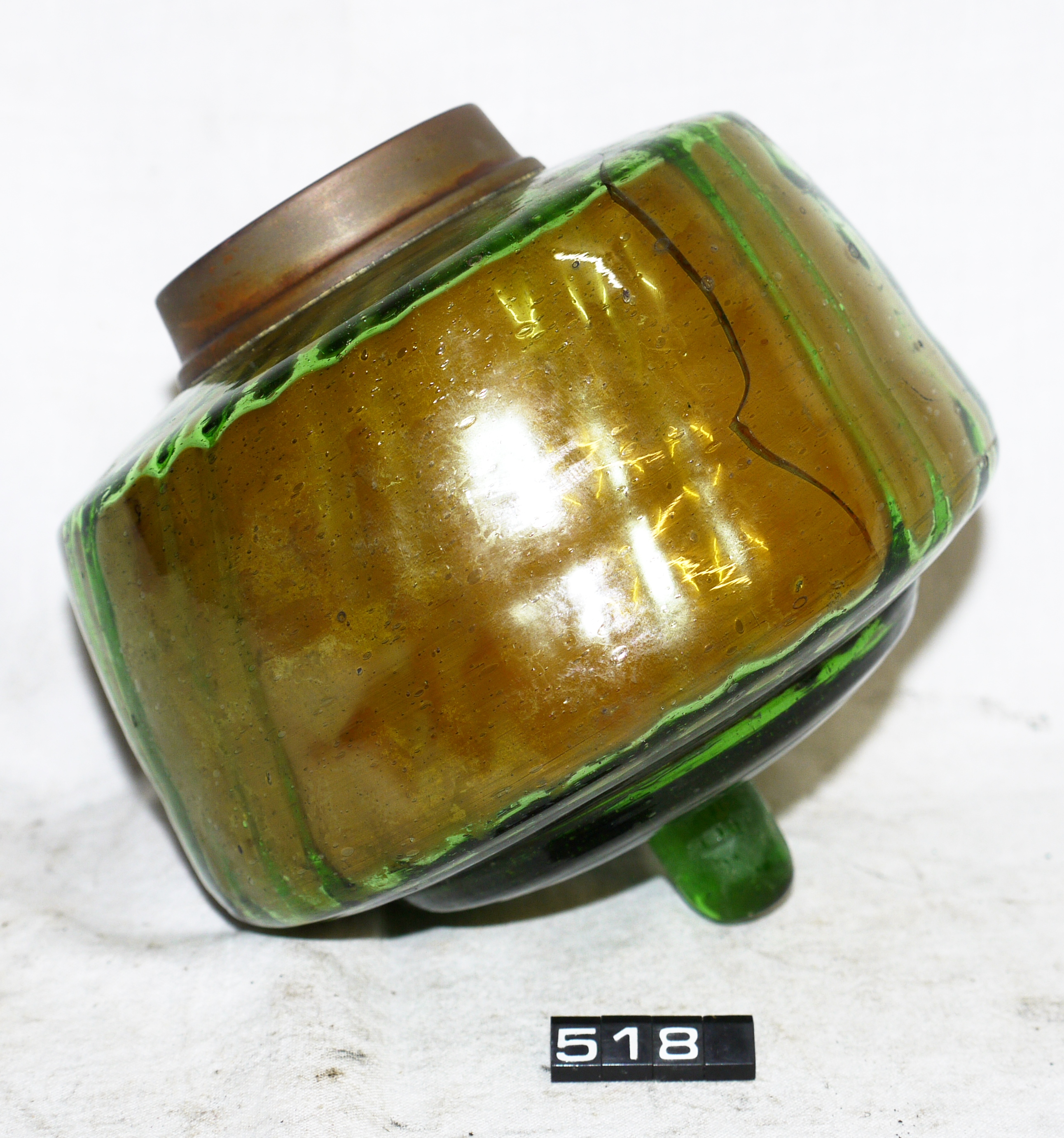 - DescriptionOil lamp fount; polished green glass fount with brass collar; hairline crack, has been lined internally with araldite for preservation; Norris collection.