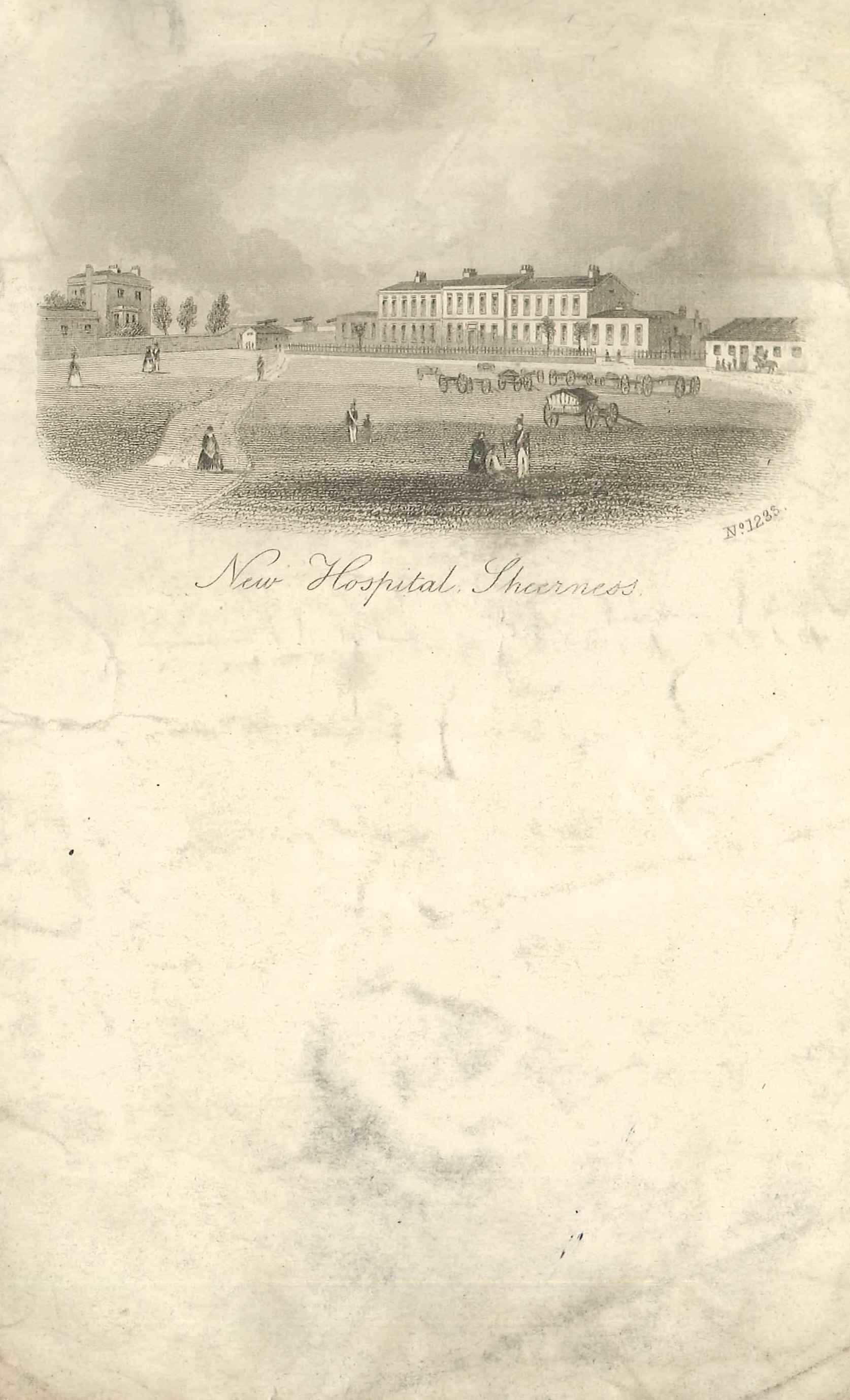 Engraved print of the (New) Hospital in Sheerness Dockyard, circa 1850; various pedestrians in the foreground, wheeled transport to the rear. No printer's name apparent; printed on folded paper, so intended as a notelet for short letters. Illustrated letterheads like this one were sent by visitors to the seaside, the Lake District, the Scottish Highlands and other British tourist attractions in the mid 19th century. They were precursors of the picture postcards which began to supplant them after the introduction of the half-penny post in 1870.