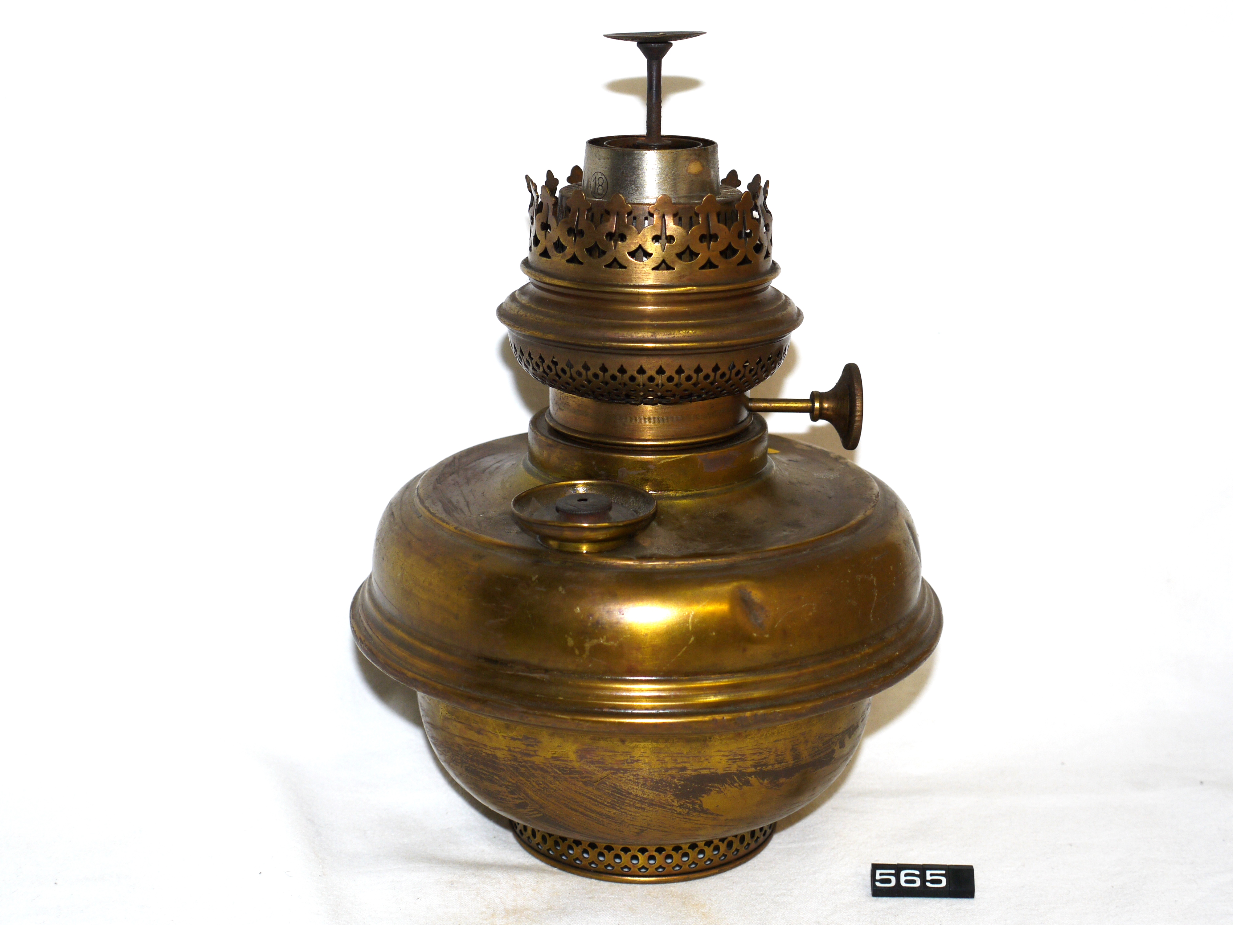 - DescriptionOil lamp fount; brass fount fitted with a globe Vulcan centre draught burner, no wick is present; threaded filler cap; this fount is for the cast iron stove in the CBB; Norris collection.