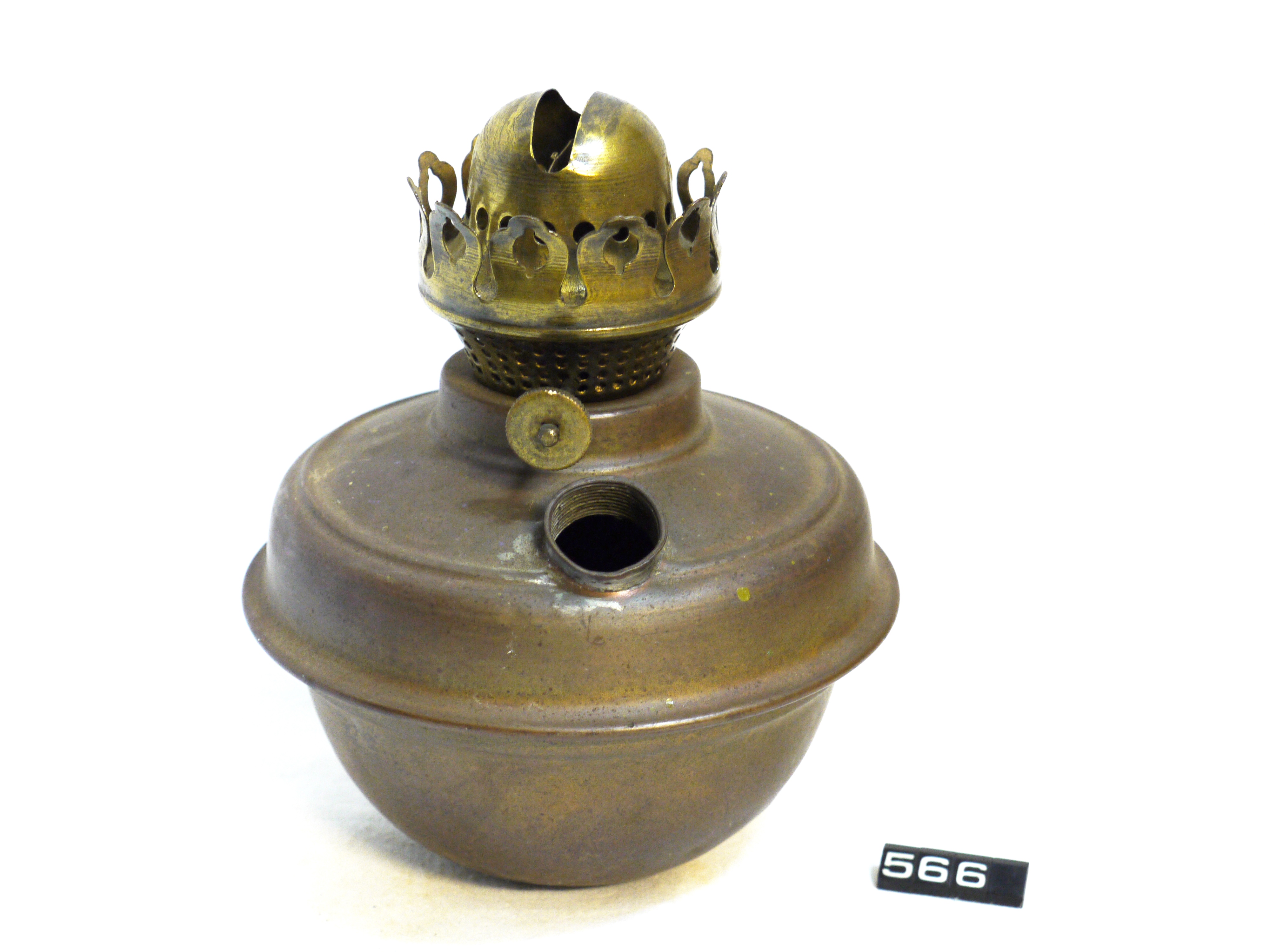 - DescriptionOil lamp fount; brass fount fitted with a 1" brass flat wick burner, no wick is present; filler cap is missing; this fount was originally fitted to a swing bracket mounting; Norris collection.