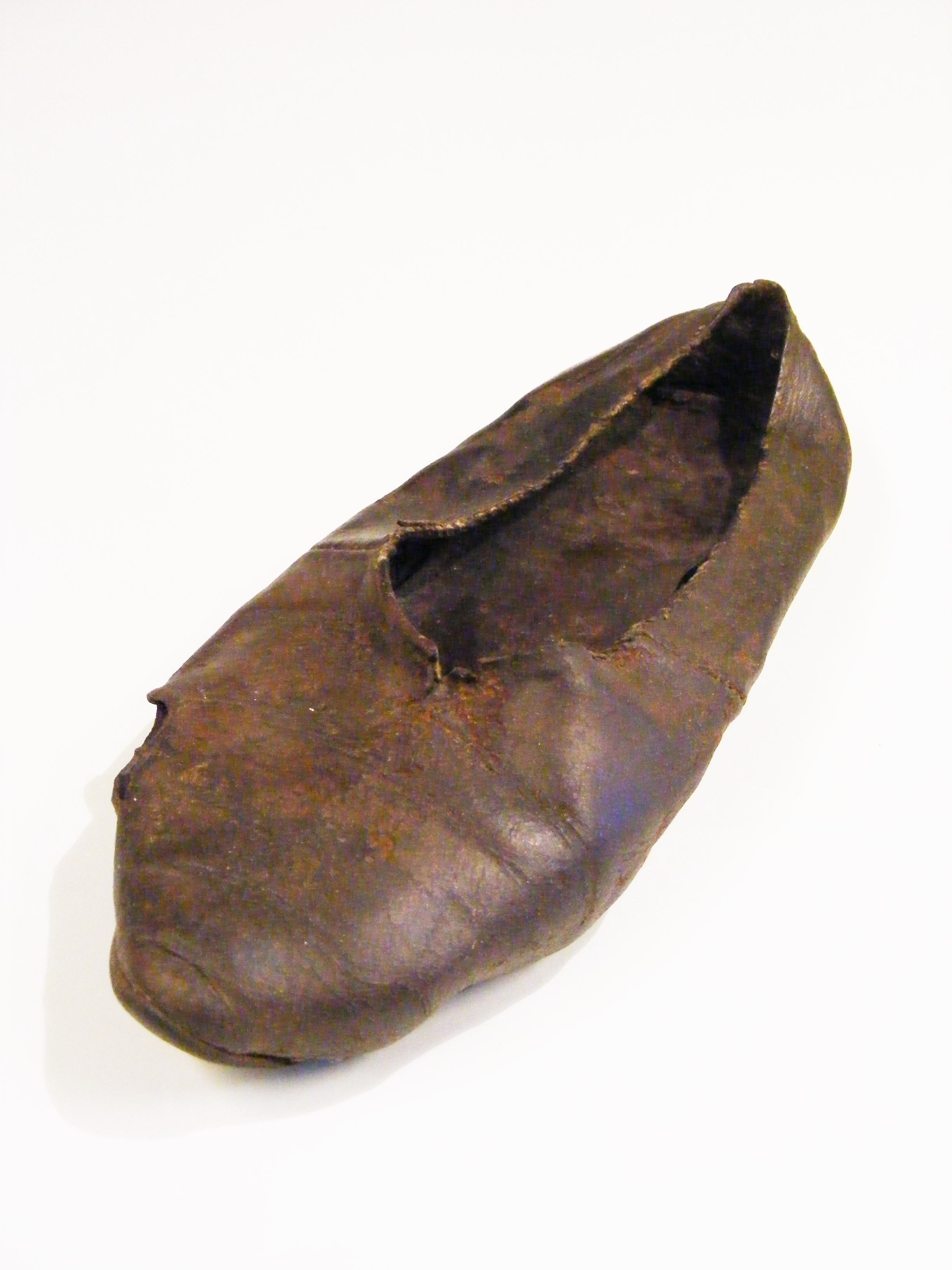 - DescriptionSmall shoe or slipper; right? shoe, brown leather; leather upper, sole and slightly built up heel; a 'slip-on' shoe with no laces; stitched throughout, traces of nails in the heel; quite worn; quite pointed toe. Found in the chimney breast of the old Vicarage, Upchurch, during demolition.