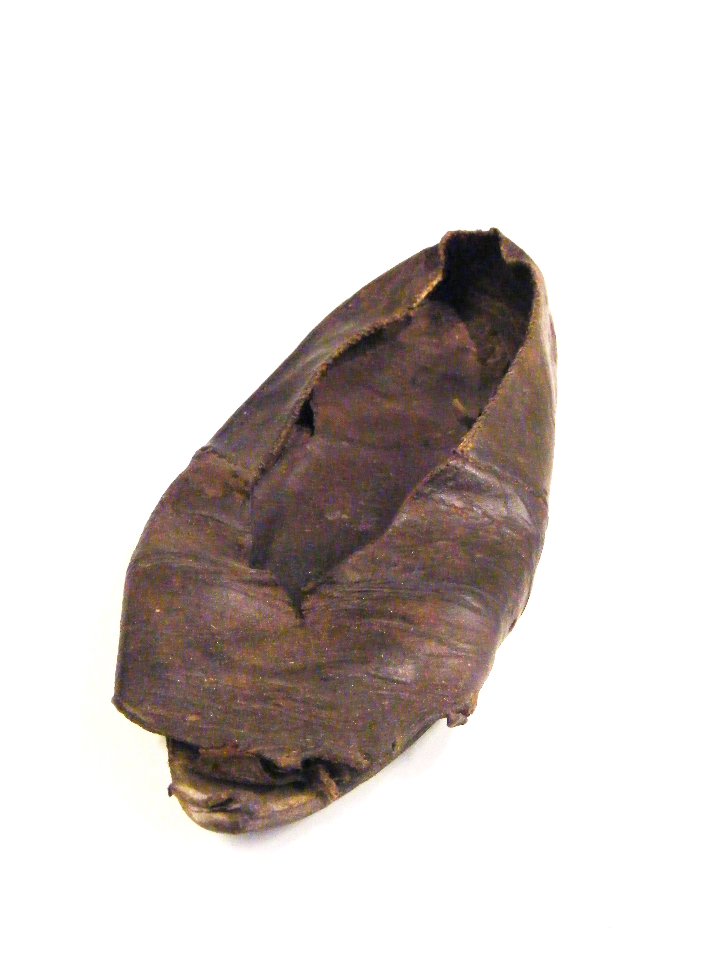 - DescriptionSmall shoe or slipper; right? shoe, brown leather; leather upper, sole and traces of a low heel; a 'slip-on' shoe with no laces; stitched throughout, quite worn, in particular the quite pointed toe. Found in the chimney breast of the old Vicarage, Upchurch, during demolition.