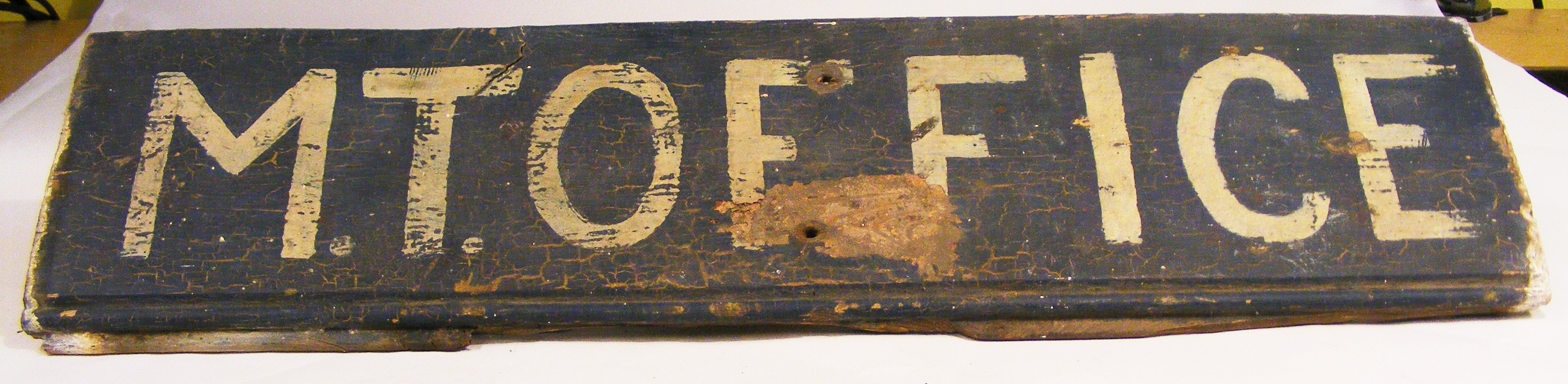 Simple, hand-painted sign from Grain Fort; marked 'M.T.OFFICE' (Motor Transport Office)