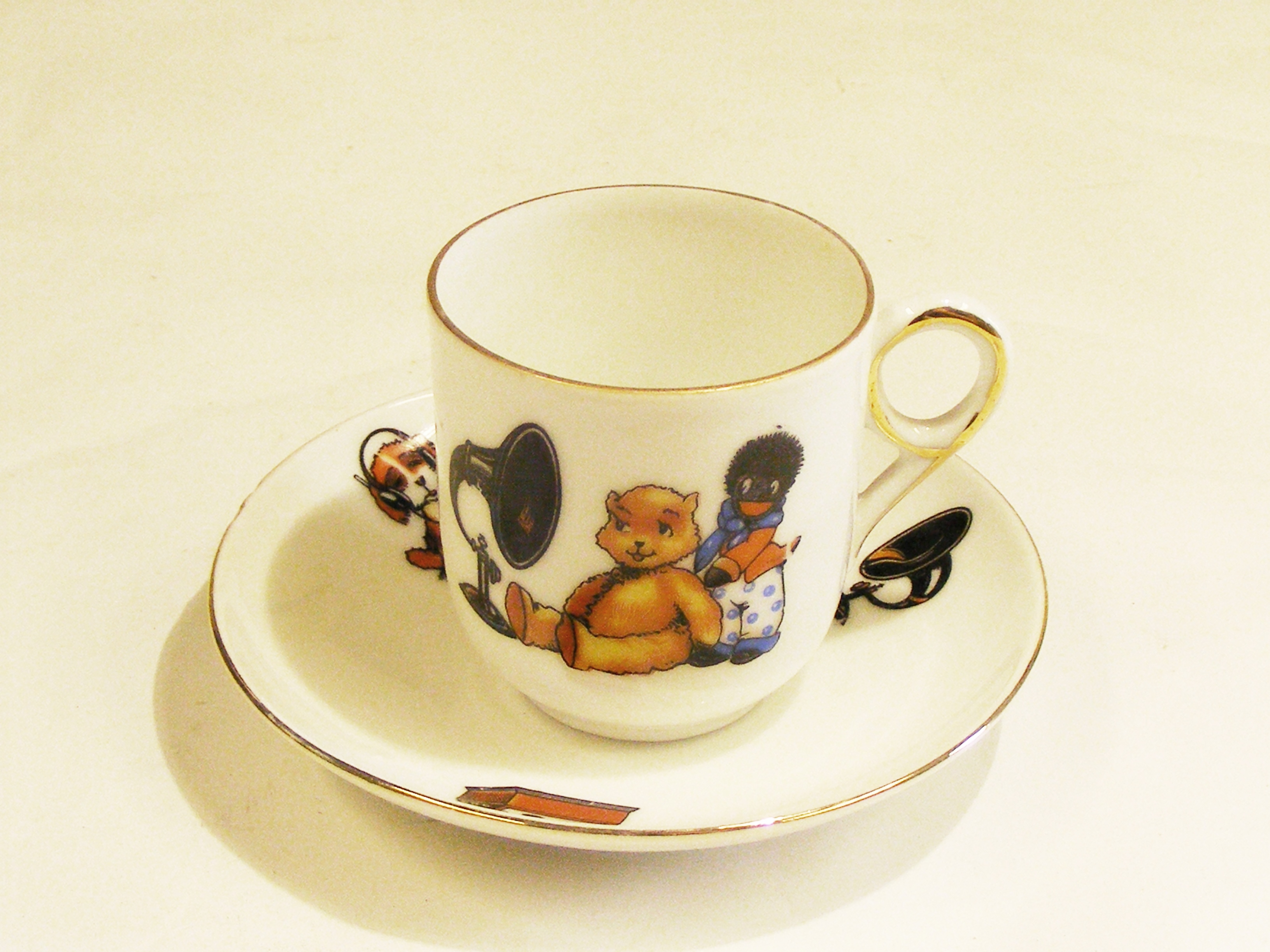 - DescriptionToy teacup & saucer; made by the Victoria Factory, Czechoslovakia; white ceramic with colour transfer image of a little girl & doll listening on a shortwave radio set; gold trim around rims & handle.