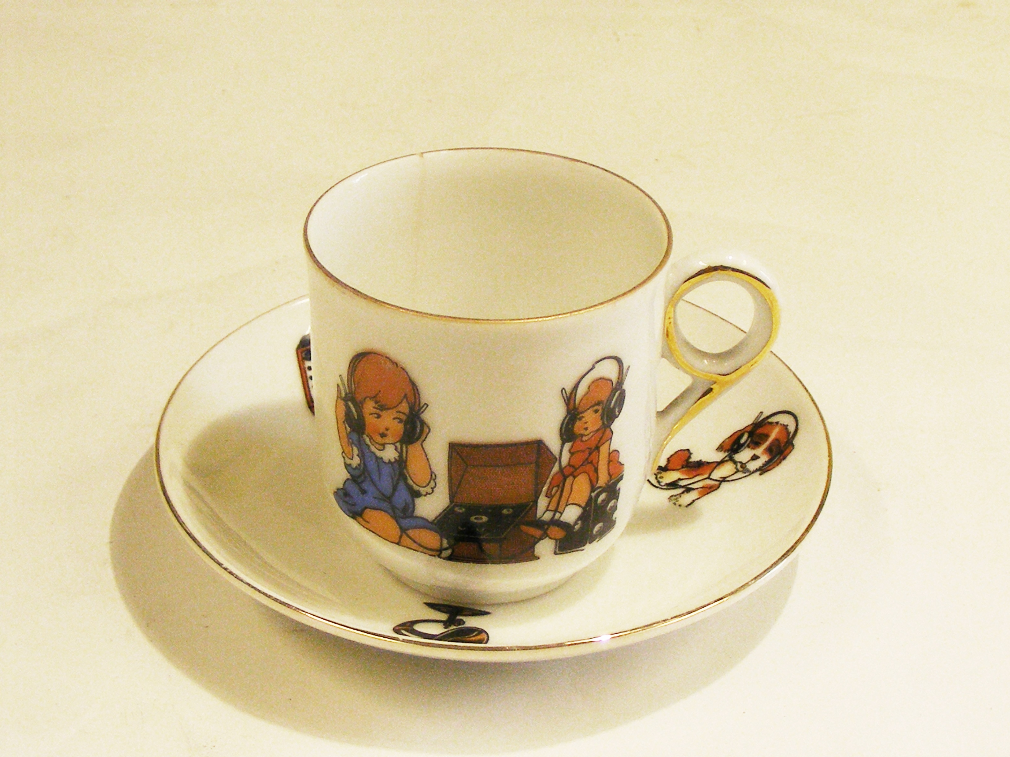 - DescriptionToy teacup & saucer; made by the Victoria Factory, Czechoslovakia; white ceramic with colour transfer image of a teddy bear & golliwog listening to a gramophone & a dog listening on a shortwave radio set; gold trim around rims & handle.