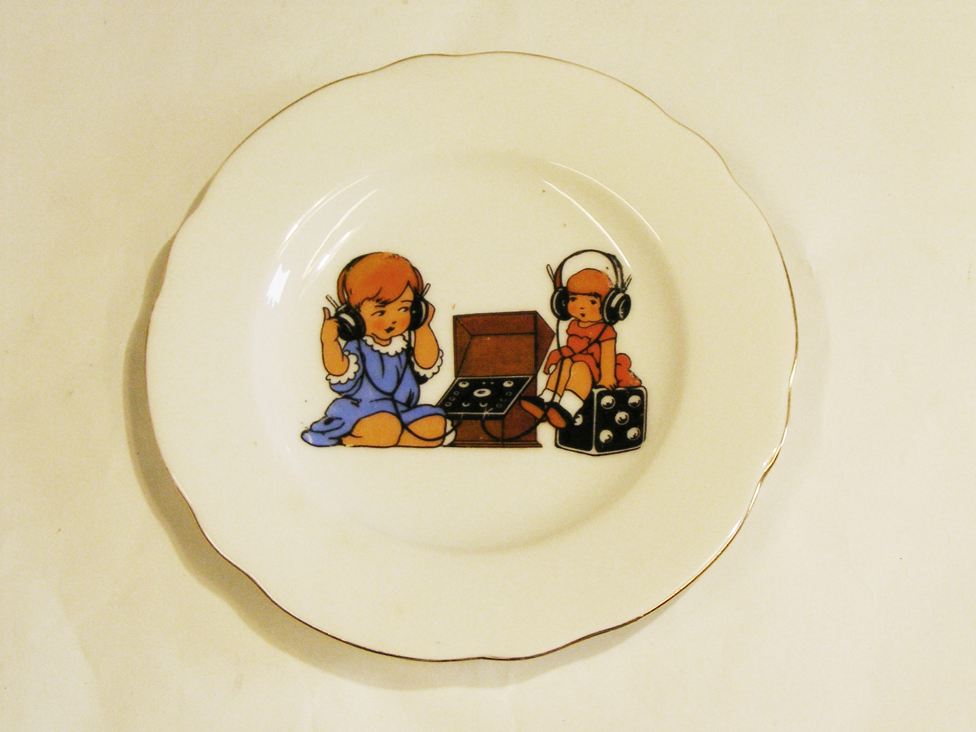 - DescriptionToy plate; made by the Victoria Factory, Czechoslovakia; white ceramic with colour transfer image of a little girl & doll listening on a shortwave radio set; gold trim around rim.